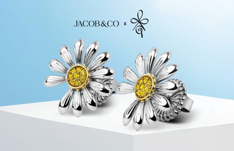 Jacob & Co. 联手 G DRAGON 推出全新 PEACEMINUSONE 雏菊耳环。招牌雏菊图腾重新演绎个人风格宣言。