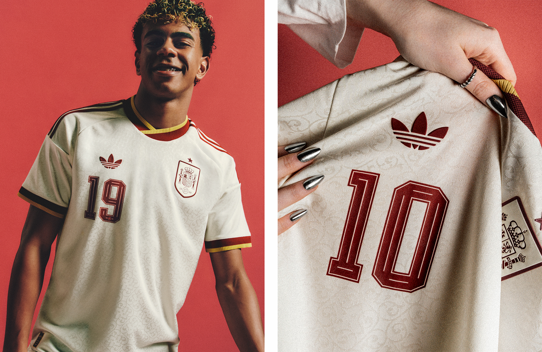 德国主场球衣重新诠释经典白色战袍,设计向历代冠军球衣致敬,并将经典菱形图案与胸前 V 字线条融入整体视觉之中,灵感亦呼应德国 2014 年登顶世界杯时的代表性设计。 西班牙主场球衣延续经典红色战袍,以红色基底搭配黄色直条纹,设计灵感源自西班牙国旗与国家队队徽,整体简约却热烈鲜明,后领印有「 España 」字样,呼应西班牙足球的荣耀与骄傲。