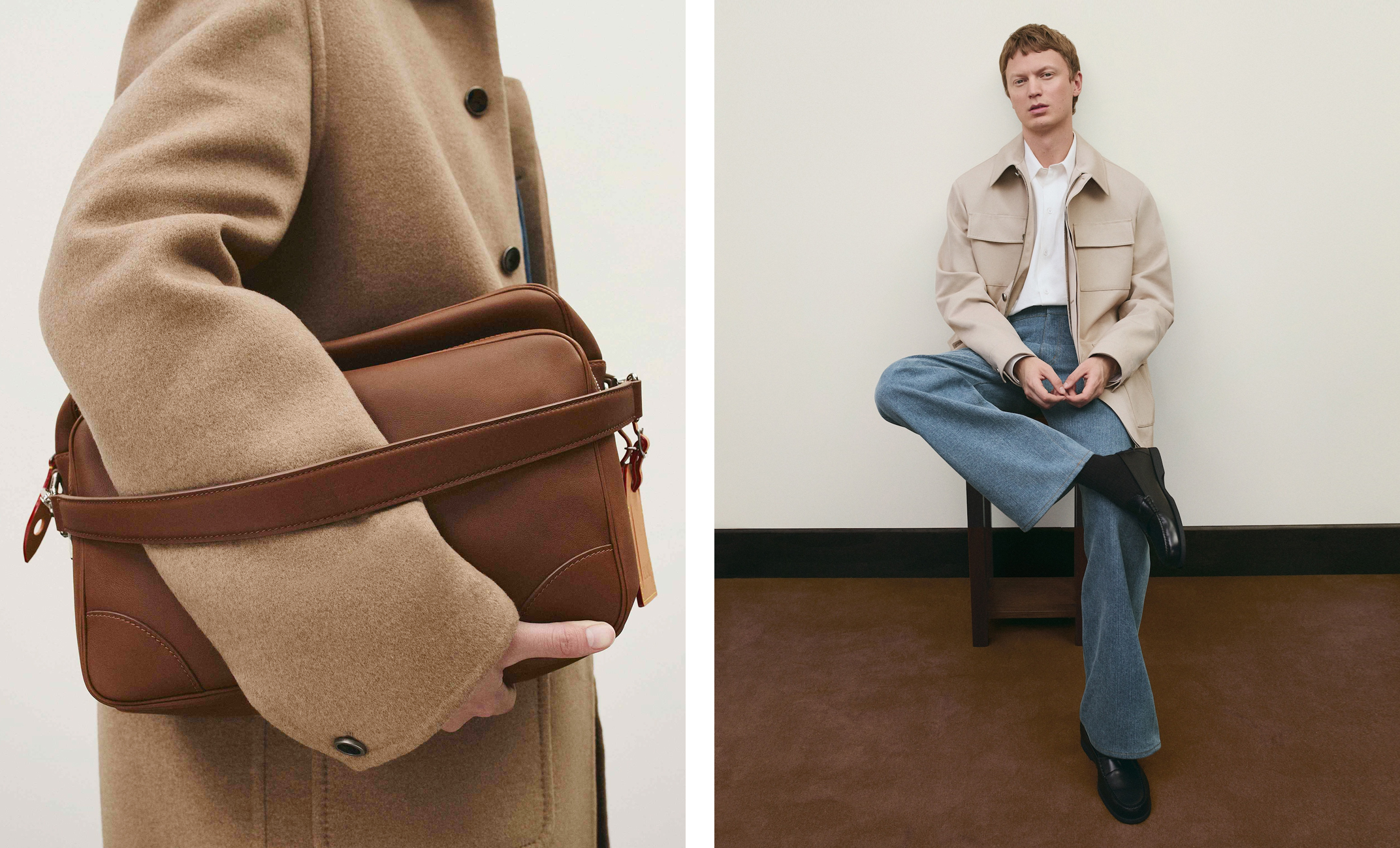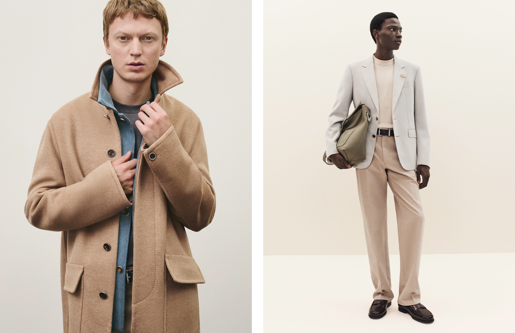 本系列色彩以米、藍、棕、黑等內斂自然色系為主軸,呈現低調而深邃的和諧美感。服裝設計在強調實穿機能的同時,更在材質研發上展現極致追求。透氣絲毛混紡帆布打造的西裝,在優雅廓形中保有絕佳耐用性;真絲羊絨混紡西裝則賦予穿者如雲朵般的輕盈體感,體現靜謐的高級感。此外,雙面羊毛羊絨混紡的外套採用無內襯工法,打破正裝束縛。百搭襯衫則選用柔軟的棉絲混紡 Chambray 或多條紋羊絨真絲斜紋布,為層次疊搭提供更多細膩可能。
