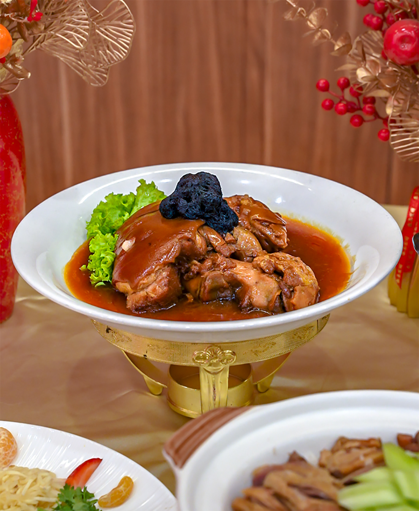 今年新春最受瞩目的新菜肴 —— 横财就手( 焖猪手)。象征着招财进宝、基业稳固、好运手到擒来。这道佳肴经过慢火精焖,不仅软糯入味、入口即化,更吸满了浓郁醇厚的秘制酱汁。 这道备受喜爱的经典名菜不仅是舌尖上的奢华享受,更蕴含着深厚的吉祥寓意:它象征着招财进宝、基业长青以及唾手可得的兴旺。