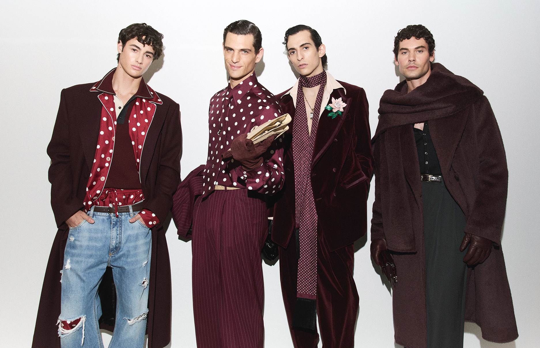 DOLCE & GABBANA 2026 秋冬男装系列《 The Portrait of Man 》以男性独特身份为核心,将伸展台化作活体肖像画廊。系列透过光影、材质与剪裁,捕捉每位男性的个性、情感与记忆,从深邃天鹅绒到雾面丝绸,每一件服装都是自我表达的工具。