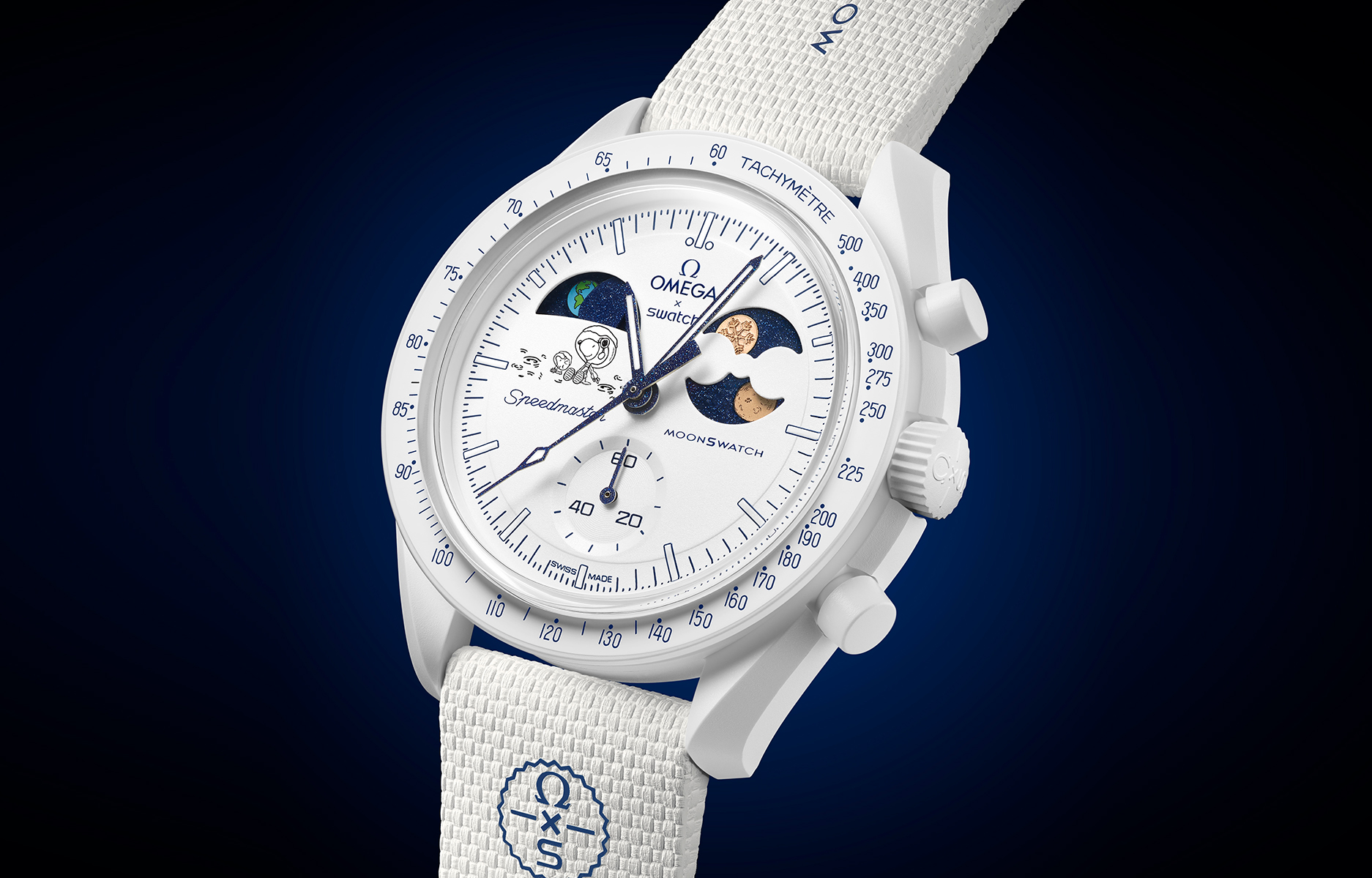 Swatch x OMEGA 全新「 Mission to Earthphase – Moonshine Gold Cold Moon」特别版以极地白取代典型的深蓝。 表盘直径 42 毫米, 以抢眼的白色 Bioceramic 錶壳、錶冠及按钮见称,搭配同色系白色橡胶錶带及 Velcro® 魔术贴式錶扣。