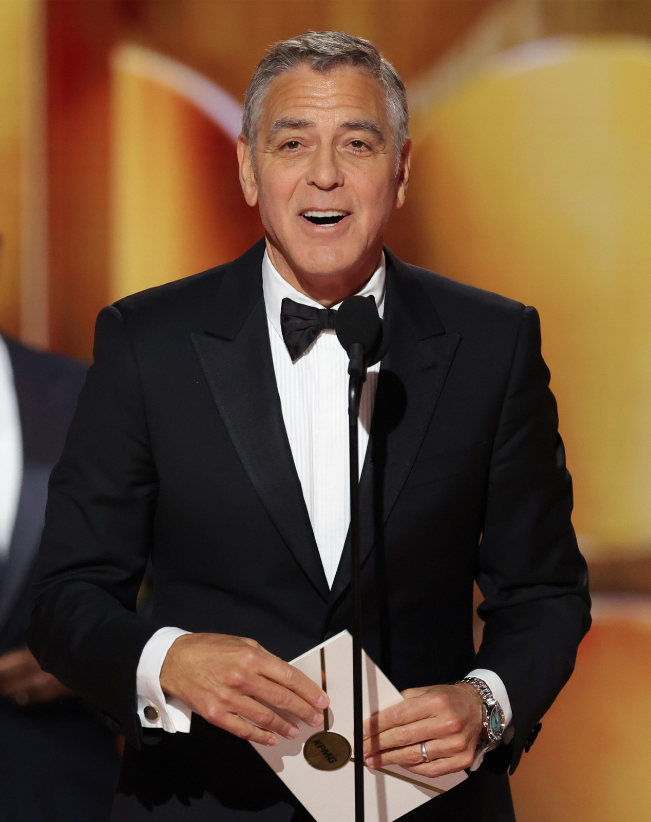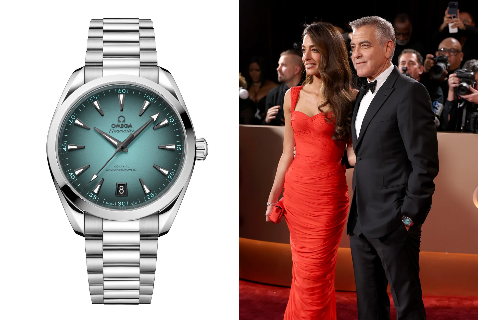 这次 George Clooney 以《 Jay Kelly 》入围音乐及喜剧类最佳男主角。他的红毯造型是黑色西装、白色衬衫搭配黑色领结, 标准的绅士模样,手上的腕錶则是 OMEGA 海马 Aqua Terra 系列 41 毫米腕錶,不锈钢錶壳搭配绿松石色渐层錶盘,撑住男神气场,不让娇妻比下去。