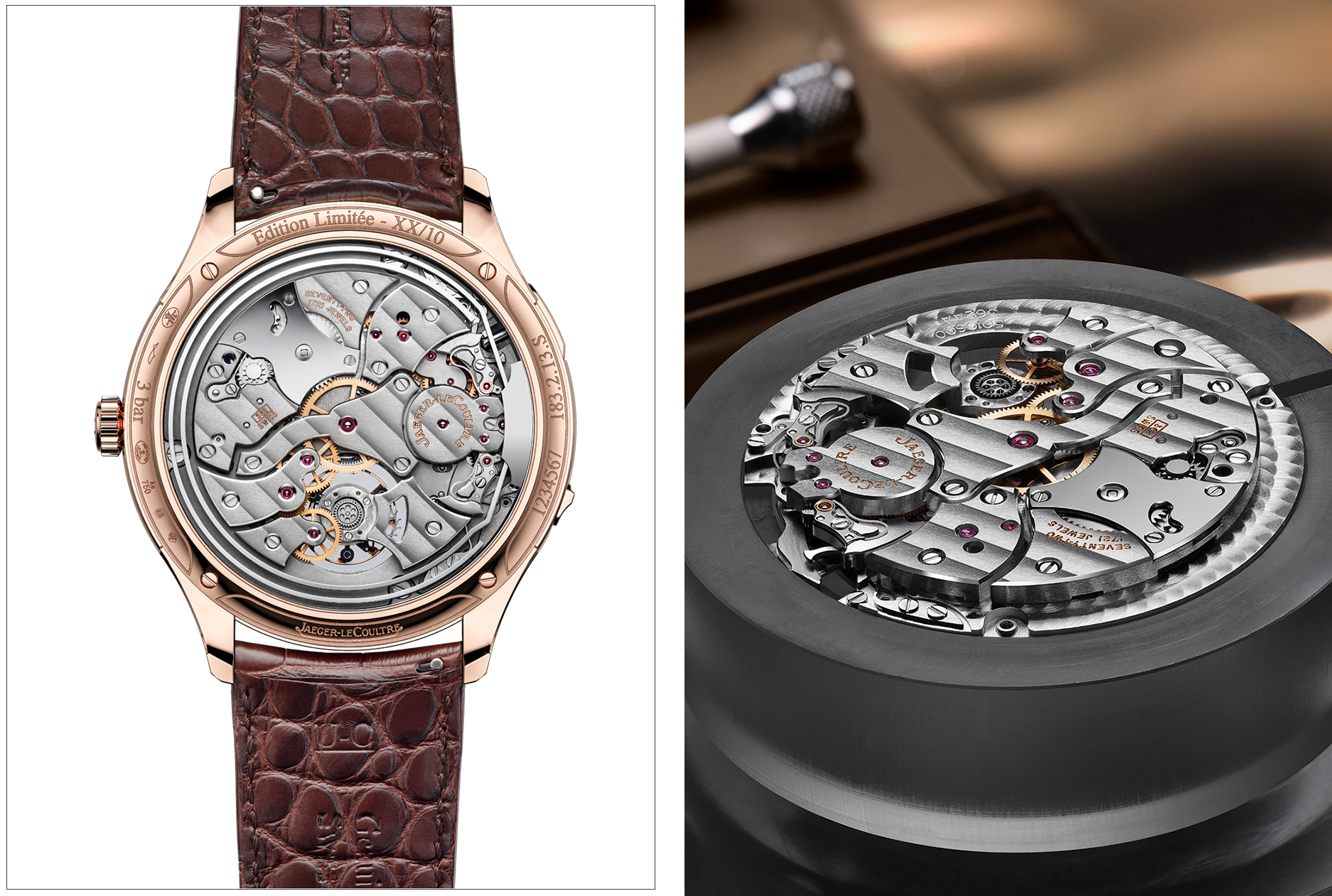 但真正让人停下来看的,是它的视觉呈现,机芯不再只是结构,而是一件雕塑。扭索饰纹、蓝色半透明珐琅、漆艺处理直接延伸到桥板与发条盒,搭配 16 种修饰工艺与长达 65 小时的手工倒角,这种做法其实很「积家」,把理性做到极致,再用艺术把它包起来。