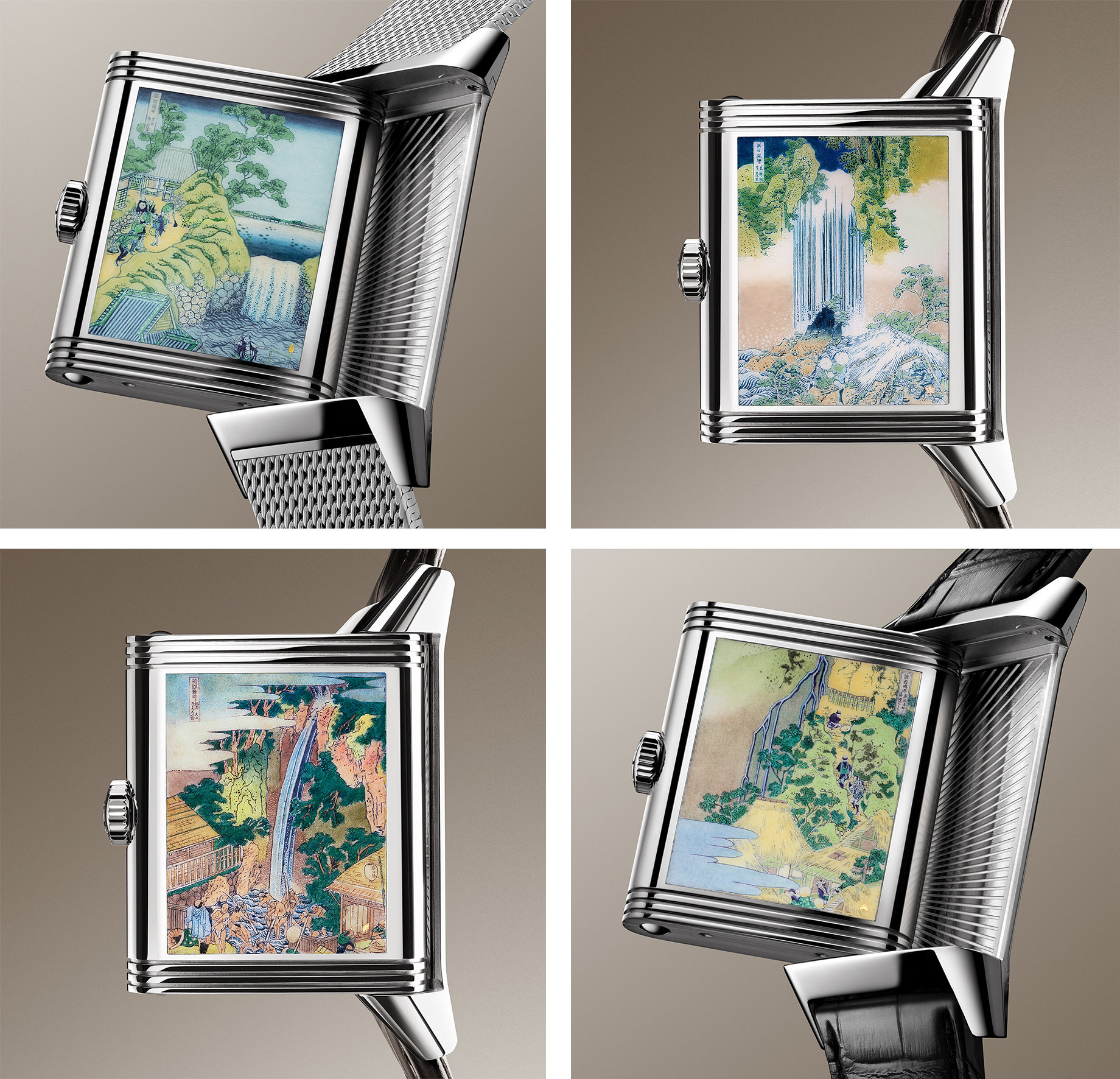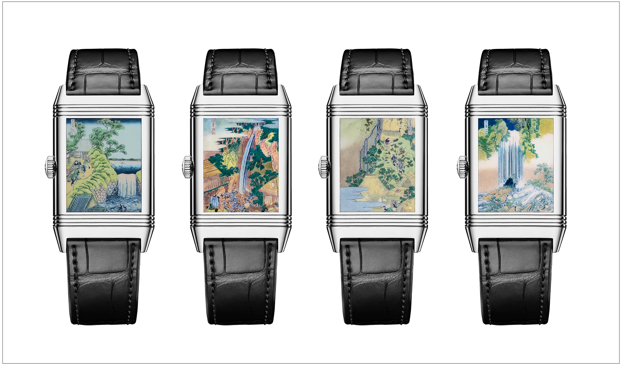 延续多年致敬 Katsushika Hokusai 的计画, 2026 年推出的 Reverso Tribute Enamel 系列,将为这段创作画下句点。 四款手錶重现《 诸国瀑布揽胜 》最后四幅作品,全部采用手工微绘大明火珐琅完成,在只有约两平方厘米的錶背上,工匠需要叠加至少 14 层珐琅,耗时约 80 小时,还要精准重现色彩与笔触,最惊人的是,连原作的细小题款都透过显微镜重现,这已经不只是制錶,而是一种极端微缩艺术。手錶正面搭配不同颜色与纹理的扭索饰纹珐琅面盘,让手錶在翻转前后呈现两种完全不同的性格。