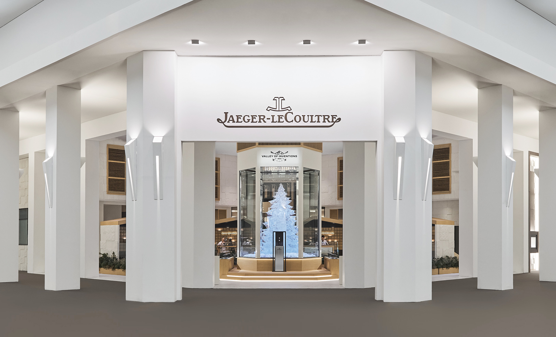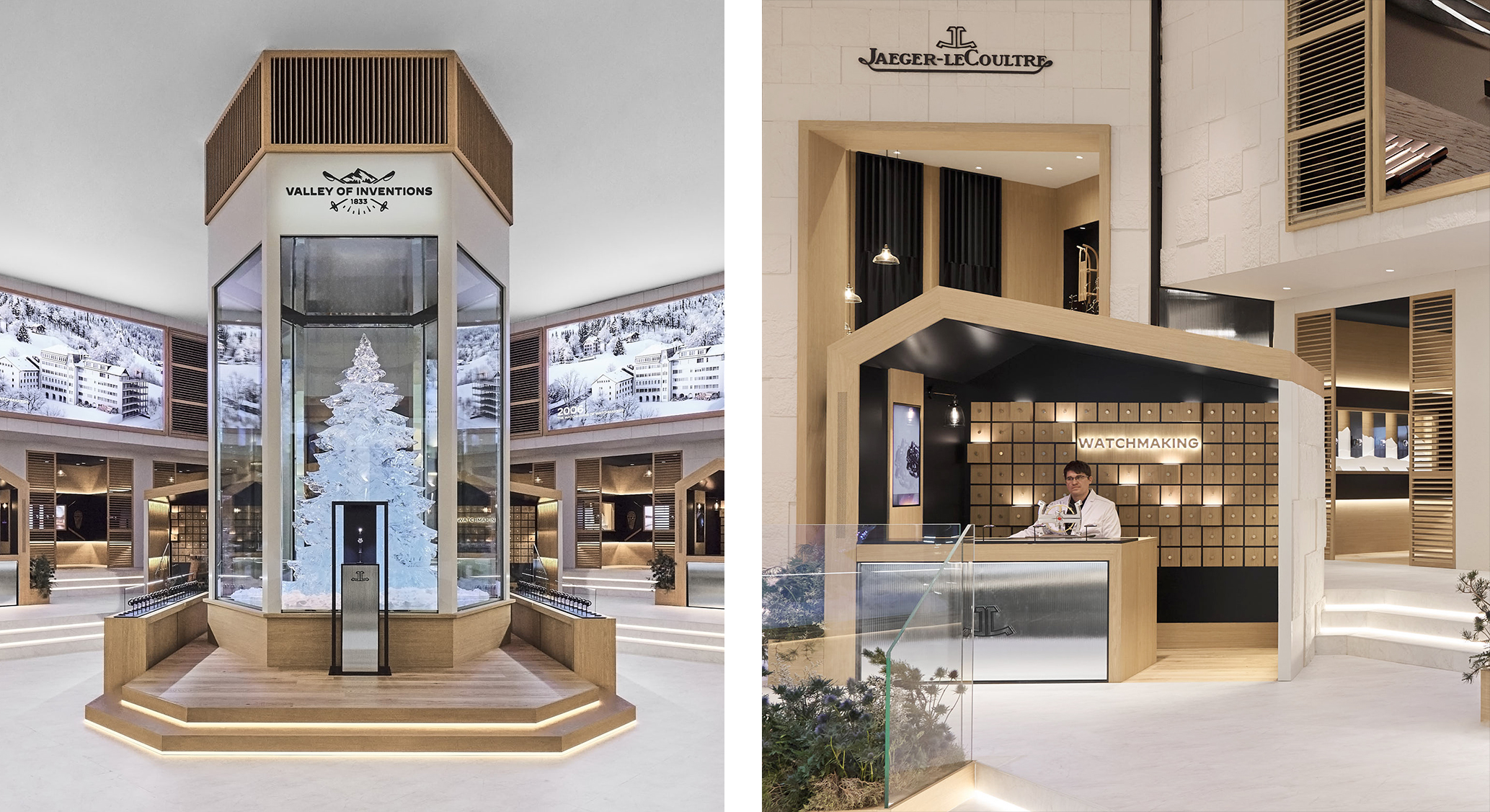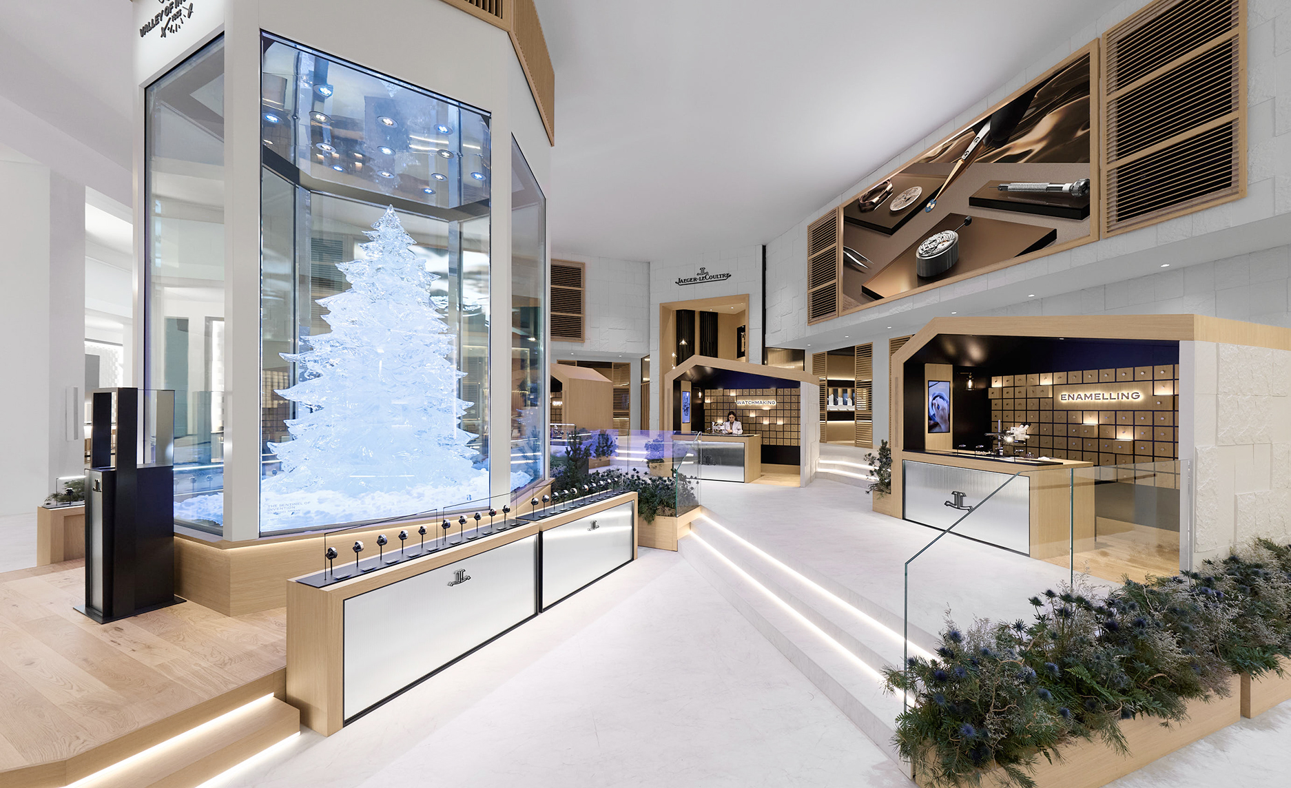 今年 Jaeger-LeCoultre 展区那棵将近四米高的冰雕松树,其实就是最直白的隐喻,强调冷冽与温暖并存、