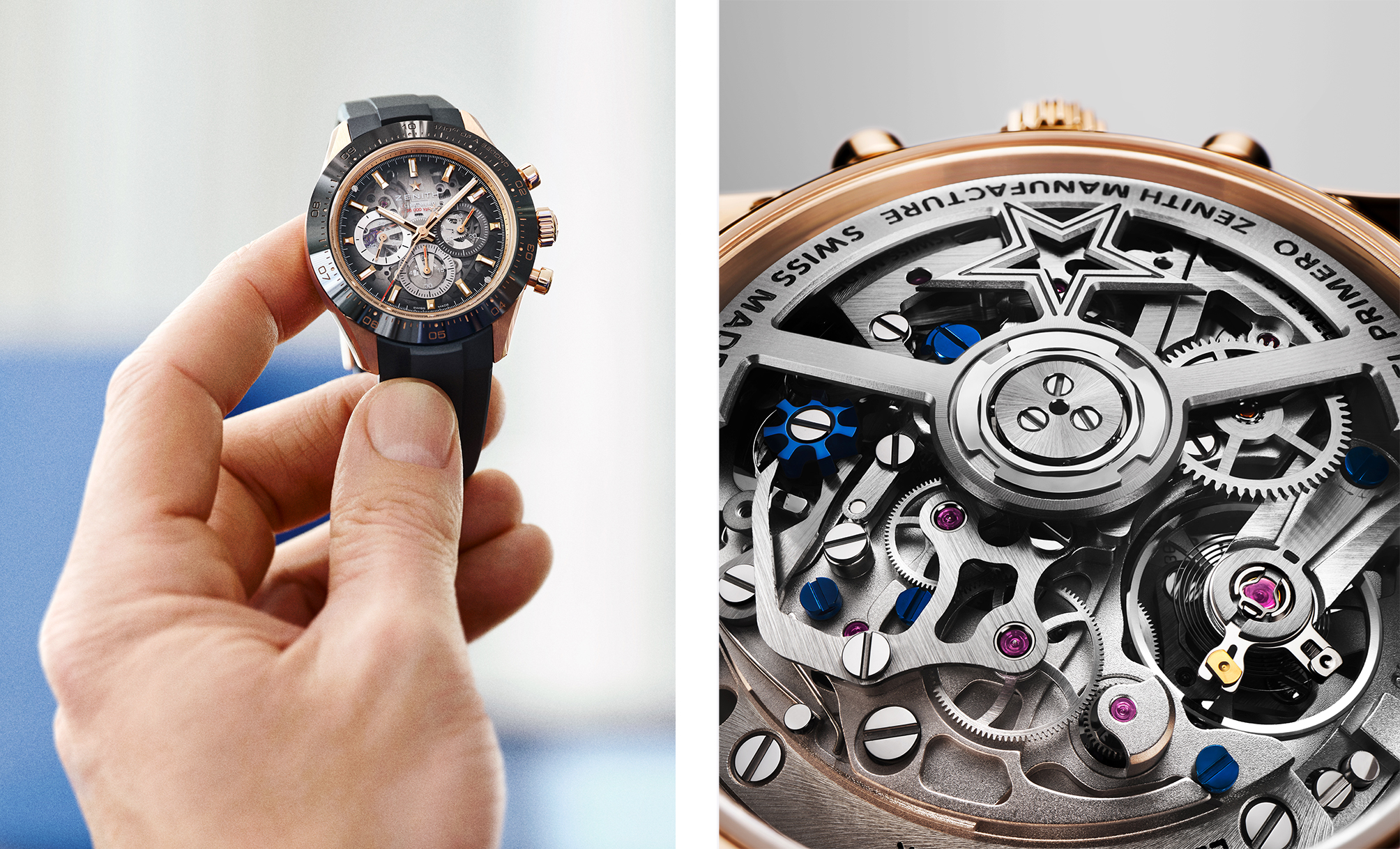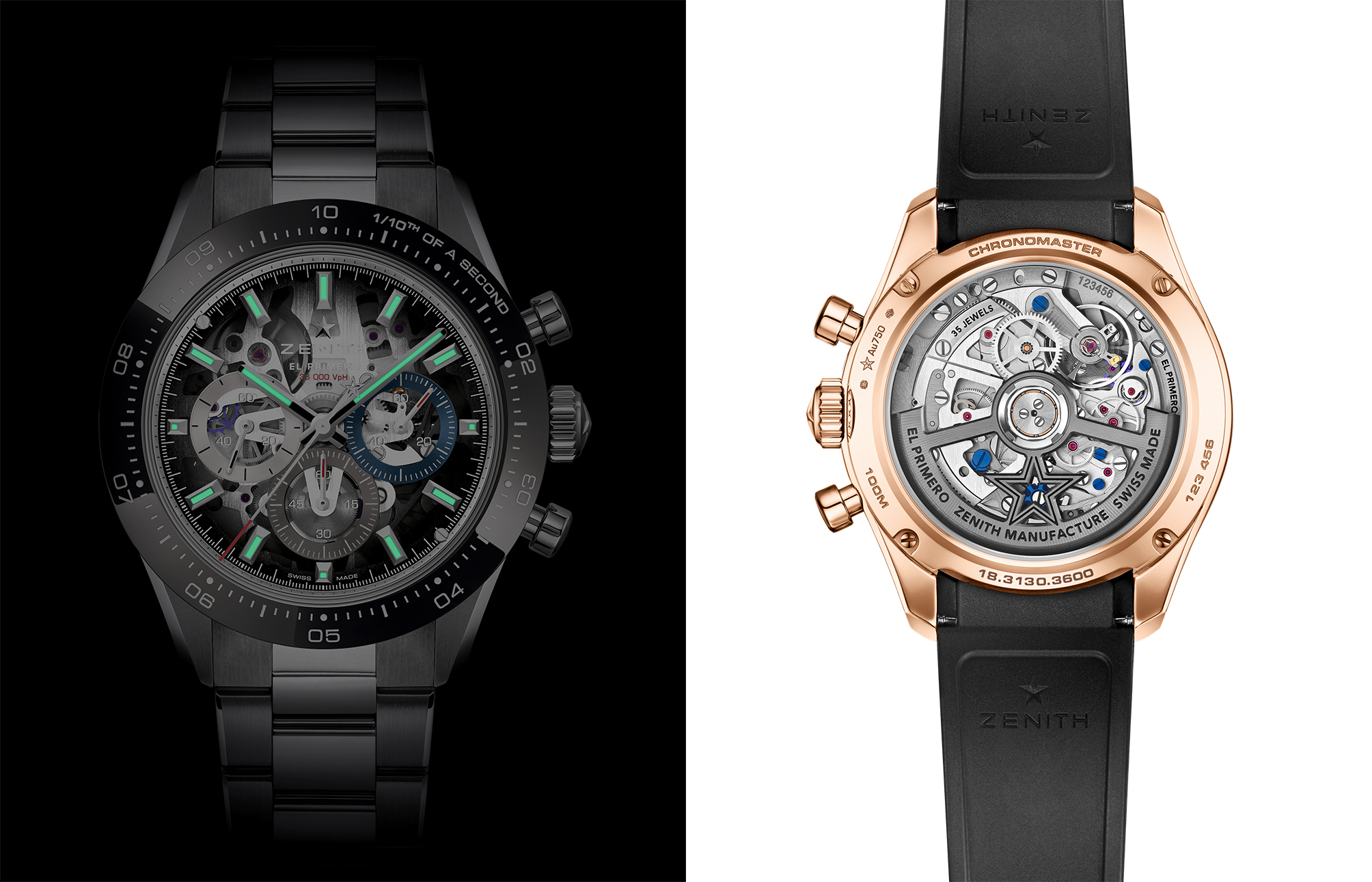 新作搭载 El Primero 3600SK 自动机芯,机芯经过镂空处理,结构复杂通透。