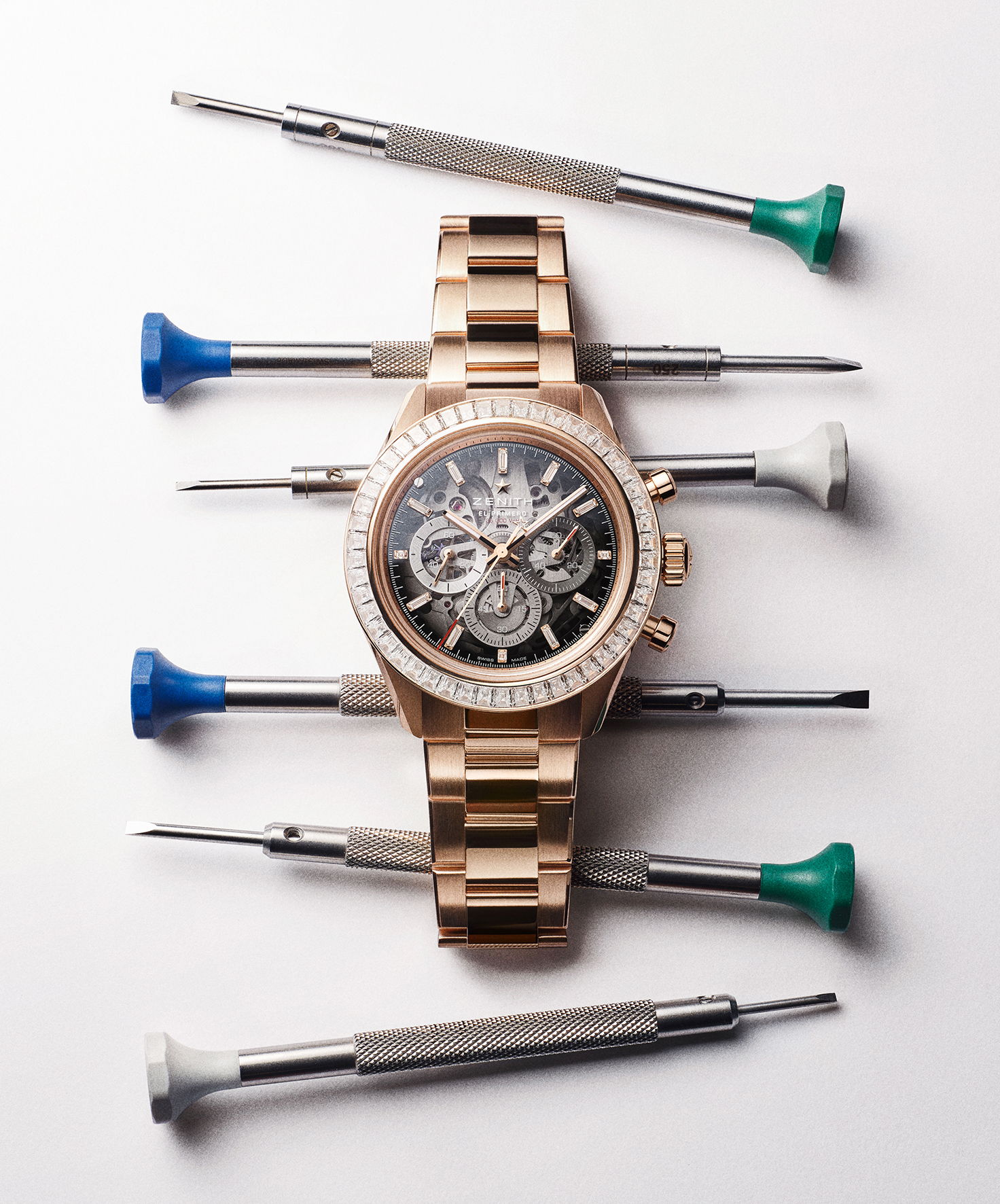 而整系列最耀眼的明珠,莫过于全球仅限量 10 枚的玫瑰金旗舰之作,其錶圈镶嵌了 50 颗长方形阶梯式切割钻石,总重约 5 克拉,将高振频的硬核技术与高级珠宝的极致华丽完美融合。从力洛克( Le Locle )的制錶工坊到全球錶迷的腕间,真力时再次用 Chronomaster Sport 镂空腕錶证明,真正的经典从不畏惧时间的检视,而是在每一次震荡中,持续定义未来的精准。
