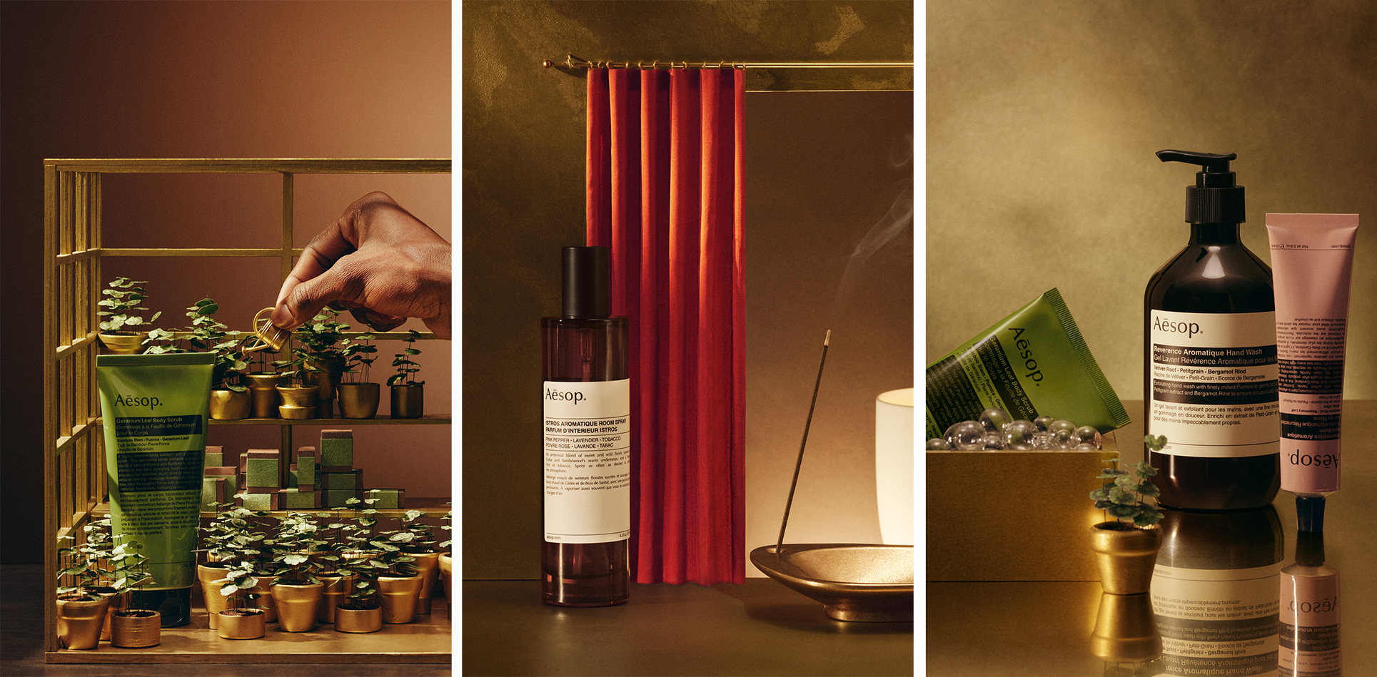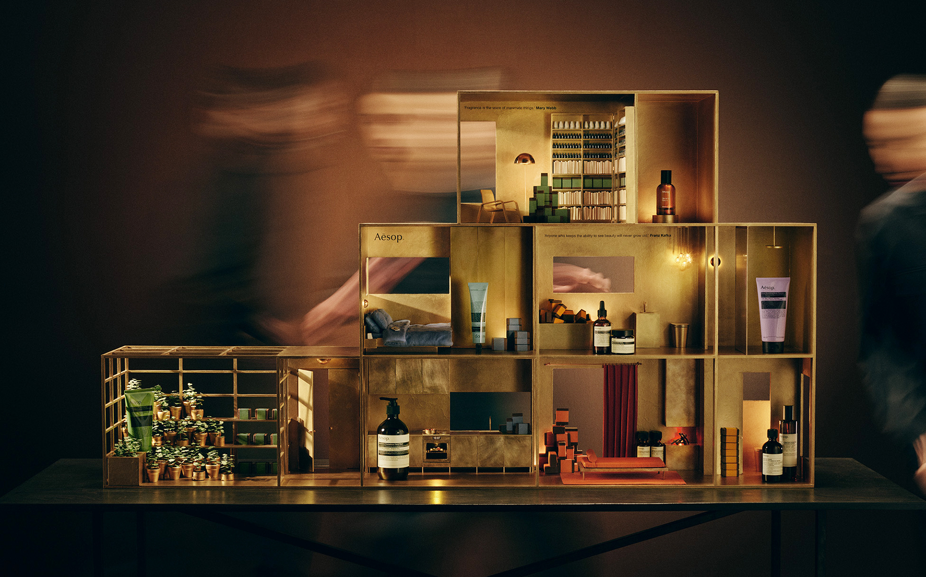 这座迷你屋使用了大量黄铜材质——温暖、富有质感,也是 Aesop 品牌的特色元素。随时间氧化的黄铜,像肌肤般留下岁月痕迹,独特又迷人。影片中的小屋世界还被放大搬到 Aesop 店舖橱窗中:巨大的双手和产品向路人招手,甚至连黄铜马桶也放大呈现,保留手感痕迹,趣味十足。这种巧妙的比例错置,彷彿在提醒我们, Aesop 的香氛能让日常生活充满奇幻与惊喜。