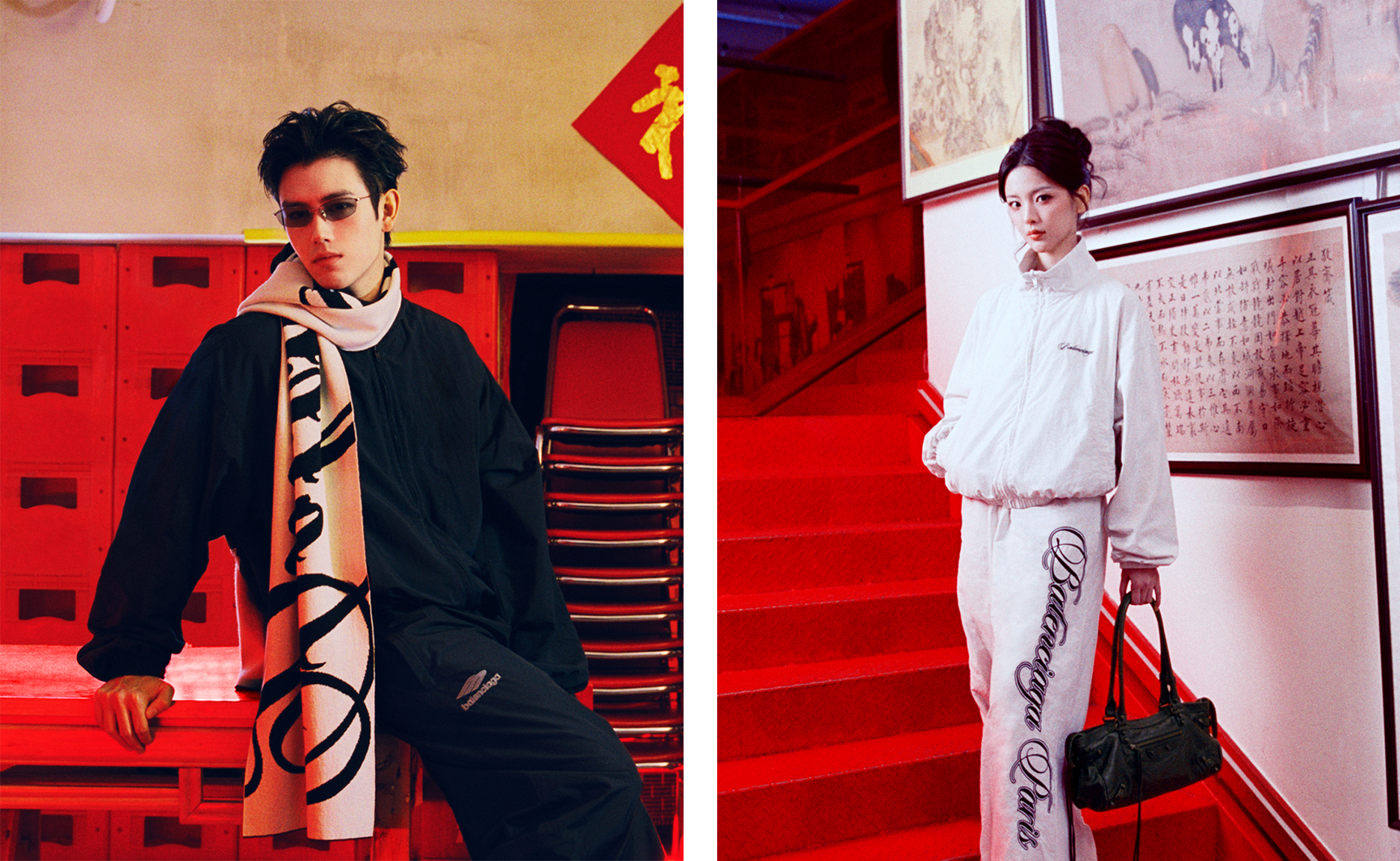 BALENCIAGA 这次新春成衣系列非常实穿,从运动套装、 T-Shirt、连帽衫、围巾及全新 Arena 皮革包款,搭配超大手写体印花与刺绣标识,细节呼应节日氛围。经典鞋履 Hamptons 与 Track 以全新配色亮相,红色水钻爱心与幸运马蹄铁包饰,更为造型注入春节开运巧思,展现传统与潮流的趣味交融。