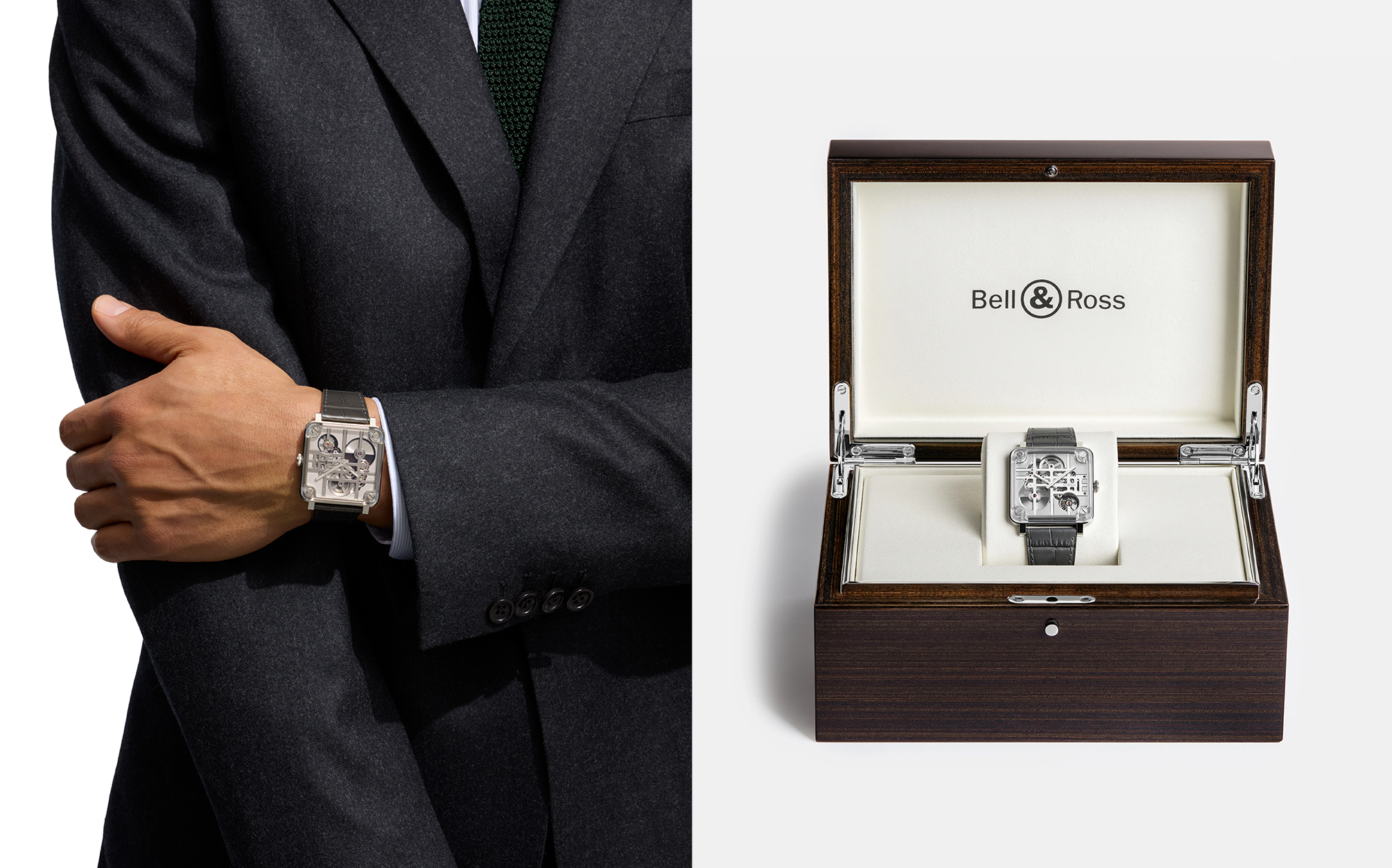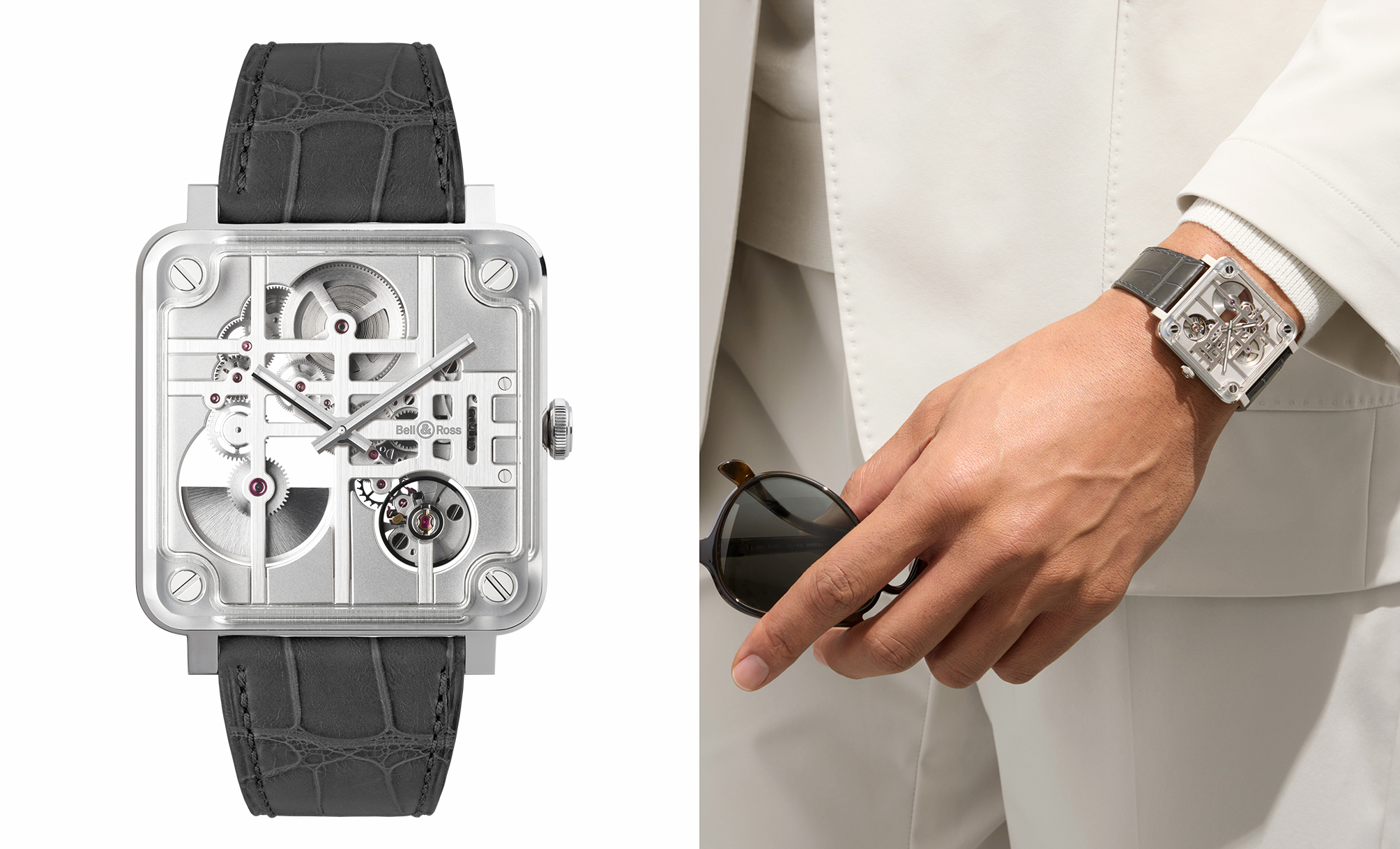 以飞行专业仪表板为灵感转译成为手表设计语彙的 BELL & ROSS   ,先后曾在 2006 年发表 BR-03、 2022 年推出旗舰系列的 BR-X5,以及 2025 年运用方形自制机芯的 BR-X3 Tourbillon Micro-Rotor 腕表, 本次则加码为新款的 BR-X3 Micro Rotor 微型自动盘腕表,定位介于旗舰高价位与经典入门之间的中价位,硬派、都会风格鲜明。 新款 BR-X3 Micro Rotor 腕表选择破除了表壳与机芯间的藩篱,以表壳的中间表环用以支撑夹板,加上钢质底板与蓝宝石镜面,构建出 BR-X3 Micro Rotor 的时光小宇宙。