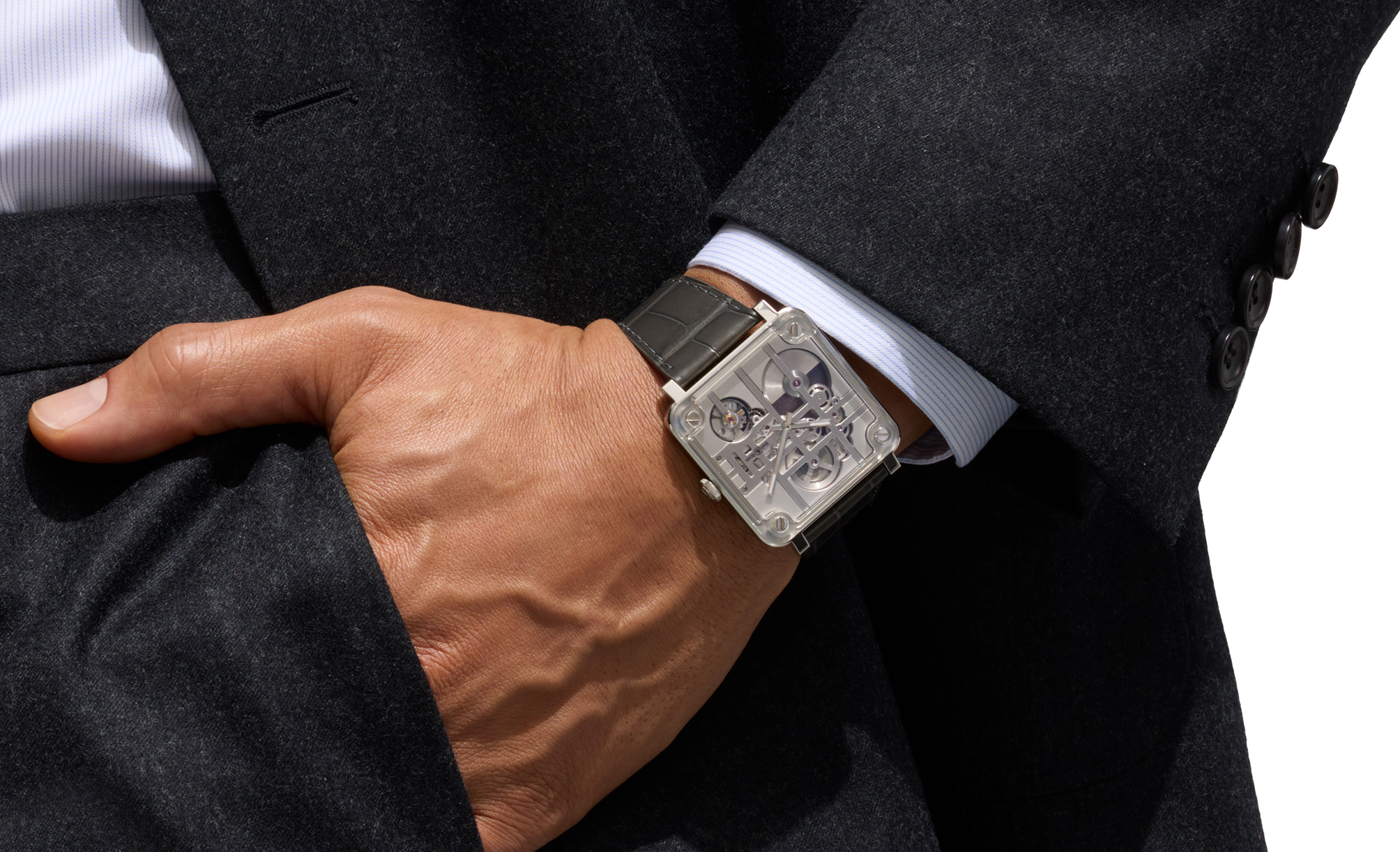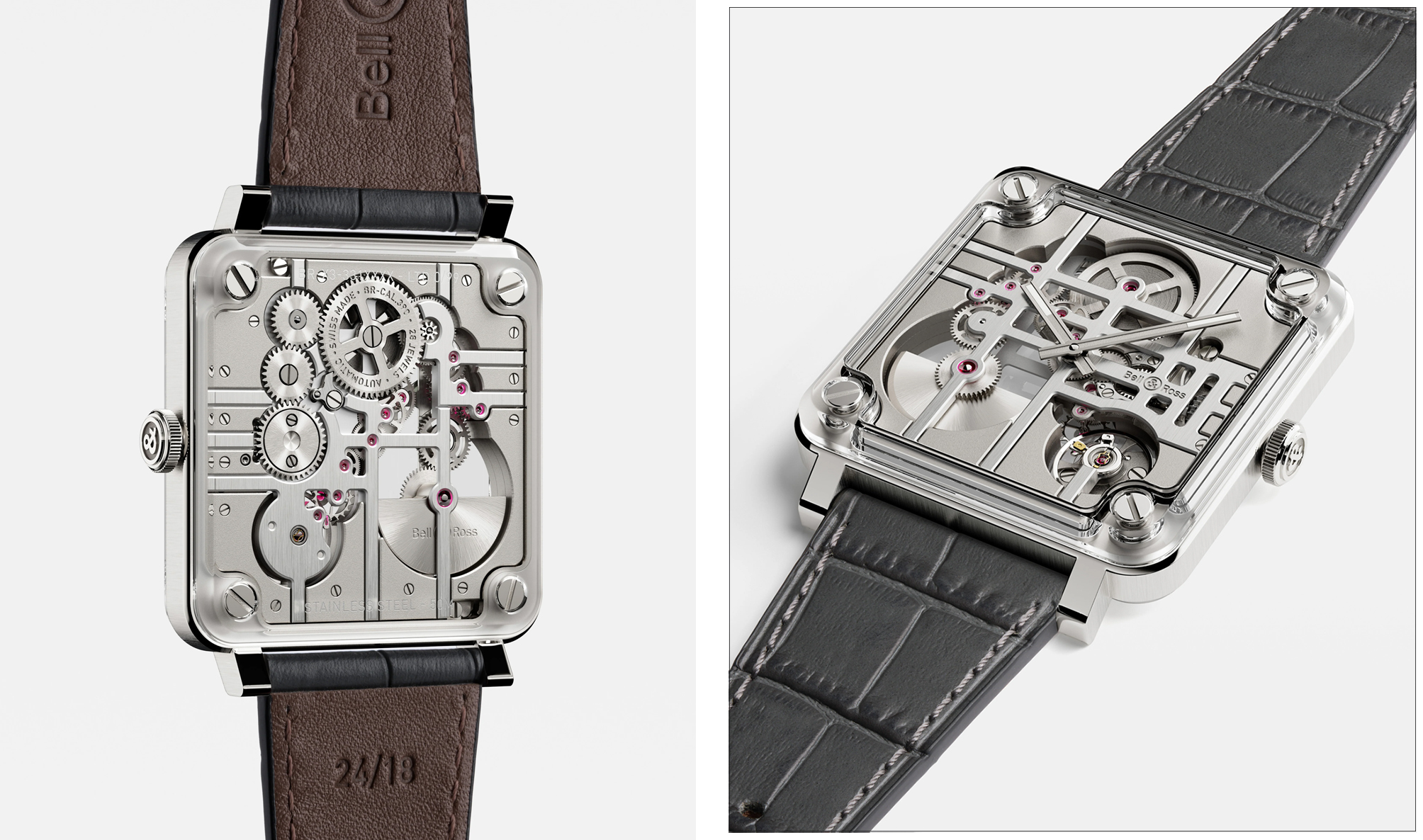 而机芯方面, BR-X3 搭载 BR-CAL.390 自动上鍊机芯,为了维持 9mm 纤薄錶身,品牌放弃传统中央自动盘,改以微型自动盘( Micro-Rotor )设计,巧妙融入同一平面,兼顾 48 小时动力储存与上鍊效率,同时降低整体厚度, 此外 50 米防水性能也让这款极致通透手錶兼具日常佩戴的实用性。 从美学角度看,BR-X3 的半镂空机芯不只是简单剔除材料,而是精心规划的建筑结构,金属夹板以水平与垂直线条交错形成栅格视觉效果,现代感十足。
