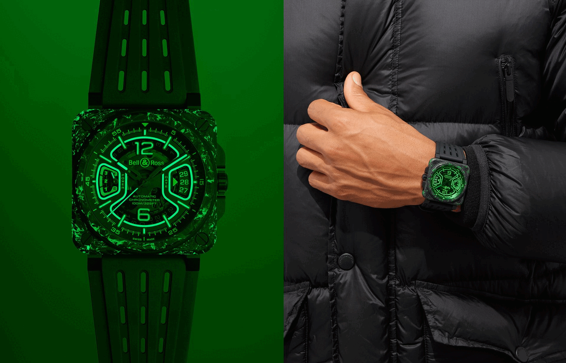 看似绿、黑交织的 BR-X3 Night Vision 腕表的表壳上下层实由黑色碳纤维与SLN树脂复合材料所制造,在灰黑中形成如迷彩般的不规则绿色纹理,白天看充满野性魅力, 在暗黑中绽放绿光的视觉效果更是叫人一见难忘。 而表壳中层则为经黑色 PVD 涂层的钛金属,角落并由包覆以绿色橡胶的四颗螺丝贯穿; 41 乘 41 毫米的开放式面盘上, 三点钟与九点钟方向左右对称的旋转视窗模拟了如飞行仪表板上常见的转盘式仪器,并分别但来日期与三日动力储存的显示。加上绿色蓝宝石水晶錶镜,使之绿上加绿,灵感来自飞机或战机抬头显示系统。