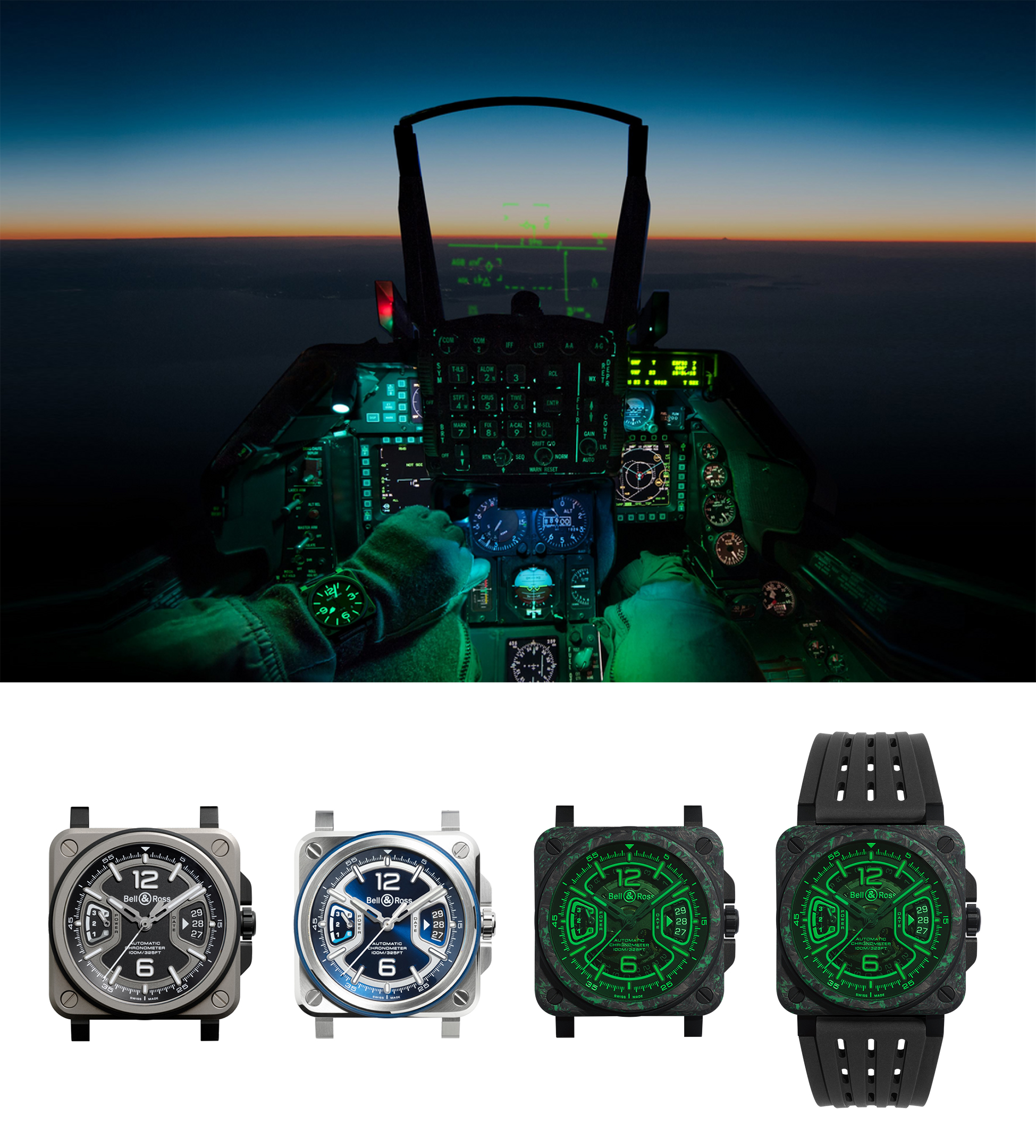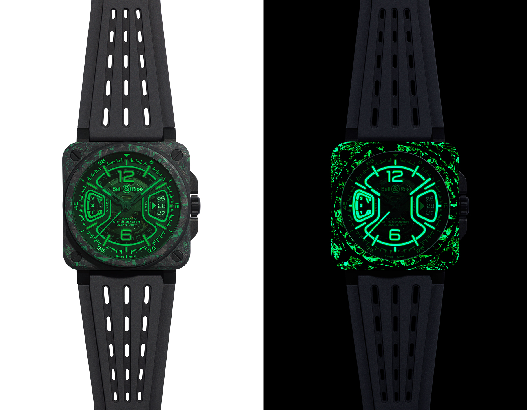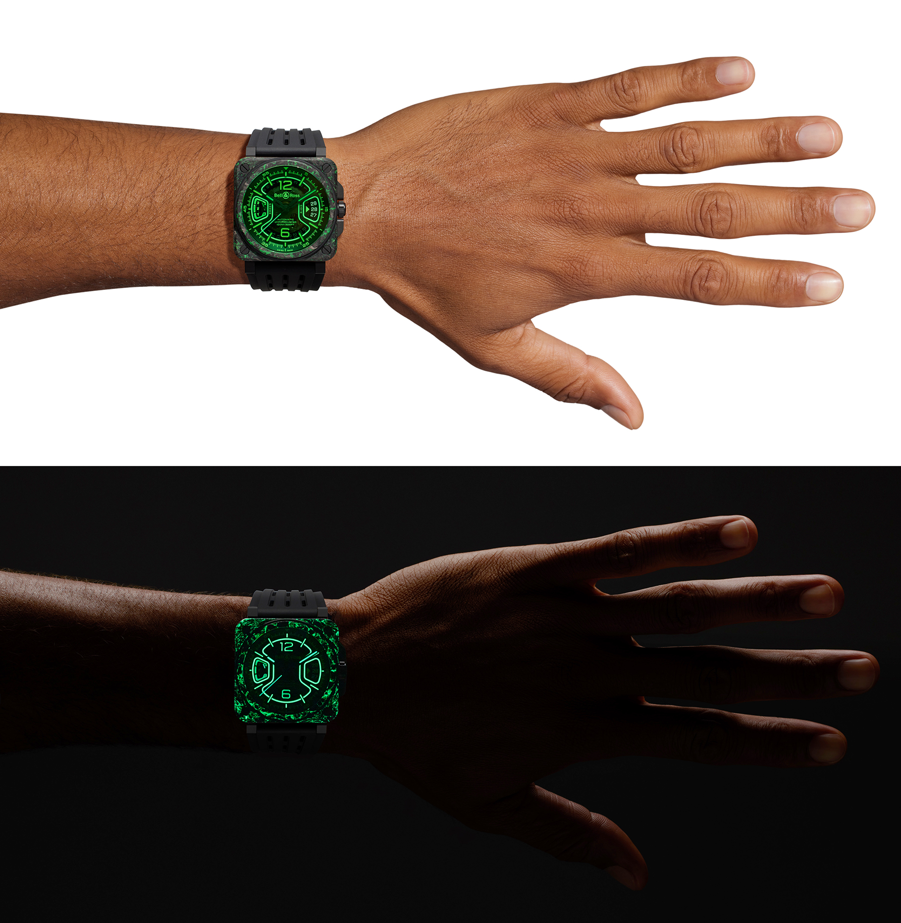 看似绿、黑交织的 BR-X3 Night Vision 腕表的表壳上下层实由黑色碳纤维与SLN树脂复合材料所制造,在灰黑中形成如迷彩般的不规则绿色纹理,白天看充满野性魅力, 在暗黑中绽放绿光的视觉效果更是叫人一见难忘。 而表壳中层则为经黑色 PVD 涂层的钛金属,角落并由包覆以绿色橡胶的四颗螺丝贯穿; 41 乘 41 毫米的开放式面盘上, 三点钟与九点钟方向左右对称的旋转视窗模拟了如飞行仪表板上常见的转盘式仪器,并分别但来日期与三日动力储存的显示。加上绿色蓝宝石水晶錶镜,使之绿上加绿,灵感来自飞机或战机抬头显示系统。