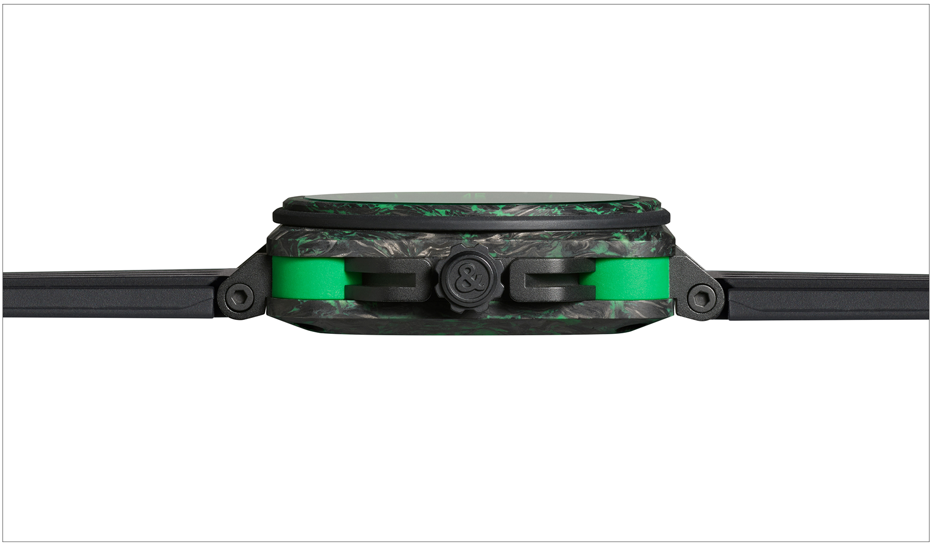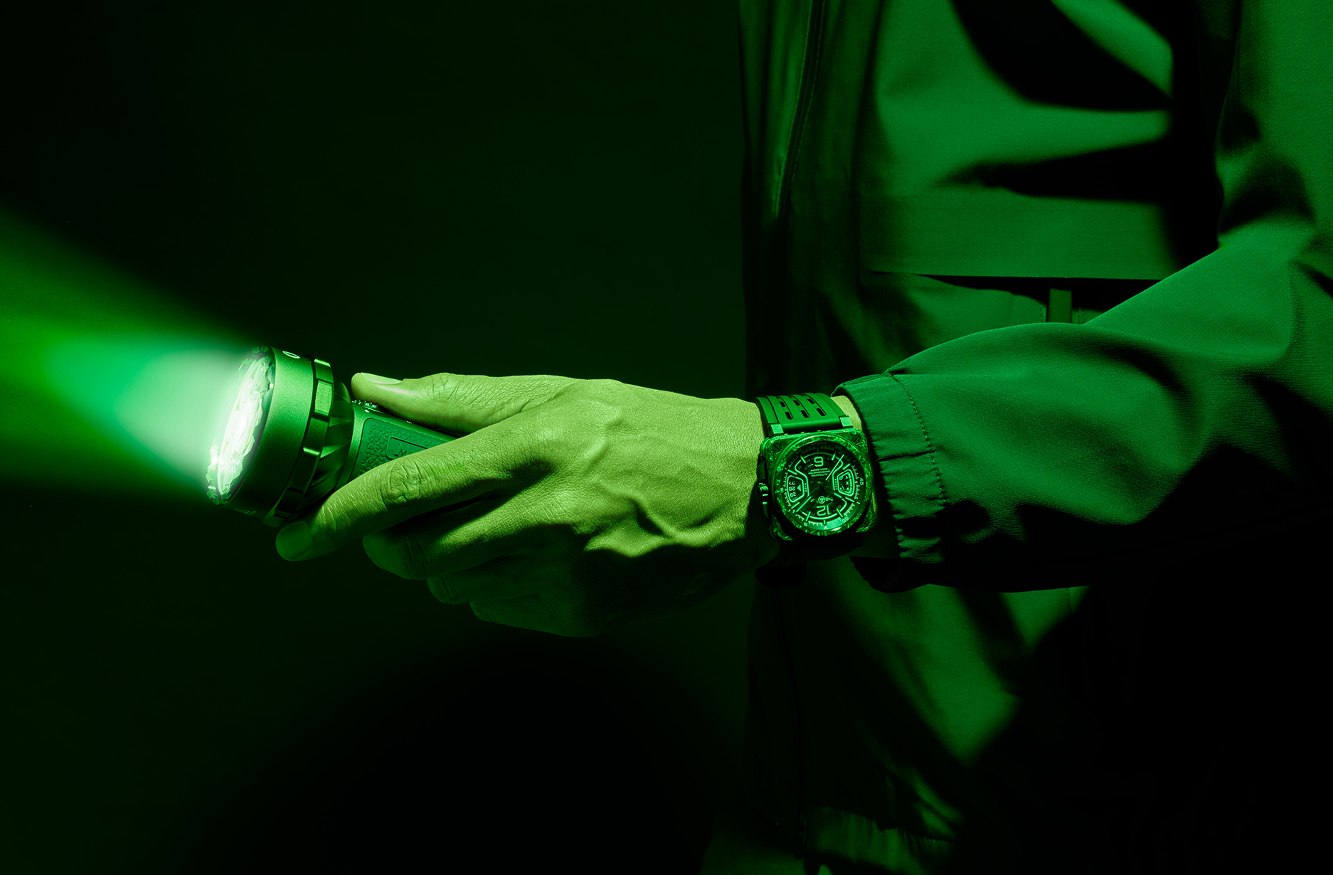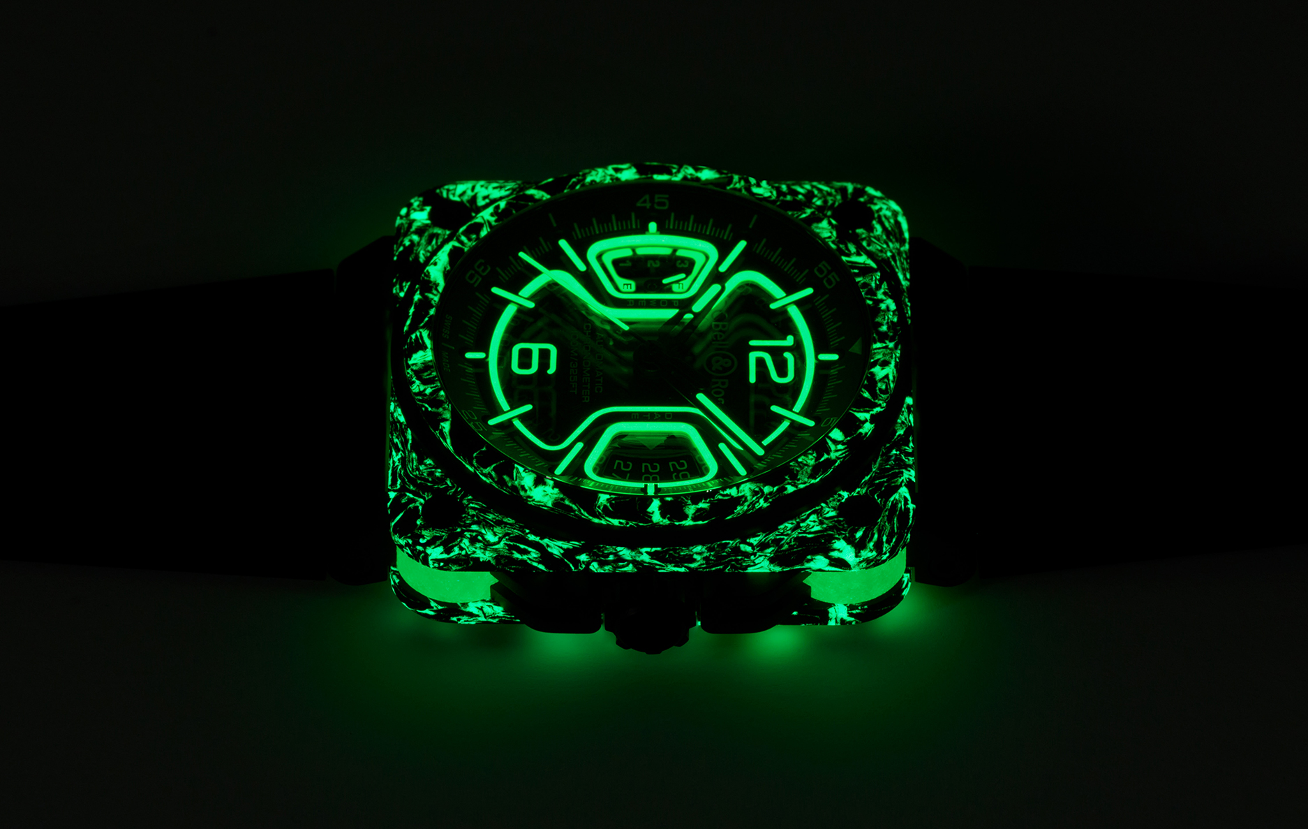 全新的 BR-X3 Night Vision 再次将夜光注入錶壳中,一上一下的两片碳纤维主夹板混合了 SLN 树脂复合物,在灰黑中形成如迷彩般的不规则绿色纹理,白天看充满野性魅力,在暗黑中绽放绿光的视觉效果更是叫人一见难忘。 夹板中的黑色 PVD 钛金属中层錶壳,在錶壳四圆角处贯穿上下固定的螺丝由具夜光效果的绿色橡胶保护,进一步加强了这錶的夜光特色。 透明宝石錶盘上的指针及时标刻度也填上鲜亮的绿色 Super-LumiNova 夜光物料,加上绿色蓝宝石水晶錶镜,使之绿上加绿,灵感来自飞机或战机抬头显示系统。