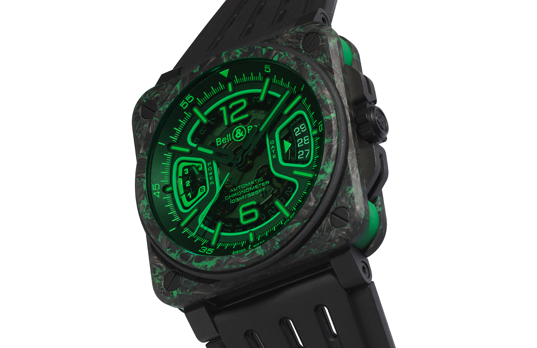 当进入低光源环境时, BR-X3 Night Vision 腕表还将变身夜店风十足的夜间模式!像踏入游乐场中的霓虹魔幻,并以由瑞士专业 Kenissi 机芯厂为 Bell & Ross 所设计的 BR-CAL.323 自动上鍊机芯带来时间与日期显示功能,表款并具备 70 小时动力储存,机芯同时通过瑞士天文台 COSC 认证。