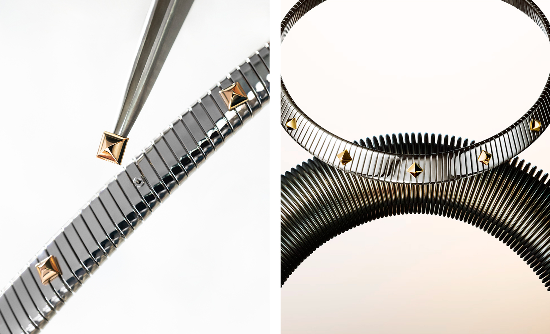 这股异材质混搭的风潮,亦延伸至标志性的 BVLGARI Tubogas 系列,成为此次 Gold & Steel 创作的另一大焦点。 这项诞生于 1940 年代的经典工艺,其灵感源自工业用的气体输送管( Gas pipes )。 BVLGARI 透过特殊的无缝缠绕技术,将长条形金属转化为具备柔韧弹性的螺旋管,本身即是一场挑战金工极限的实验。而在最新的精钢项鍊与手环中,品牌于精钢管线上等距规律地镶嵌了 18K 黄金打造的立体「 铆钉( Studs ) 」。精钢的强韧冷峻与黄金铆钉的精致锐利交织,为原本流畅灵动的曲线注入了些许次文化的庞克元素与工业张力,同时也为日常造型提供了更具破格感与辨识度的选择。