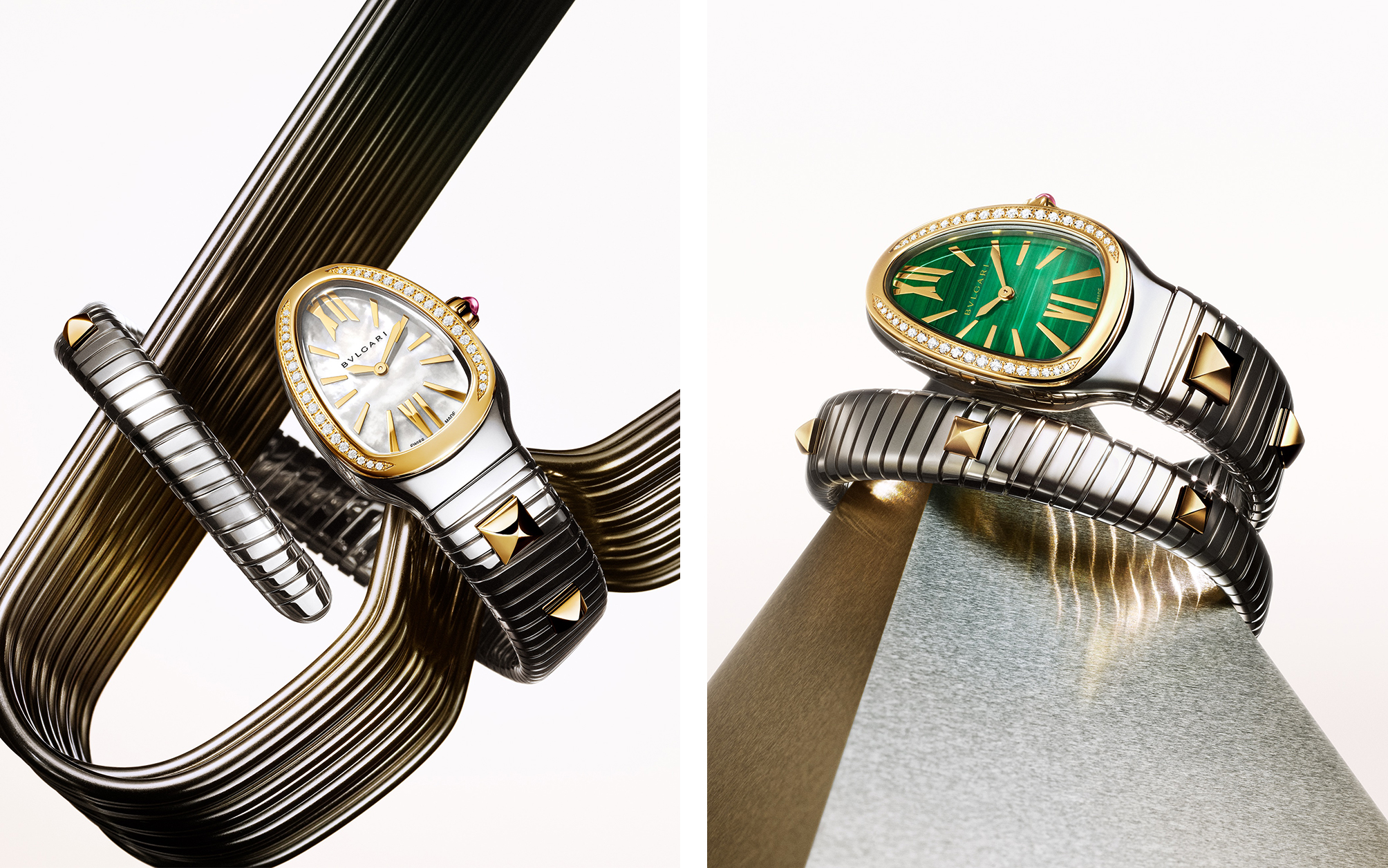 除了首饰,BVLGARI 也同步推出了限量的 Serpenti Tubogas Studs 胶囊腕錶。标志性的蛇形轮廓环绕于灵活的 Tubogas 錶带上,同样点缀了黄金铆钉元素,强化了腕錶的装饰性能。值得注意的是,品牌在此系列中大幅运用了天然宝石錶盘,提供了孔雀石、红玉髓、蓝色方钠石以及珍珠母贝等多种选择。