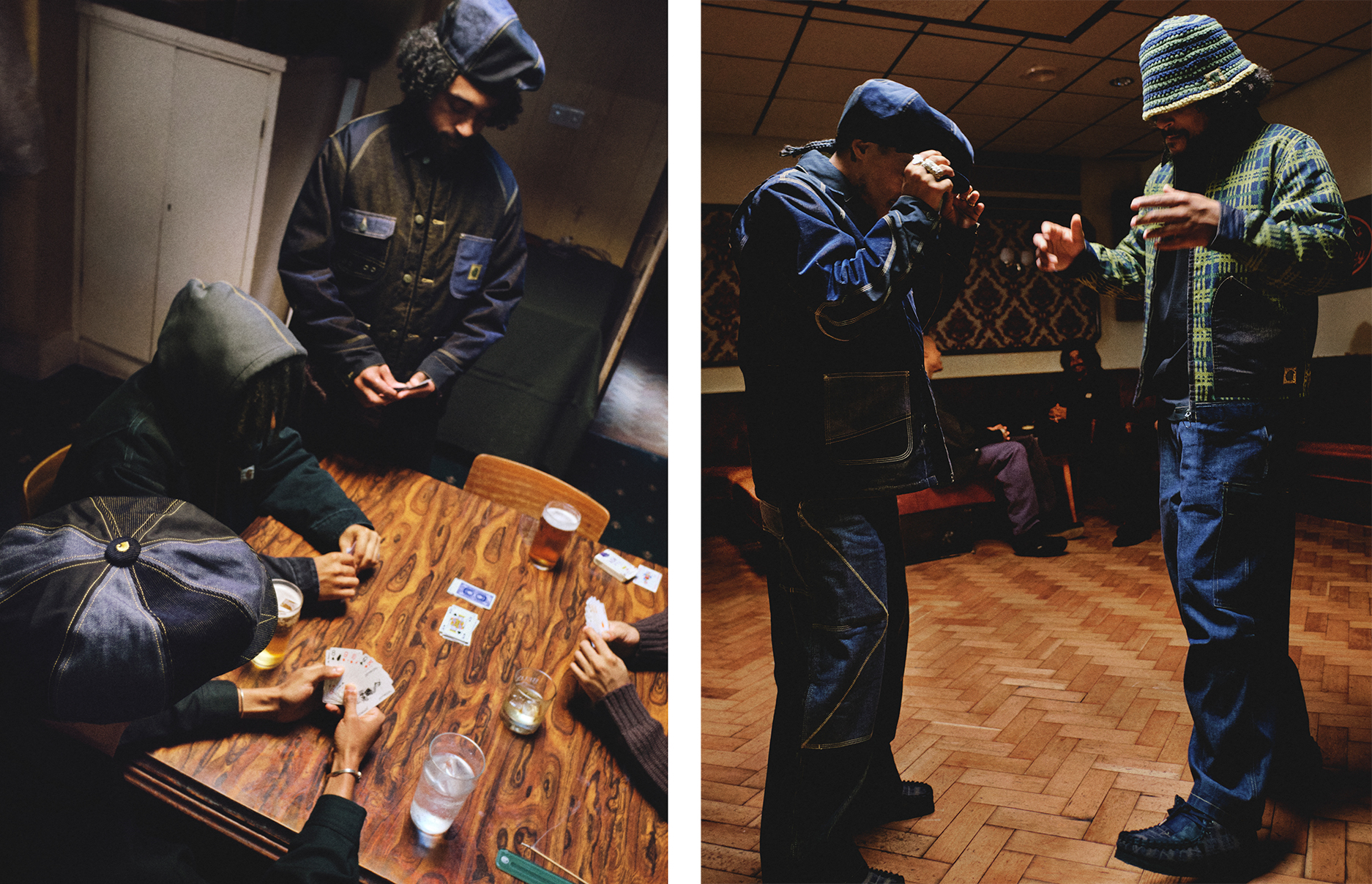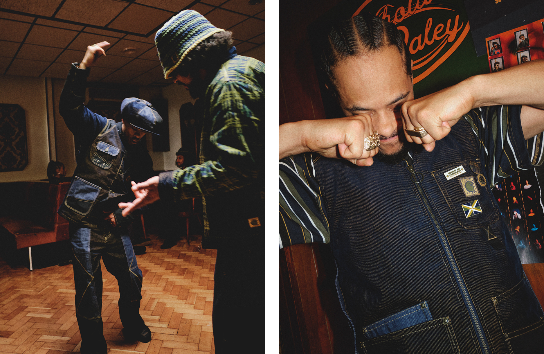 焦点单品包括以海军蓝灯芯绒与靛蓝丹宁结合、配以对比色车线的 Carhartt WIP 工装外套;系列常青款如 Vest 与 Double Knee Pant 亦以相近设计元素升级。系列亦以音乐周边为灵感:特制别针徽章、致敬该俱乐部夜的 T 恤,以及印有自订格纹的唱片袋——该图案由 Daley 母亲的编织小组协作完成。对传承工艺的重视亦体现在一款短版 Harrington 夹克上。 最后则以与日本香品制造商 Kuumba International 合作的线香作结;其香调于研制时参考了牙买加与苏格兰的自然户外气息。
