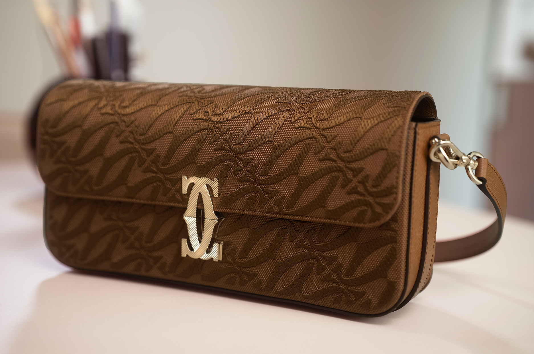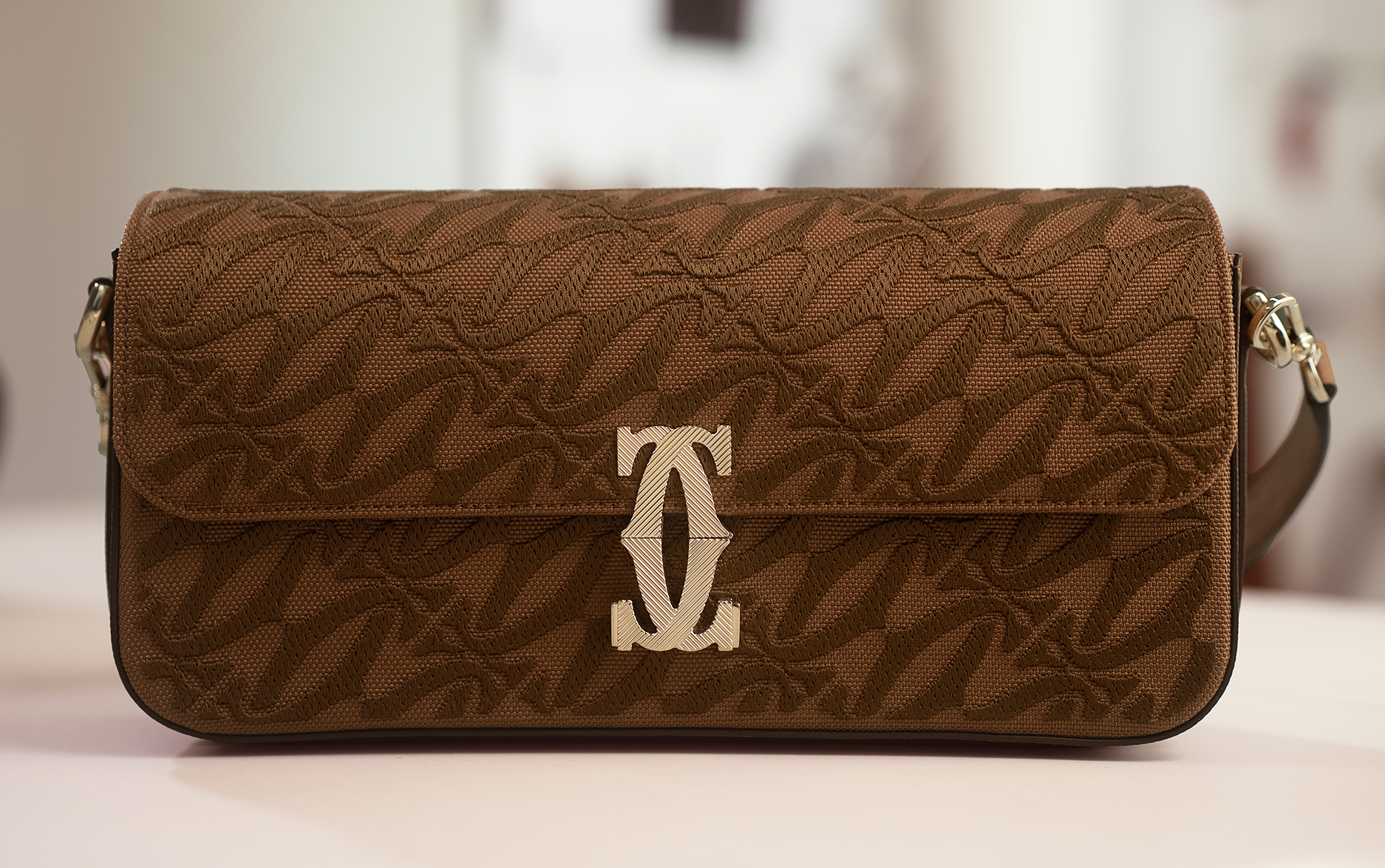 这件作品不只是一个包,更像是品牌与她之间长期合作与信任的象征,将工艺、设计与个人故事巧妙糅合。 这款专属于 Lily Collins 的订制包款,以 C de Cartier 系列的东西向轮廓为基础,选用棕色调搭配同色系的双C无限刺绣图案,包身上还以金色烫印呈现 Lily Collins 的姓名缩写 LC 。