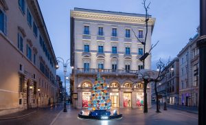 FENDI 把早春夏系列的青绿、橘橙、板岩蓝、柔粉等大胆色彩,搬上罗马 Palazzo 精品店外的 Largo Goldoni 节庆树。以镜面金属结构打造的「 未来感光之树 」,饰以印有系列图案的彩色玻璃球。