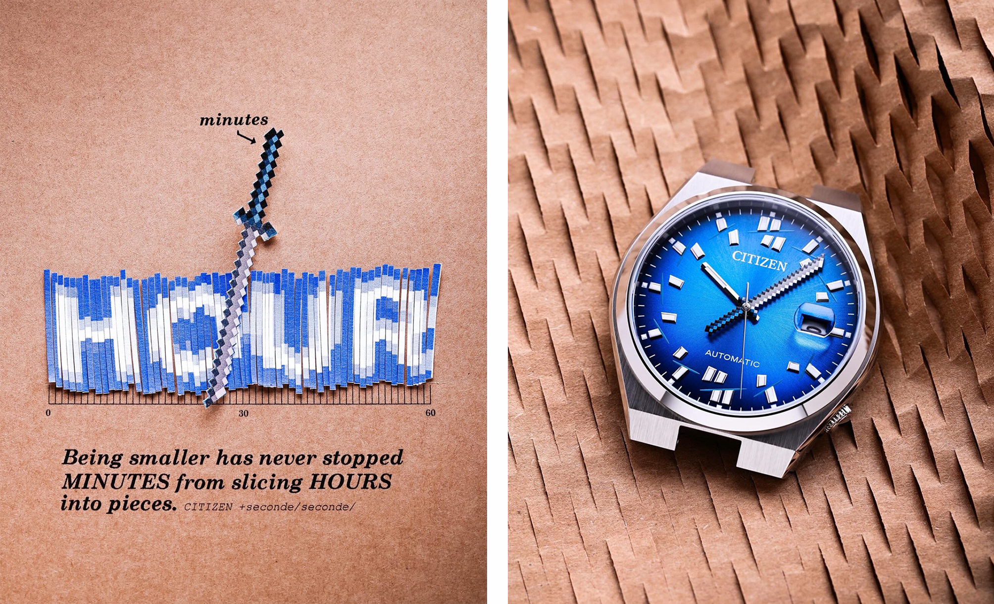 在这次创作中,seconde/seconde/ 回溯錶款名称本源,从其日文语意中蕴含的「 力量 」与「 坚韧 」汲取灵感,将分针设计演变成象征力量的武士刀;这把「 武士刀 」以「 像素艺术 」( pixel art )风格呈现。 这种复古电玩感图像贯穿錶盘刻度,如同一刀切过,为设计注入幽默且富象征意味的细节。 刀柄与錶盘以鲜亮蓝色呈现,錶扣上则雕刻出刀锋划过的痕迹。底盖印有 seconde/seconde/ 的字句: 「 Being smaller has never stopped Minutes from slicing Hours into pieces 」, 进一步呼应腕錶所传达的勇气与韧性主题。