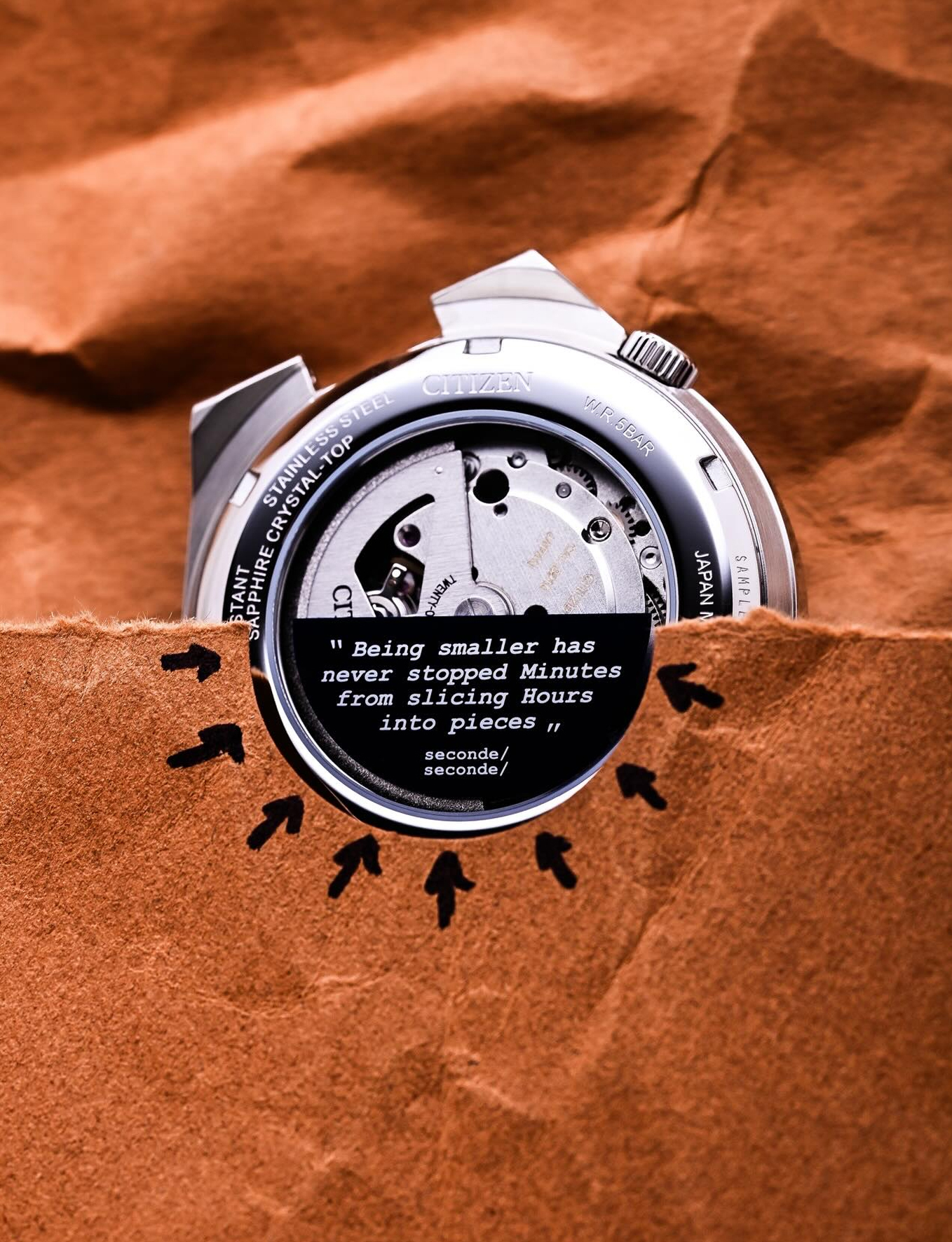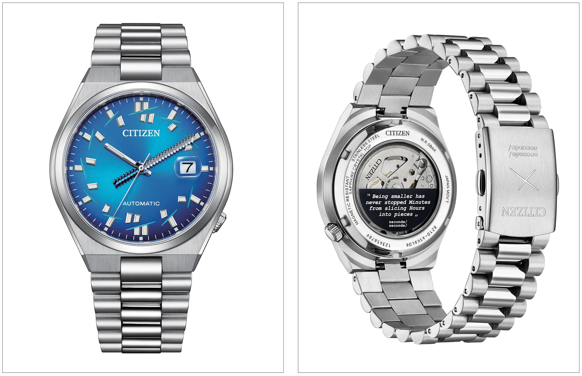 在艺术语彙之外,腕錶同样延续 CITIZEN 一向强调的实用美学,配备不锈钢錶壳与錶带、附日期放大镜的蓝宝石水晶镜面,以及可透过背透一览自动上鍊 Cal. 8210 机芯的透明底盖。 腕表直径 40 毫米、11.7mm 厚度与约 42 小时动力储备,于日常佩戴与故事性设计之间取得理想平衡。腕錶收纳于由 seconde/seconde/ 特别设计的限量版錶盒之中,进一步彰显 CITIZEN 对创新精神的坚持,同时礼赞幽默感、象征意涵与跨文化设计。