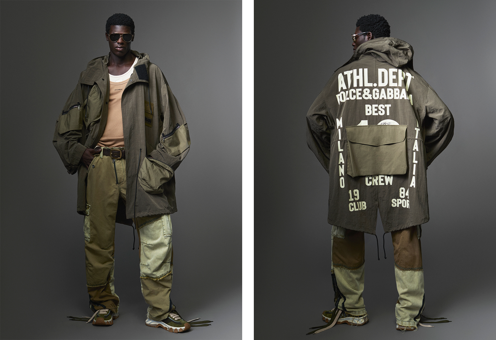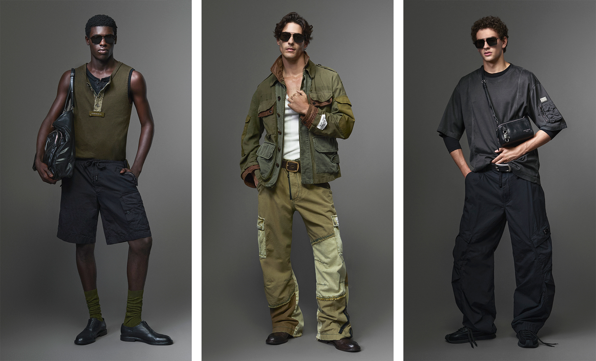 Dolce & Gabbana 早春男装 Re-Edition 2000 系列以千禧年代为灵感,融合工装结构与都会节奏,在宽松轮廓与精致细节之间,勾勒出自在而进化的当代风格语汇。 整个系列贯穿着一种轻松自在的态度。灵感源自 2000 年代,并与城市生活的活力节奏相互呼应。设计上结合宽松剪裁、大翻盖口袋、抽绳、拉链与魔鬼毡等实用主义元素,为外套与裤装增添结构感,在实用性与精致美学间取得完美平衡。