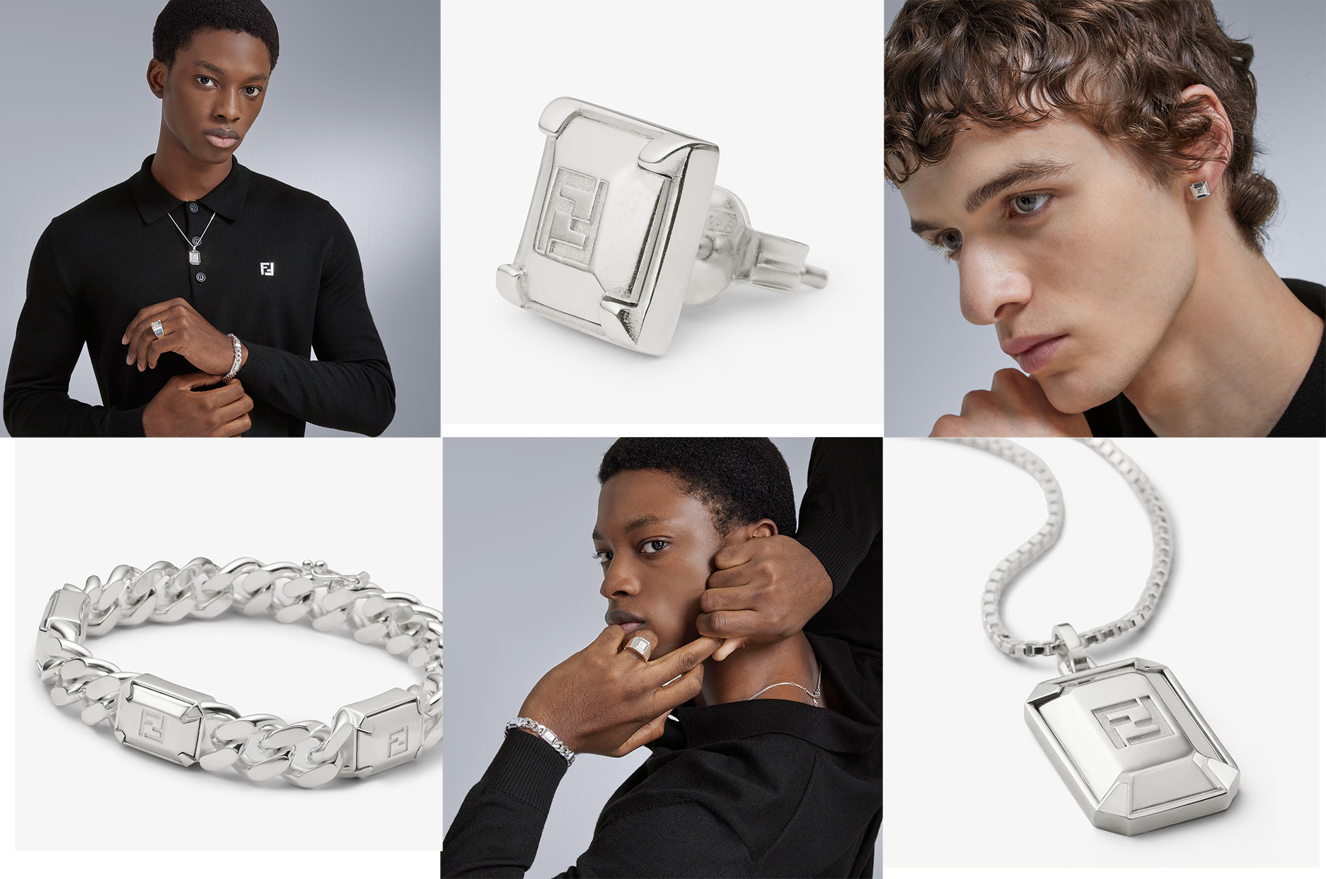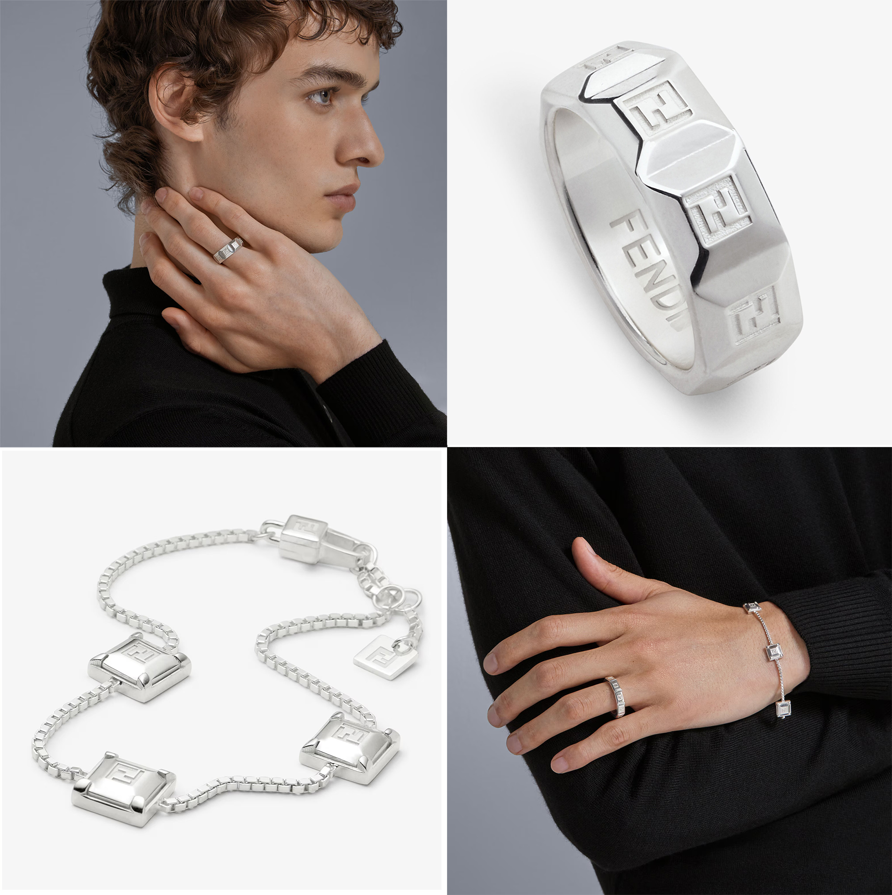 早在大秀上提前亮相的 FENDI 925 纯银首饰之作,以另一种方式重新赋予男士珠宝崭新美学与感动。 这是一场由珠宝艺术总监 Delfina Delettrez Fendi 策划的风格实验。 她将高级珠宝的切割与镶嵌工艺转化为极简而锐利的线条,把钻石的棱角幻化为银质的冷冽光泽,并在细节处悄然植入 FENDI 标志性 FF Logo,让设计在经典与反叛之间取得微妙平衡。