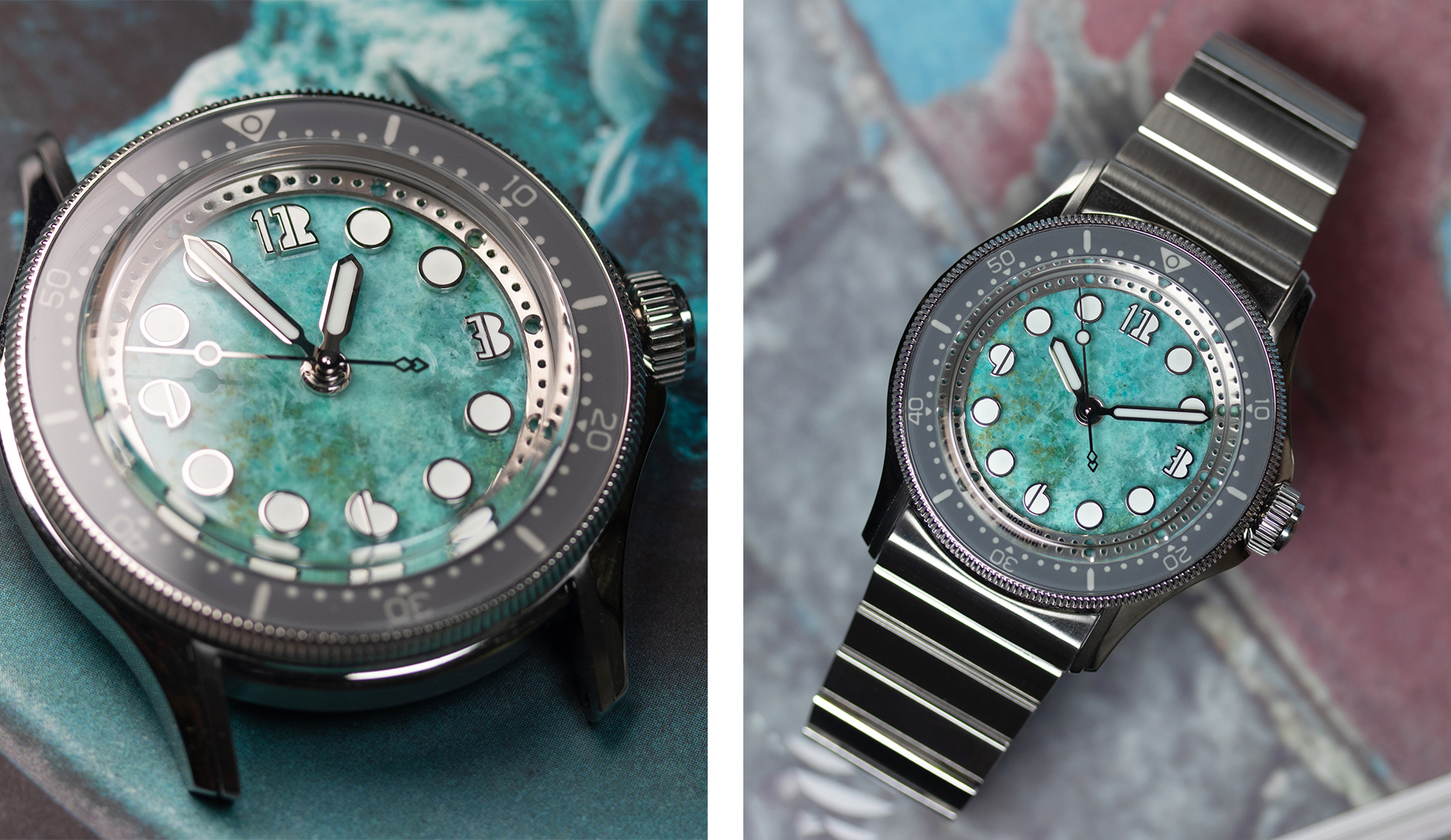 由于每一块原石的纹理、色泽与结晶皆由自然造就,这确保了全球每一枚 Nemolithic 都拥有绝无仅有的 “灵魂印记 ”,绝不雷同。 在设计美学上,该系列完整保留了 Nemo 家族标志性的建筑感轮廓与层次分明的视觉张力,40毫米的 316L 精钢表壳经过拉丝与抛光的细腻交替处理,既展现了如雕塑般的硬朗力量,又温柔地衬托出石材本身的温润质感。其独特的 “ 盒型 ” 蓝宝石水晶镜面之下,每一处细节都经过匠心考量,旨在让光影在石面流转时能折射出多变的性格,正如品牌所言,这不仅是材料的实验,更是赋予冰冷精密零件以生命力的尝试。
