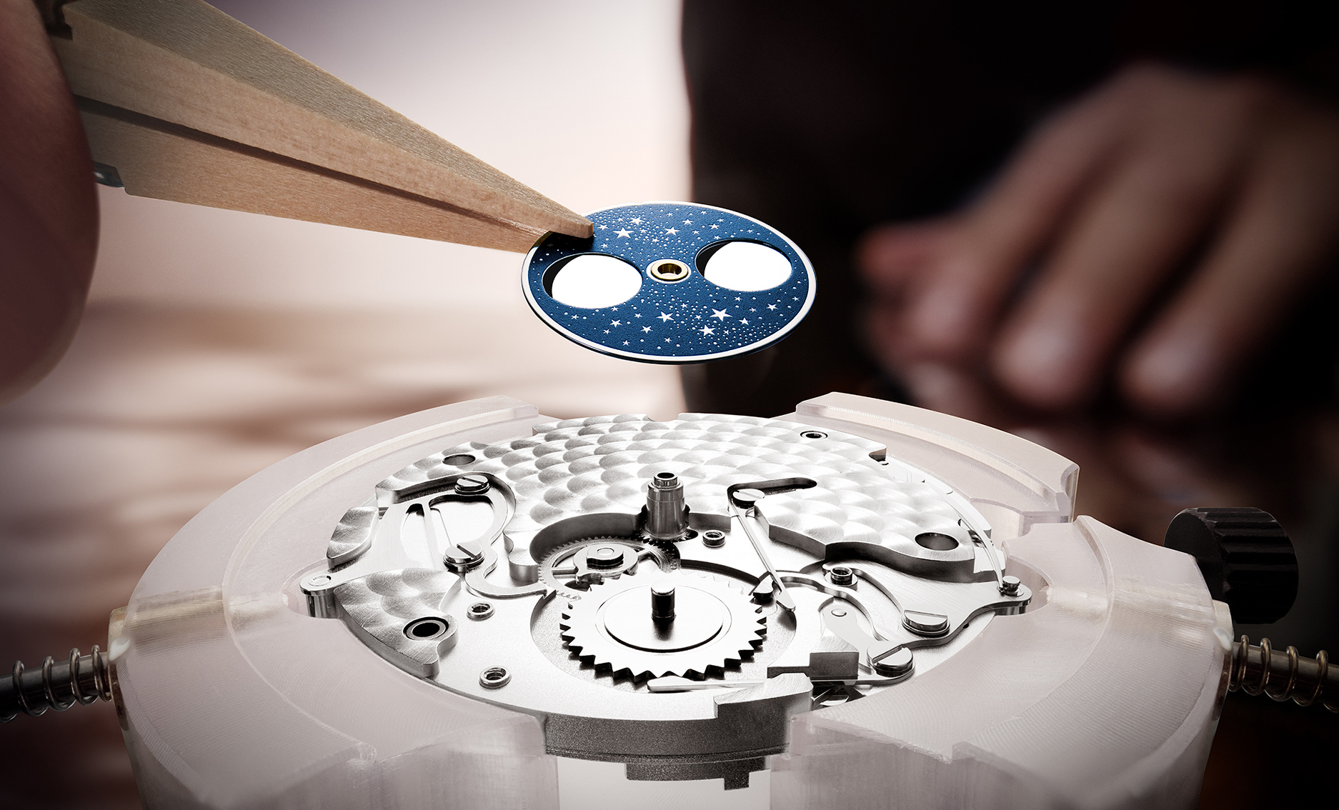 ▲ 月相款采用 925 机芯, 6 点钟呈现立体月相与指针式日期,银月与蓝色星空营造典雅细腻的视觉焦点。