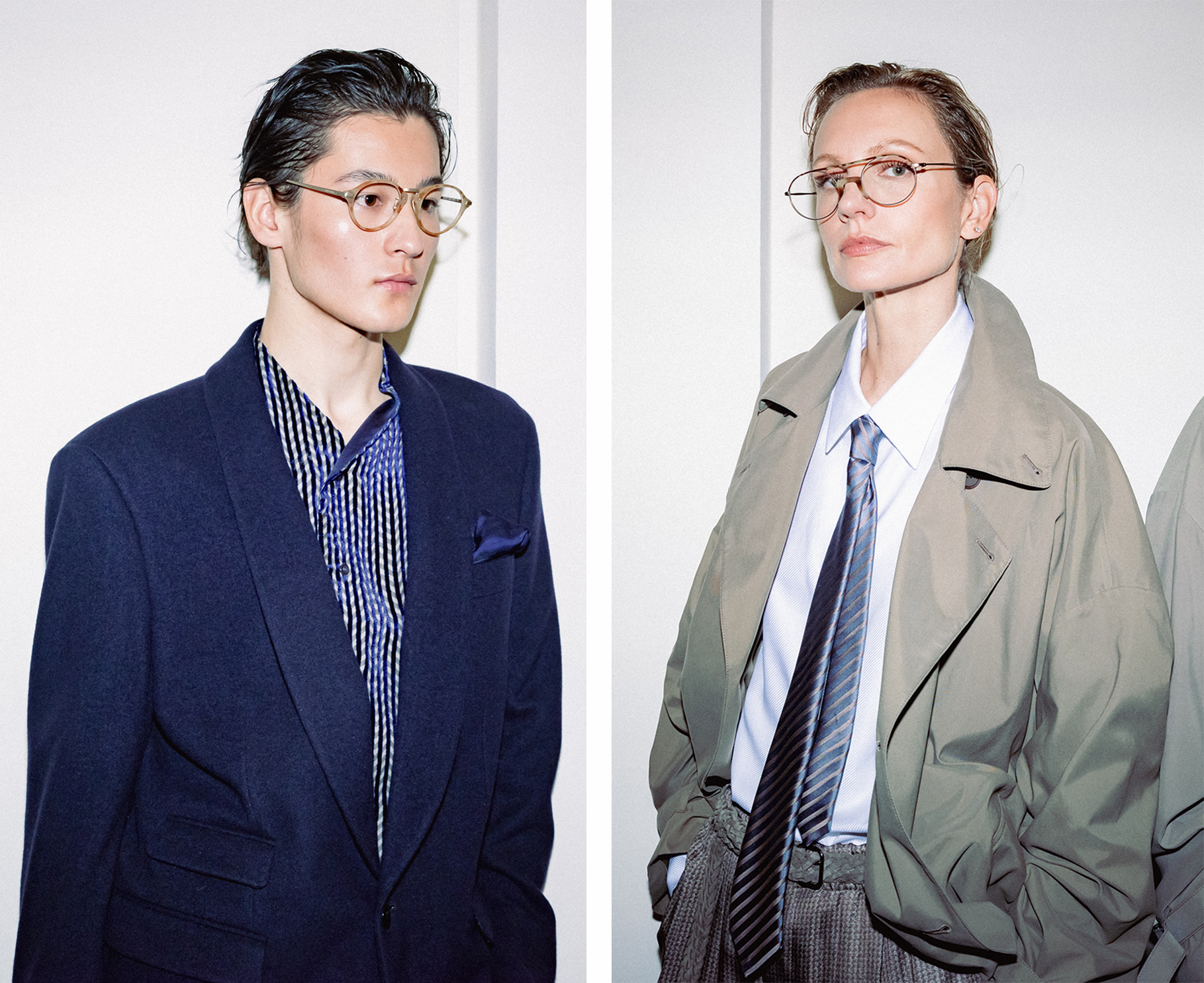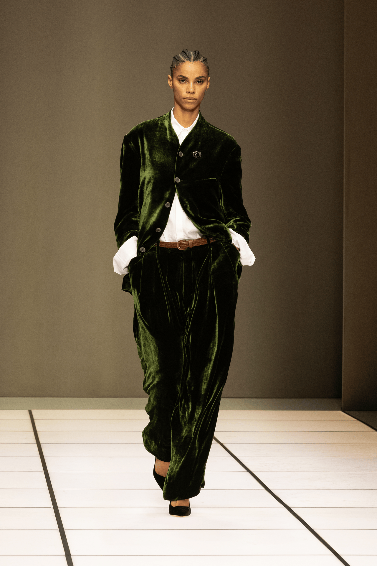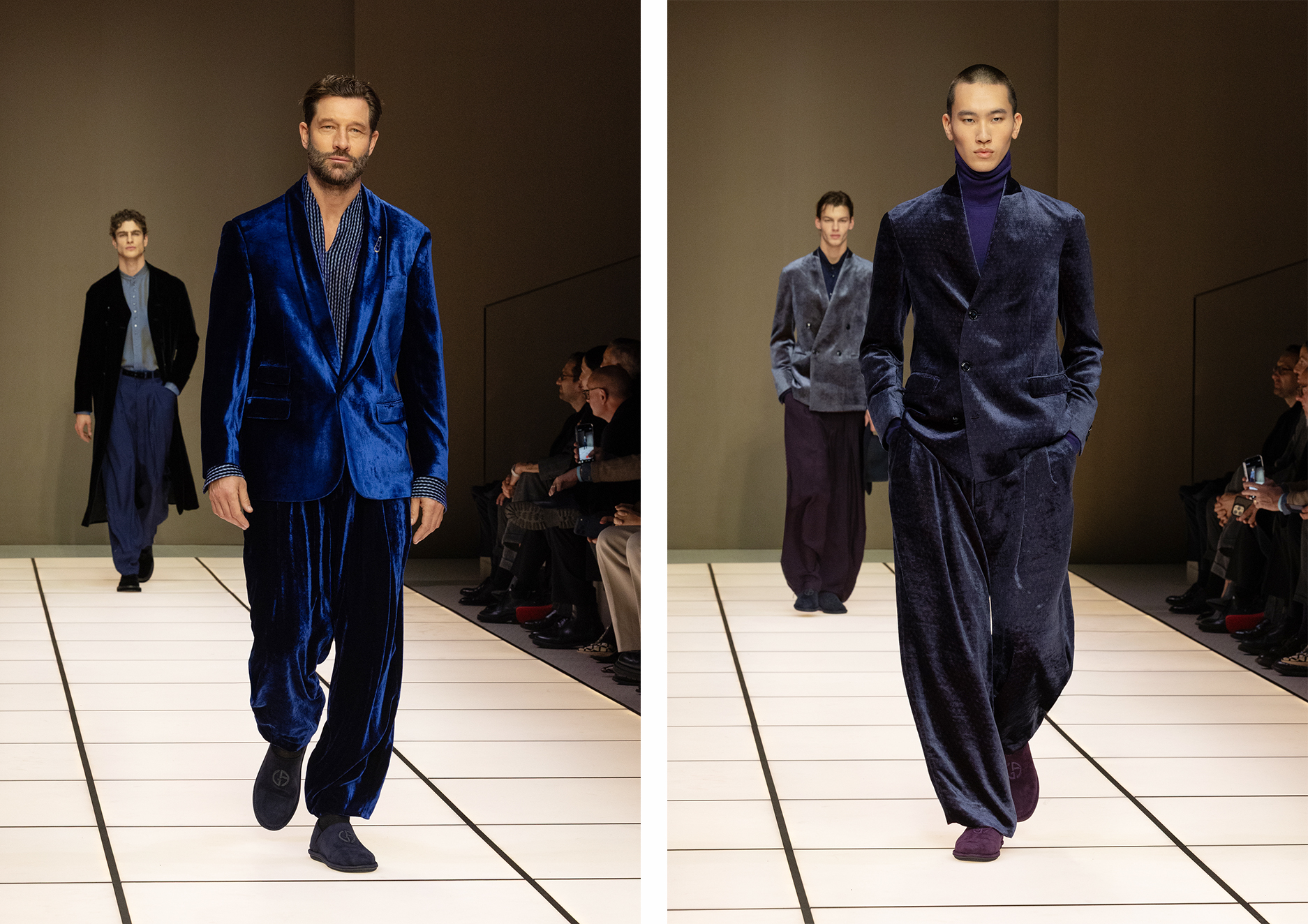 整个系列中, Dell’Orco 著重华美材质与细腻配色,将祖母绿、紫晶色与虹彩点缀巧妙融入原本低调内敛的色盘之中。 他以更贴身的比例与若隐若现的光泽,向 Armani 隽永美学致敬之余,同时注入个人独特的偏锋气质。