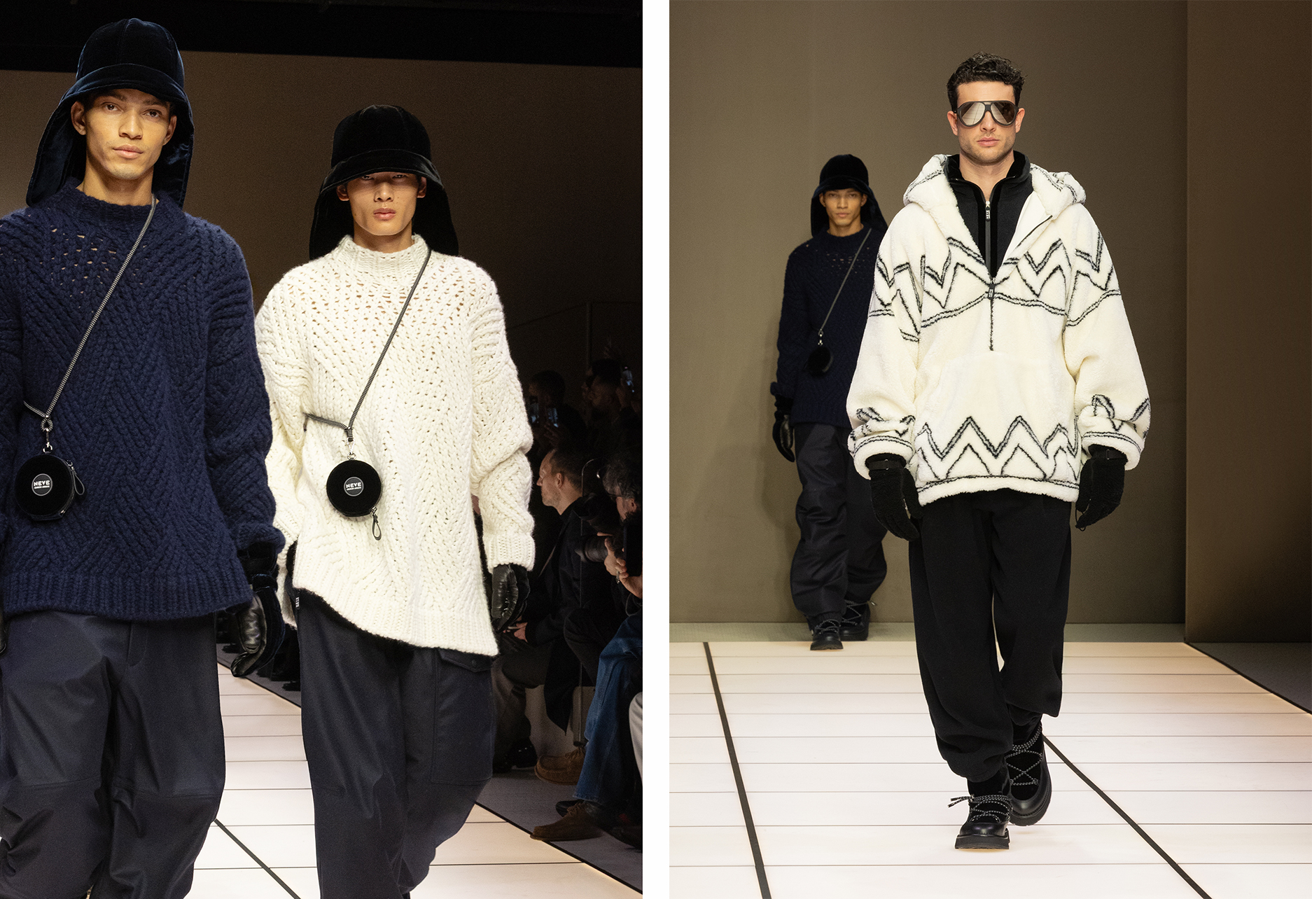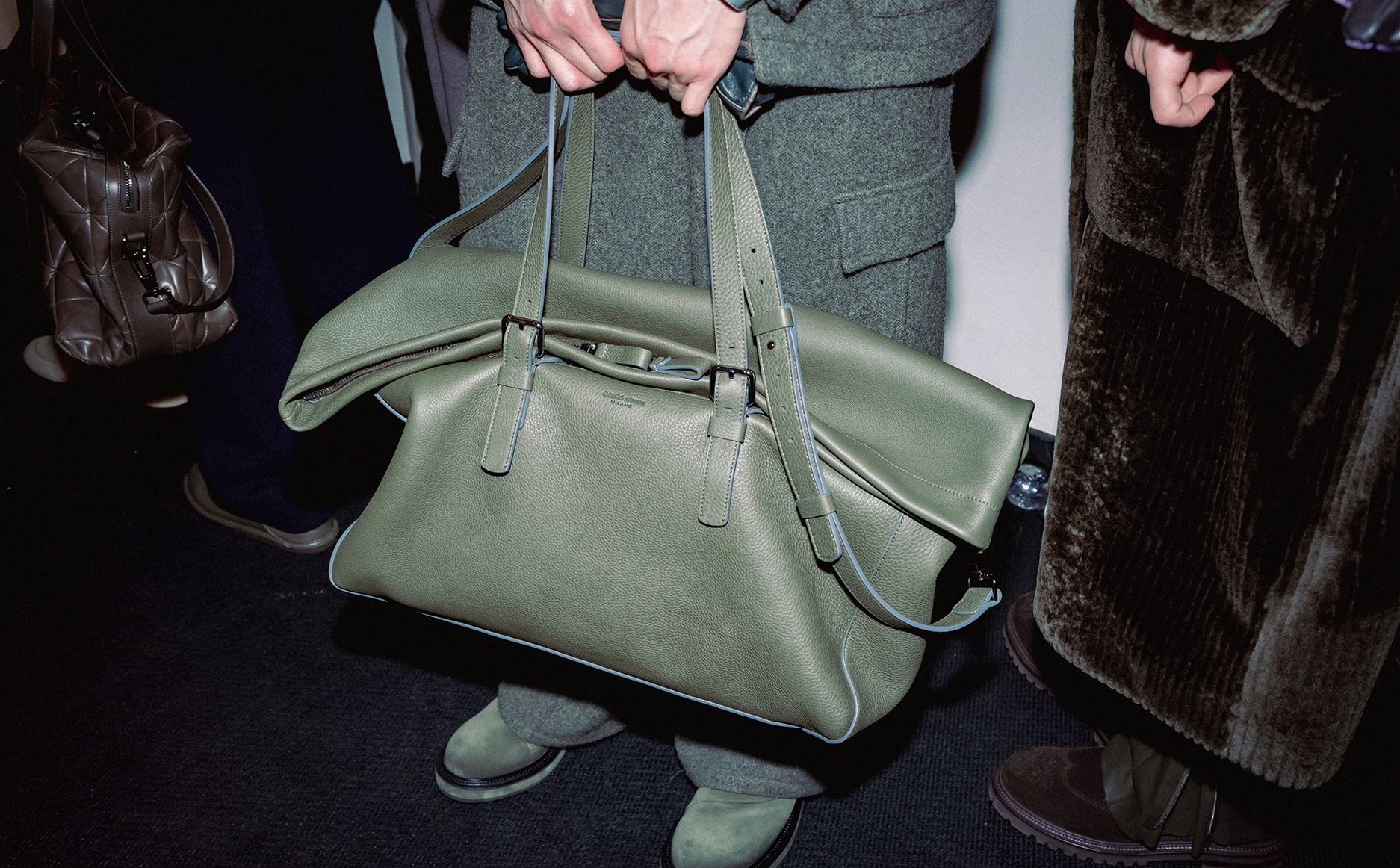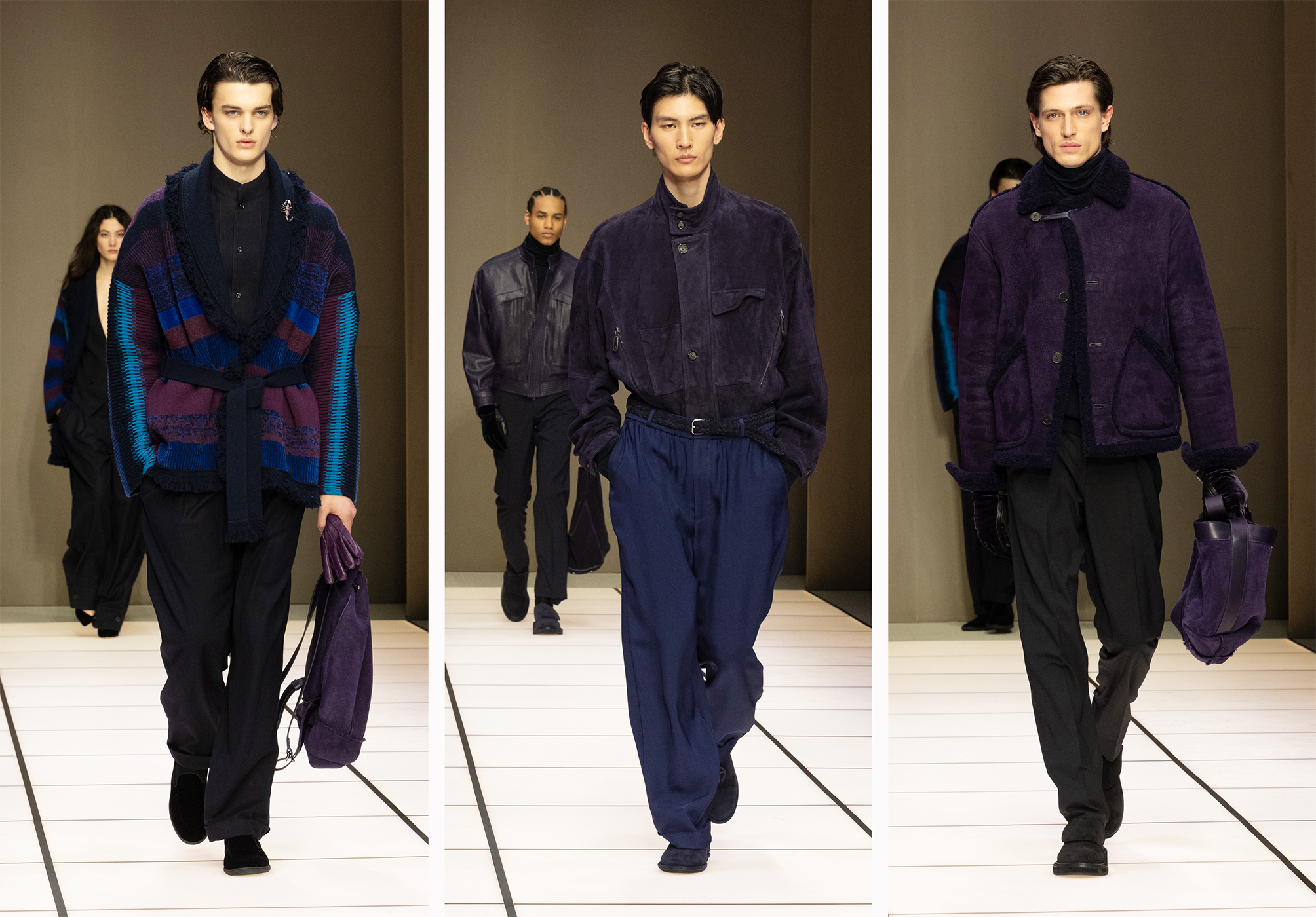 整个系列的叙事在熟悉语彙与温和试验之间取得平衡:反覆出现的菱格图案点缀于绗缝袋款与实用公事包之上;外套部分则以天鹅绒、麂皮羊毛与印花皮草打造的长身双排扣大衣发声,形成鲜明焦点。 更具突破意味的是, Dell’Orco 在第二章节引入源自 Neve 系列的高山风格单品,并推出一组以非常规紫调与虹彩绿呈现的外套三重奏。