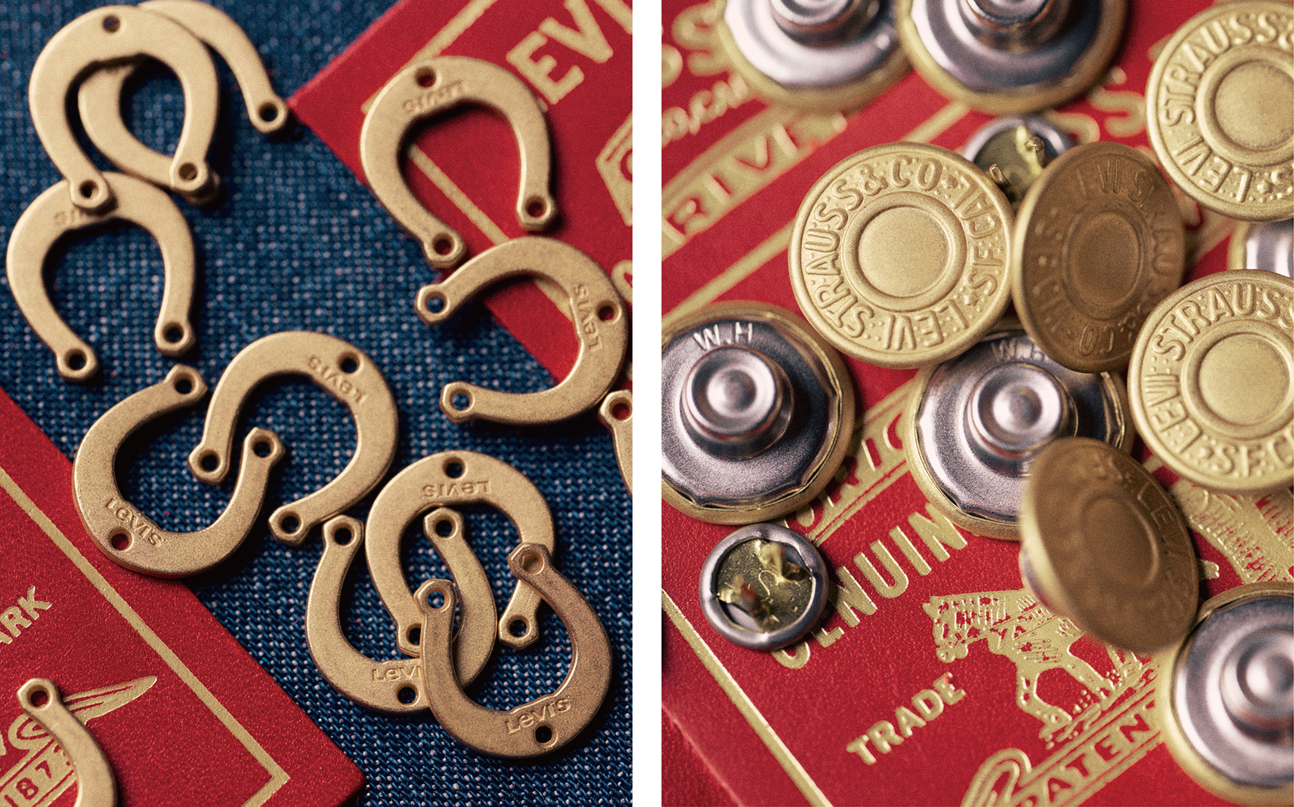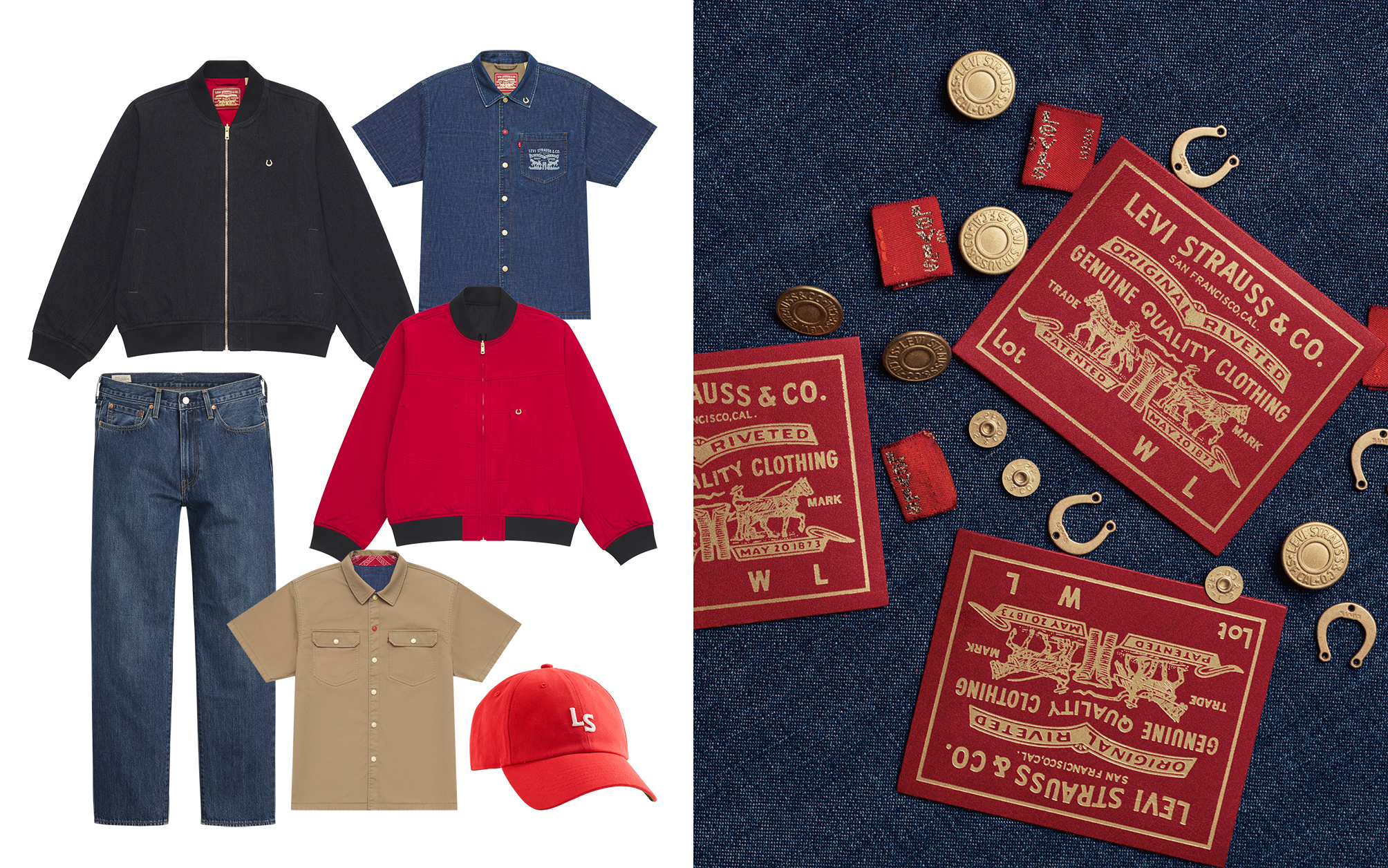 今年马年限定系列标志性的双马皮牌焕新为节庆红调,与 Levi’s® 红旗标相得益彰。夹克与牛仔裤上缀以金色马蹄铁装饰,寓意新年好运;金赤耳设计的回归,为细节增添低调光泽;内衬处修饰的腰果花纹,则延续 Levi’s® 美式复古基因,在传统与新意之间游走自如。