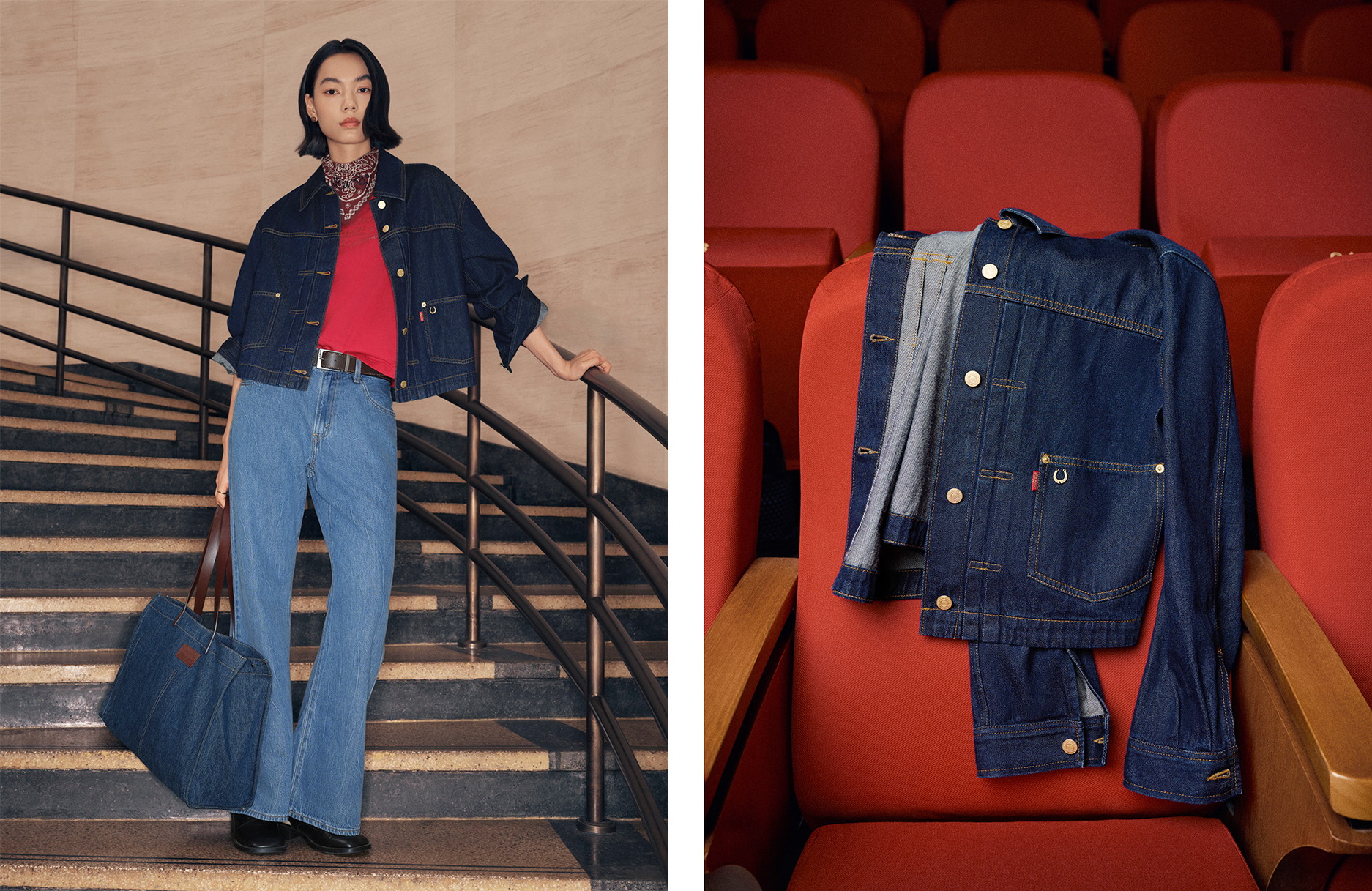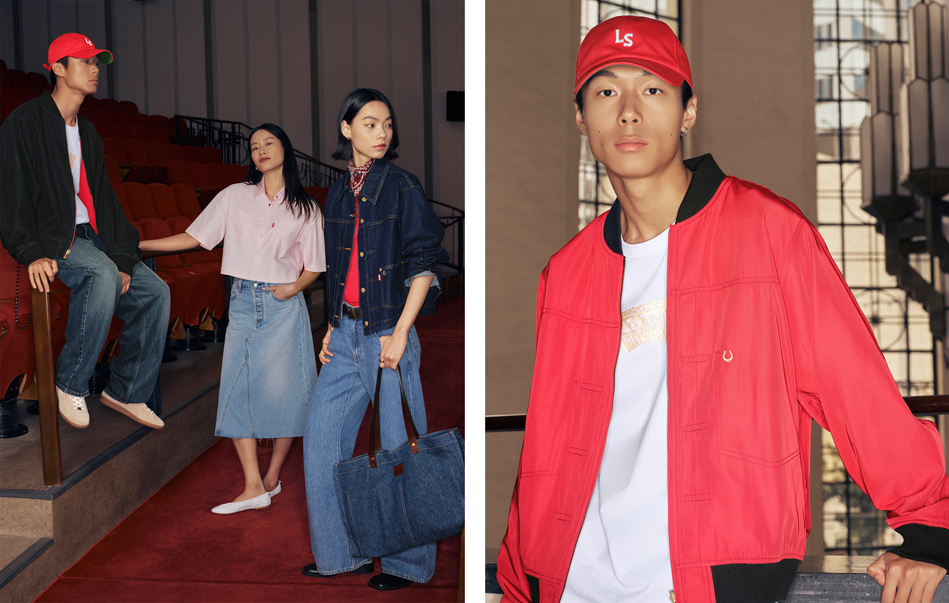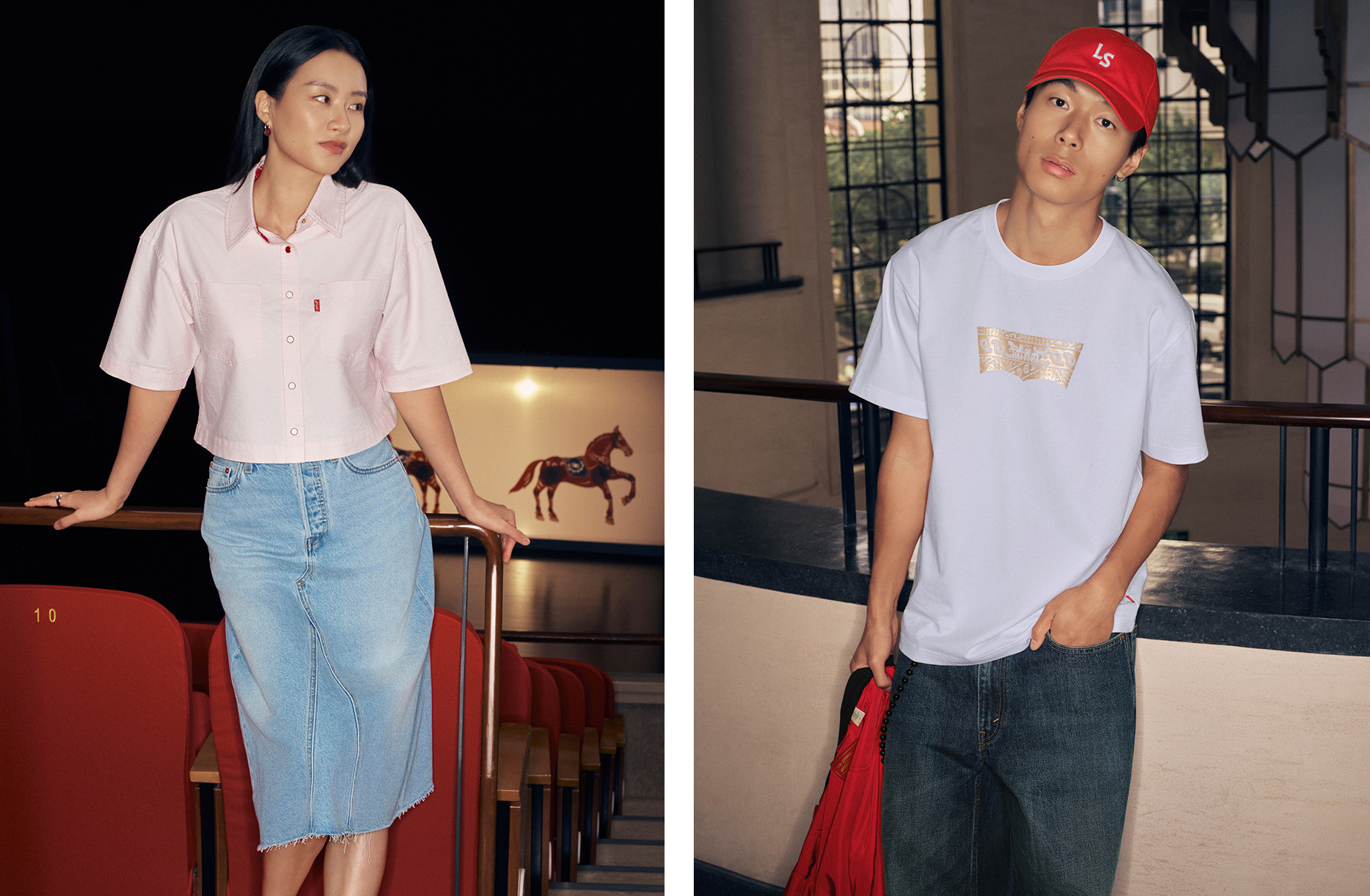 而女装系列涵盖⻢年限定丹宁夹克、 V 领针织衫、和 T 恤等单品,巧妙融合层次与比例变化,展现轻松自信的姿态。喇叭裤型宽松牛仔裤与 A 字型剪裁半身裙在挺括与柔软间取得平衡,体现女性的力量与优雅。全系列以柔韧轮廓与精致质感延续 Levi’s® 的工艺精神,在节日氛围中呈现自信与松弛的完美平衡。