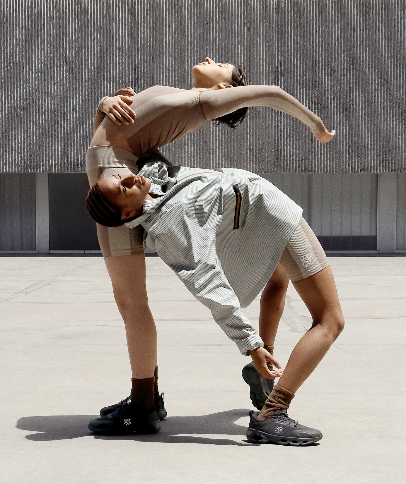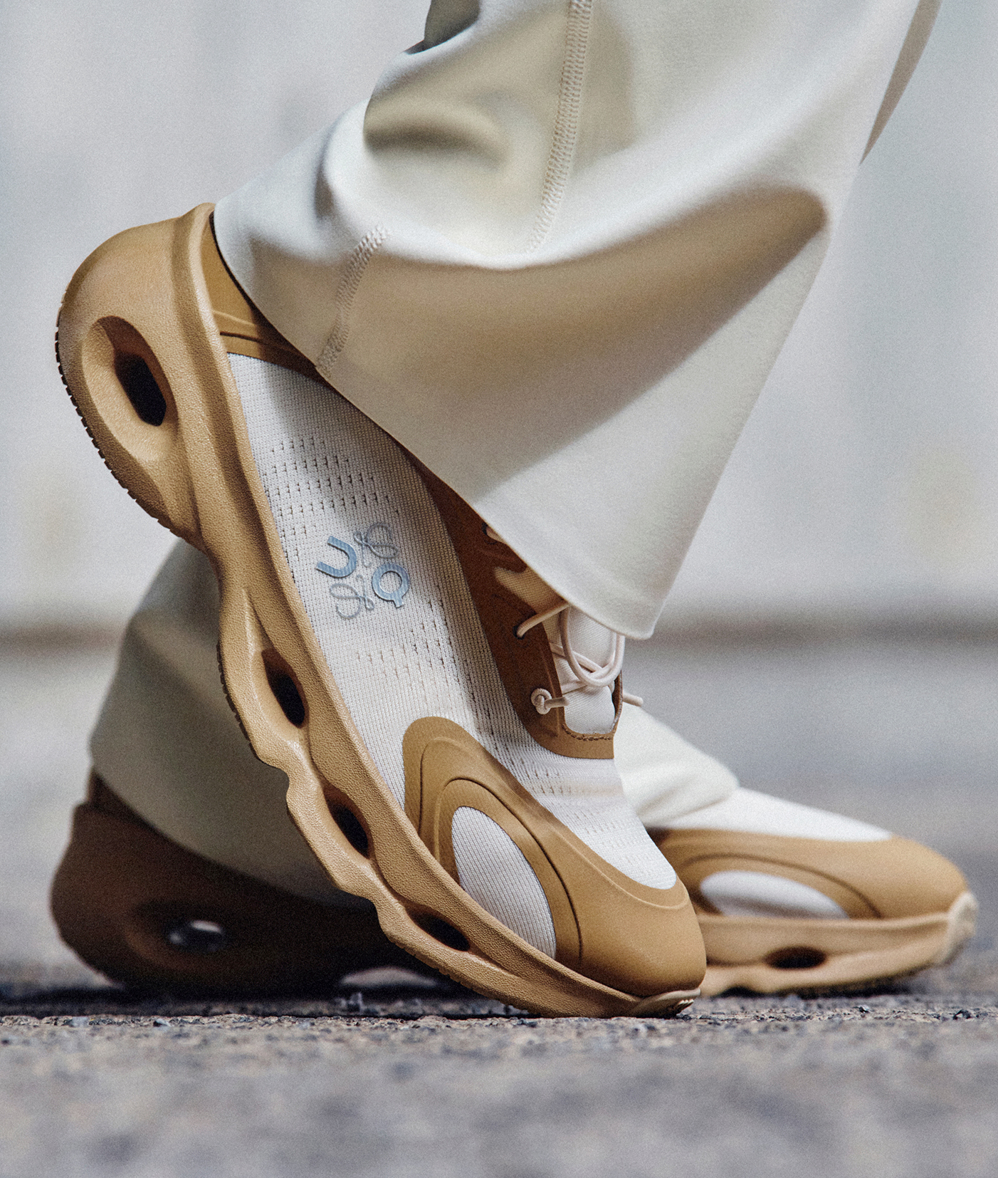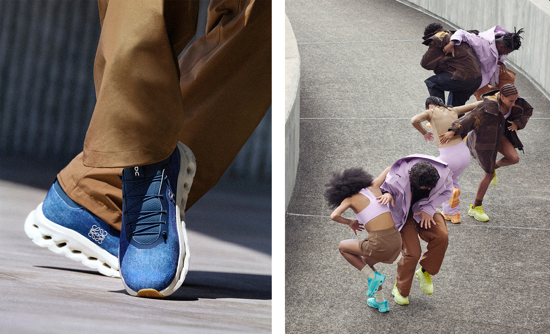 形象广告影片由美国摄影师 Ryan McGinley 掌镜、Bleunuit 执导,舞团 MazelFreten 出演,动作指导为 Ash Rucker。上方可见企划剧照,直击单品的动态表现。  Cloudsolo 以俐落結構糅合工藝與科技打造全新鞋款, 結合 LOEWE 招牌 Pebble 旋扣與 On 採用半透明紗線編織的性能網布,可調節彈性鞋帶則飾以聯名標誌。