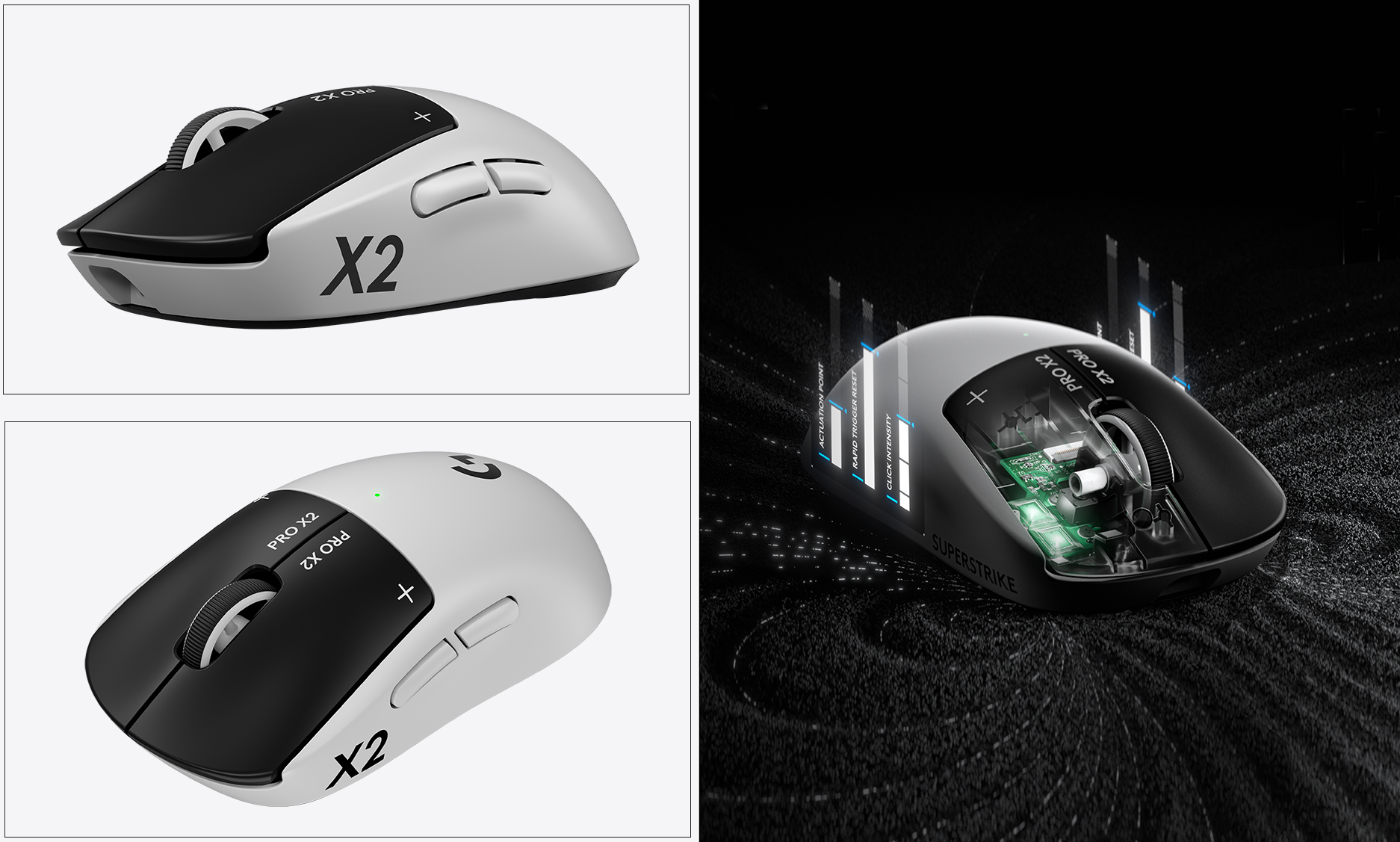 Logitech G Pro X2 Superstrike 重量仅 65 克,与前代  Pro X Superlight 2 相比,重量略有增加,但外观改用白色机身搭配黑色按键,更具辨识度。最大革新在于全新类比式按键,官方声称可将点击延迟减少最多 30 毫秒。