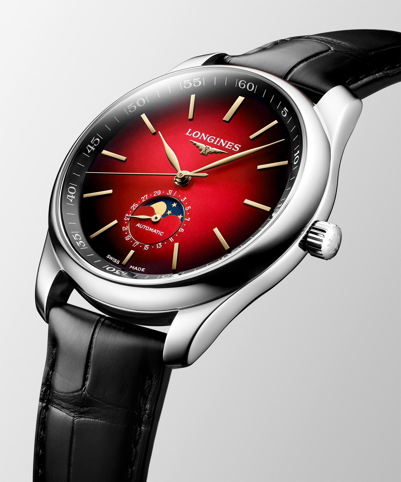 此錶采用 42 毫米不锈钢錶壳,并搭载红色太阳放射饰纹磨砂錶盘。 錶盘巧妙的渐变色泽令人联想到充满诗意的日出景象—吉祥地象征著全新开始。 优雅的造型镀金指针与镶贴时标让外观更显精致,日期指示则围绕著 6 点钟月相显示。