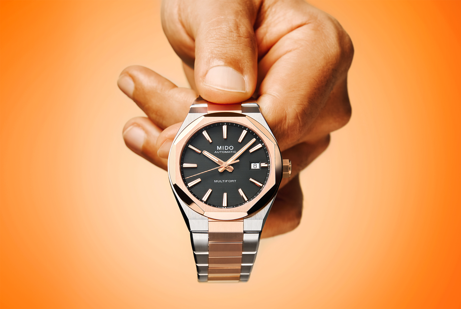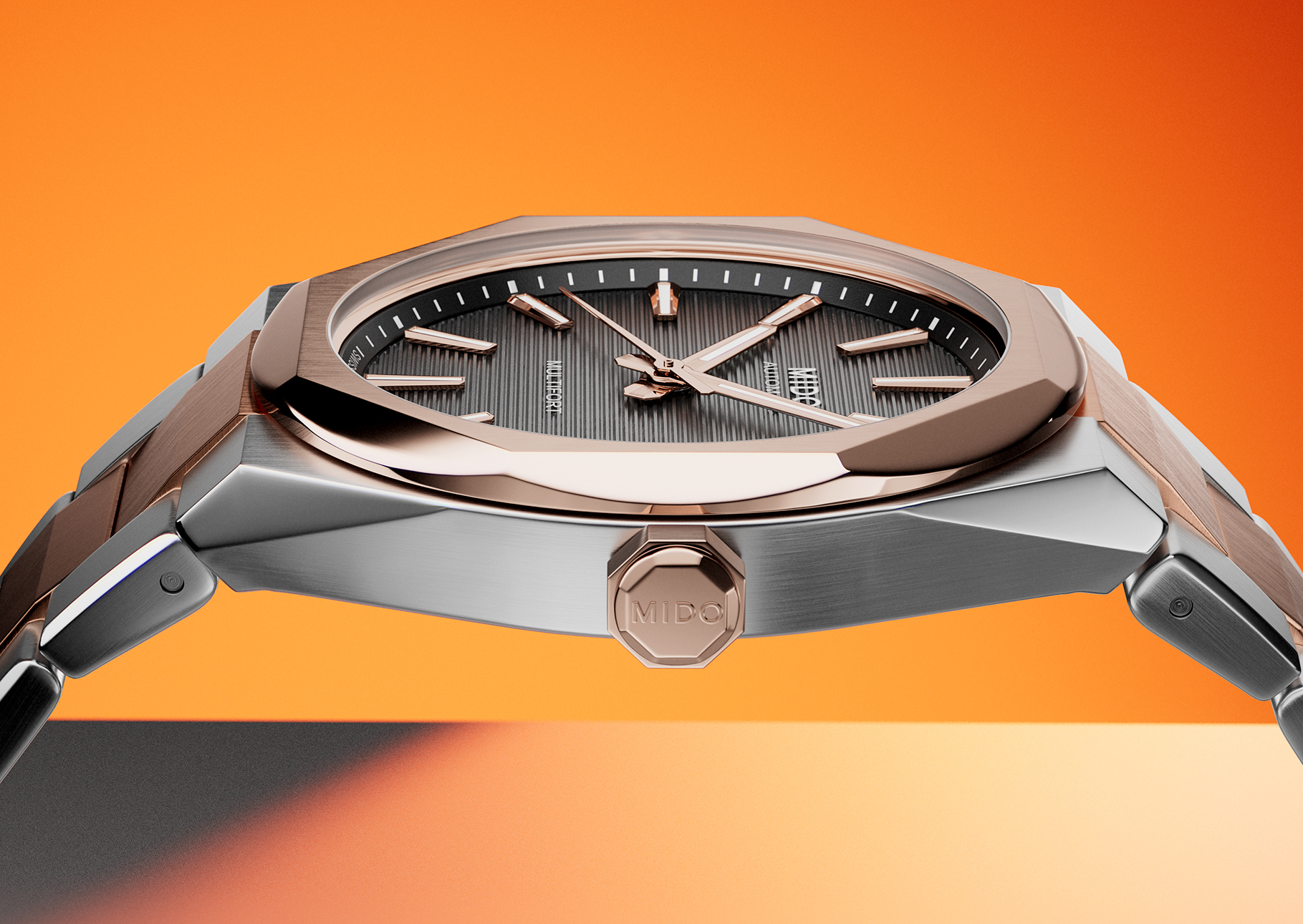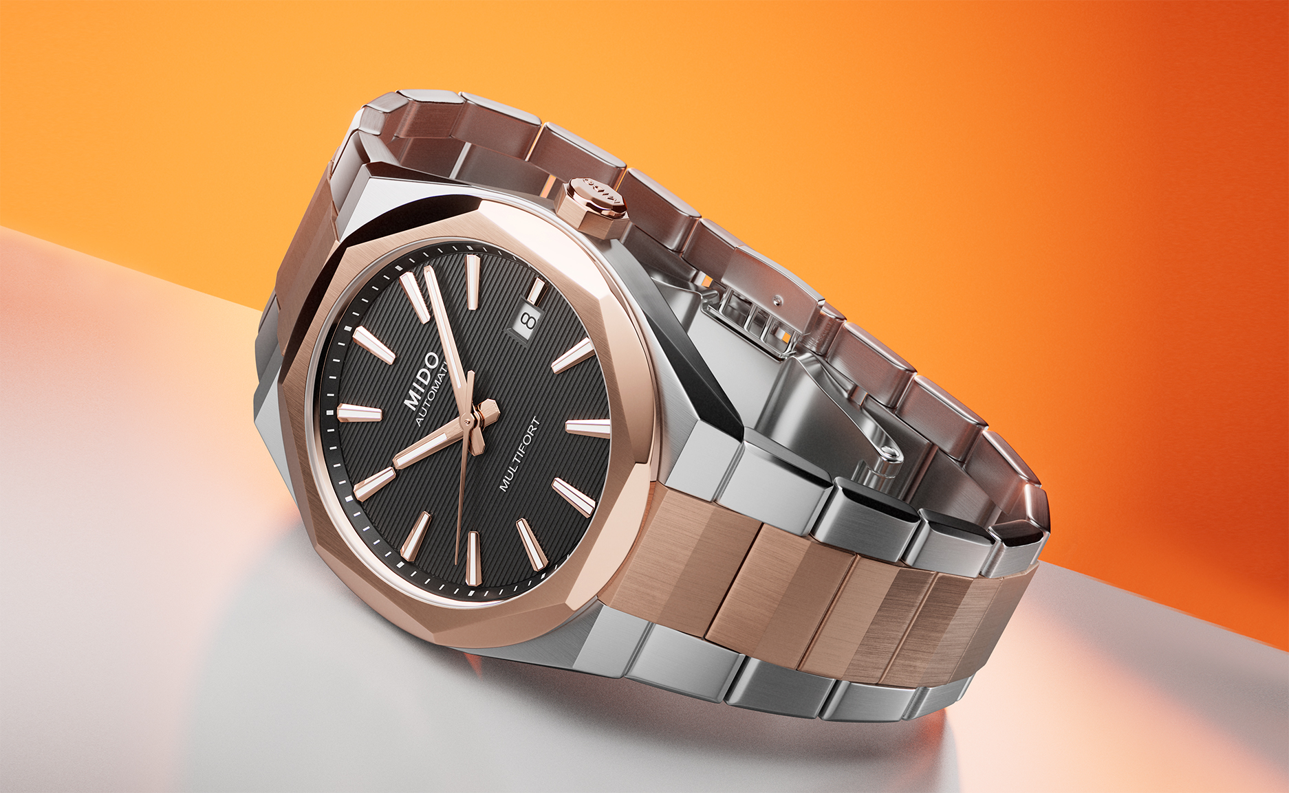 MIDO 瑞士美度表将「 技术 」( TECHNOLOGY )与「 几何 」( GEOMETRY )融合,开创全新设计语言—— TECHNOMETRY, 让 Multifort 腕錶进化至崭新境界。 继 Multifort 8 One Crown 将原有的 “ 两冠 ” 设计精简为更洗练、更全能的一体式运动风格后, MIDO 瑞士美度表现推出全新玫瑰金表壳款。 新作延续了 One Crown 的经典设计语言,并融入玫瑰金色泽点缀,呈现出偏向 “ 生活方式 ” 的温润美感。与此同时,该表款依然保持了品牌一贯的高性价比优势。