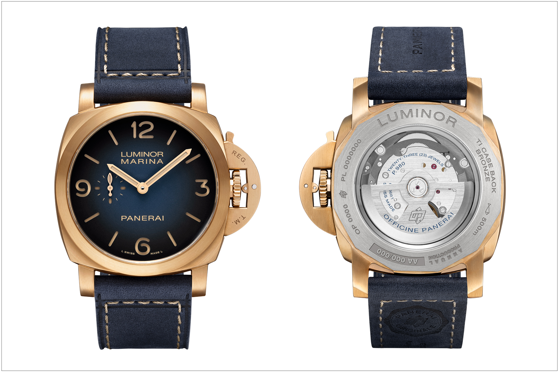 设计细节忠于 Luminor Marina 血统:标志性的护桥装置、「 三明治 」结构錶盘带来优异低光环境读时效果,以及 9 时位置的小秒针;同时,无日期、布局俐落的哑致蓝色渐变錶盘,与青铜錶壳以及米色 Super -LumiNova® 夜光涂料的温润色泽相得益彰。 从深至浅的色阶呼应 Panerai 1960 年代的美学,进一步强化此作作为工具腕錶的清晰易读特性。