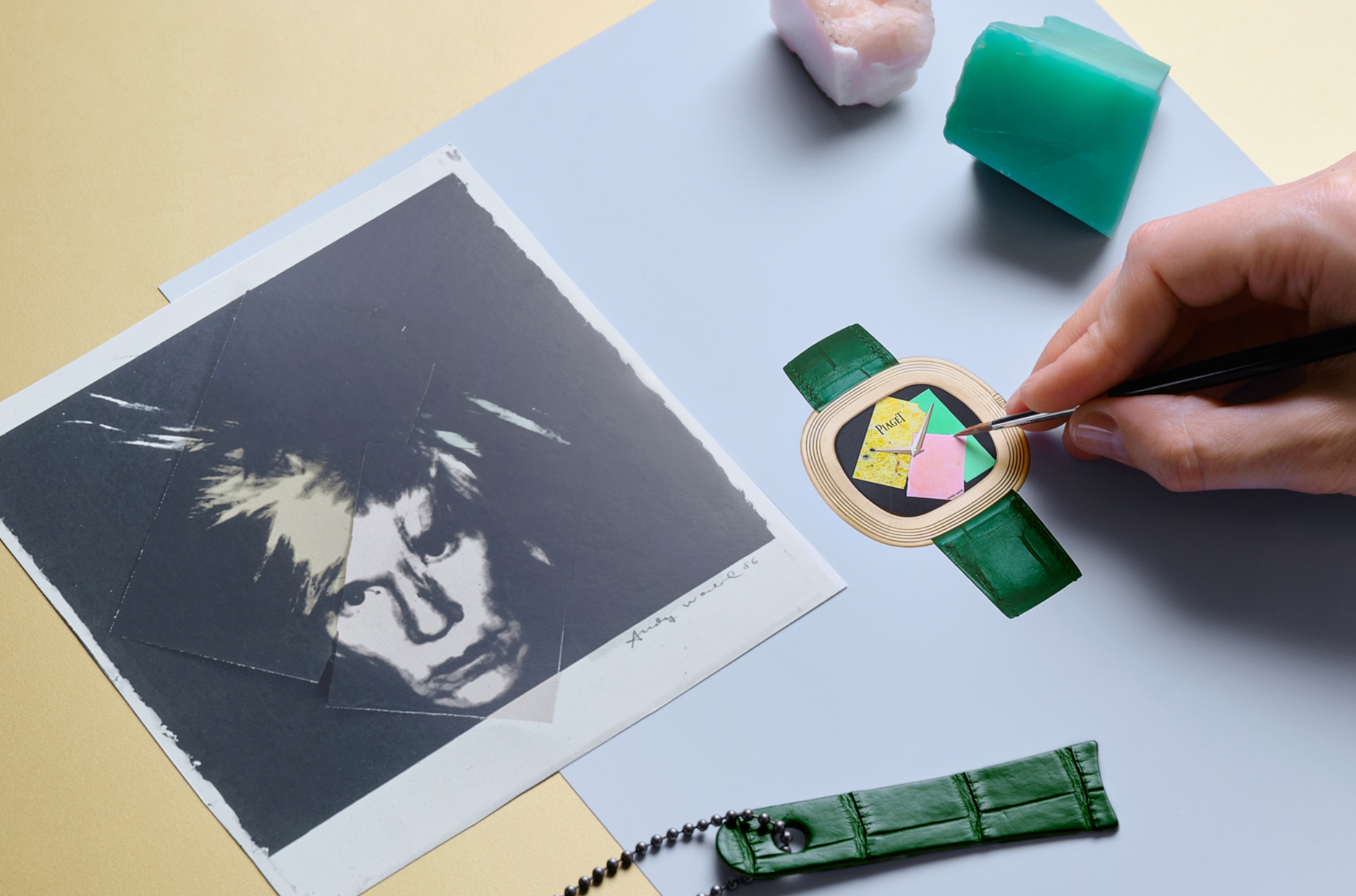 这枚拼贴錶盘以繁复的彩色宝石镶嵌工艺构筑抽象形态:以黑玛瑙为基底,向 Warhol 于 1973 年腕錶的色调致敬;其上铺陈薄片宝石,包括来自纳米比亚的黄色蛇纹石、粉红蛋白石与绿色绿玉髓。这组色彩呼应双方协作时设定的焦点, 取材自 Warhol 作品中明亮、引人注目的视觉母题。