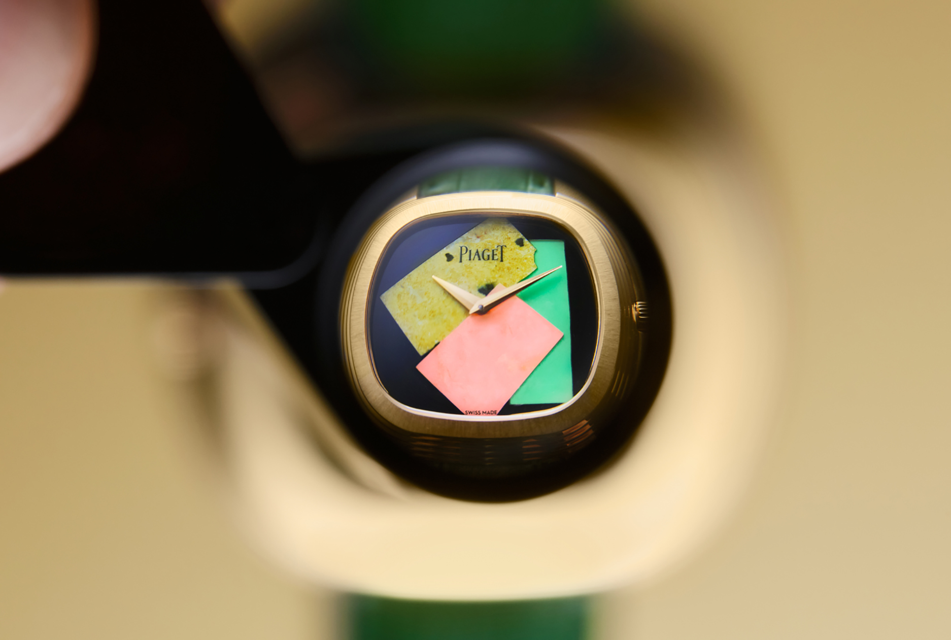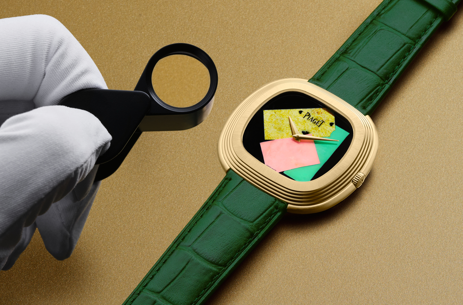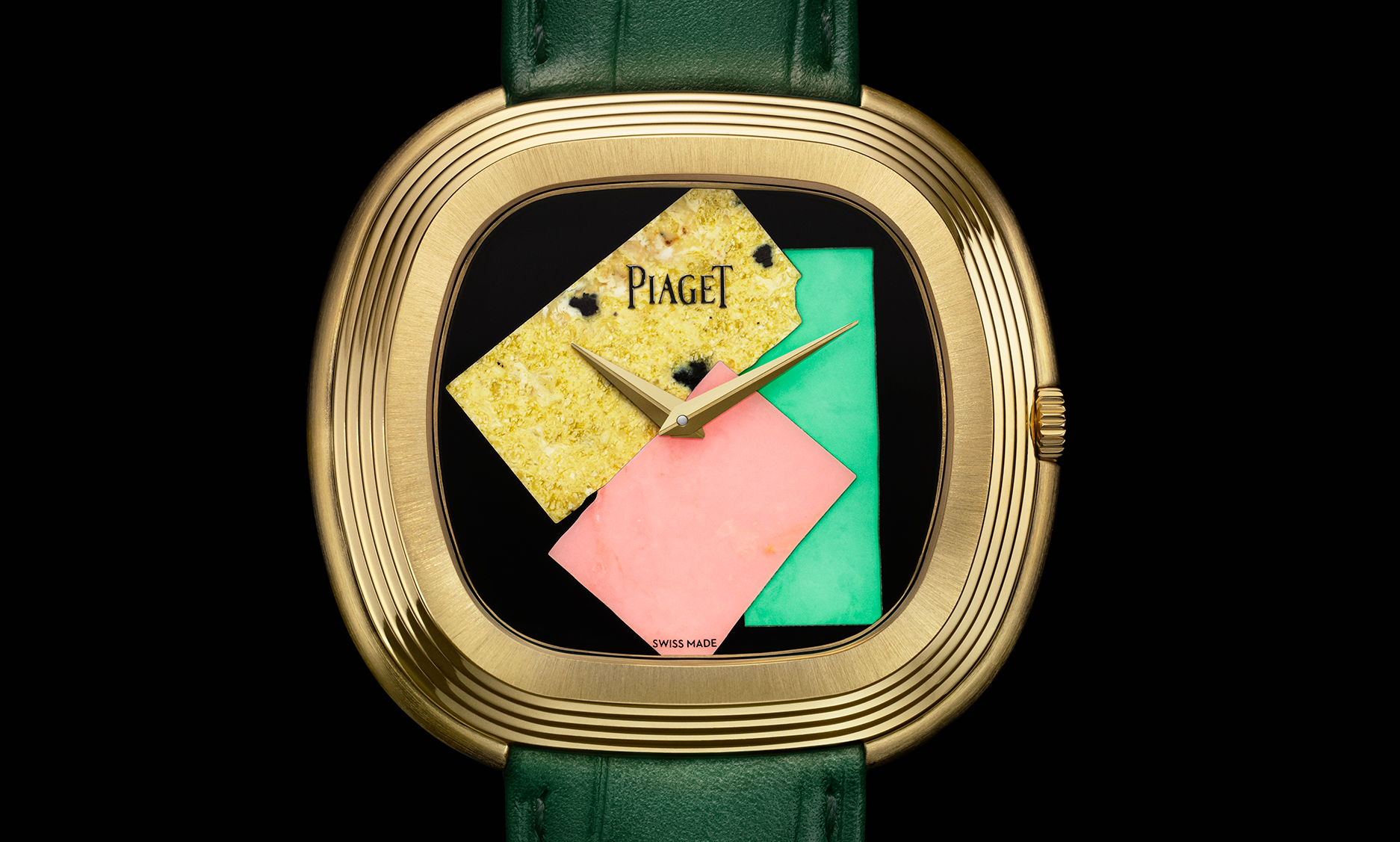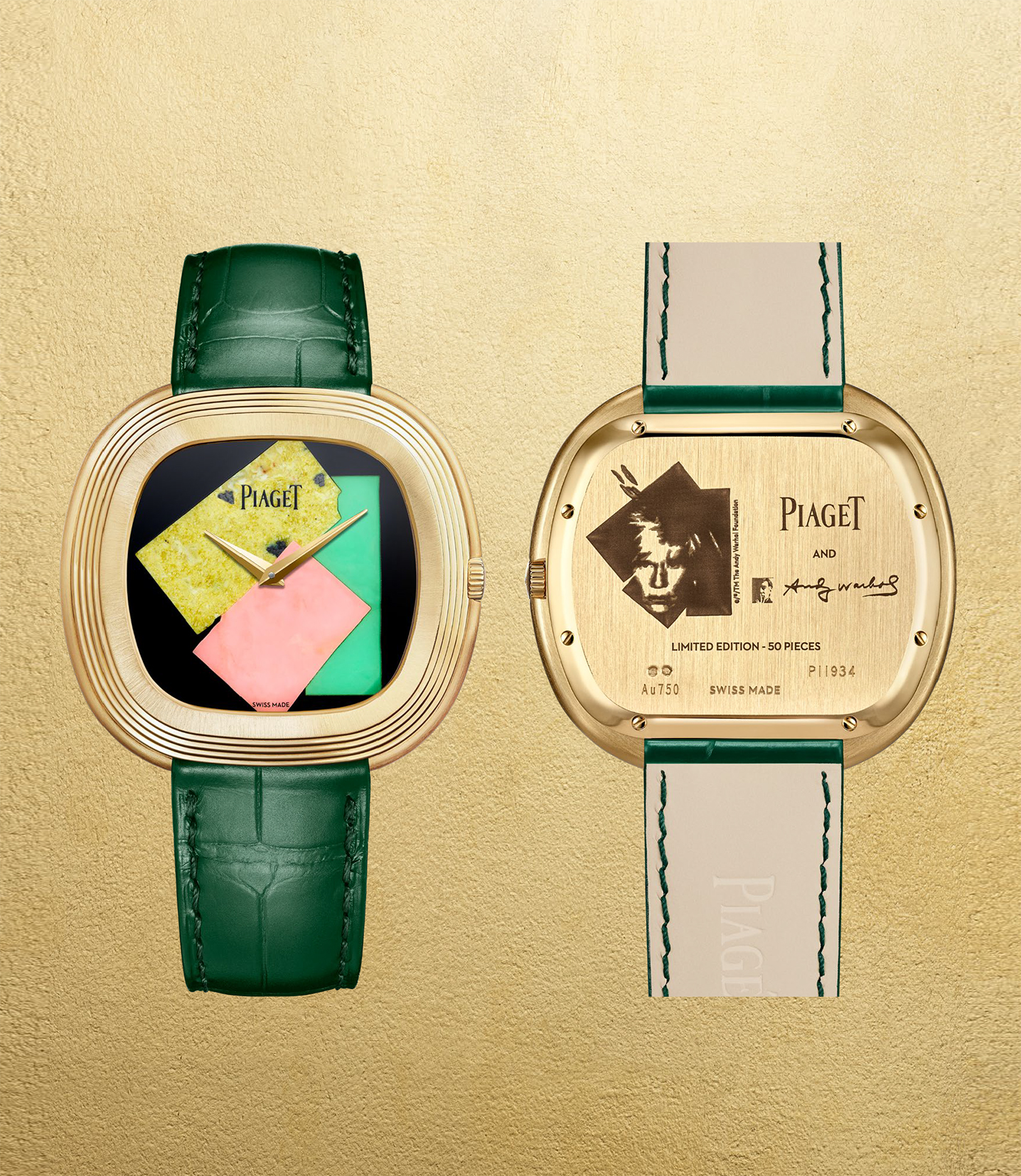 此款腕錶置于阶梯式 45 毫米 18K 黄金彩色宝石錶壳之中,搭配饰有圆环状日内瓦波纹( Côtes de Genève ), 向 Warhol 于 1973 年的枕形腕錶致敬; 搭配浓郁绿色皮革錶带,以及施以垂直发丝纹的 18K 黄金錶背。底盖采垂直缎面打磨处理,錶背镌刻启发錶盘的自画像,并刻有 PIAGET 标志与 Andy Warhol 签名,突显其鲜明的收藏意图与艺术遗产的紧密连结。