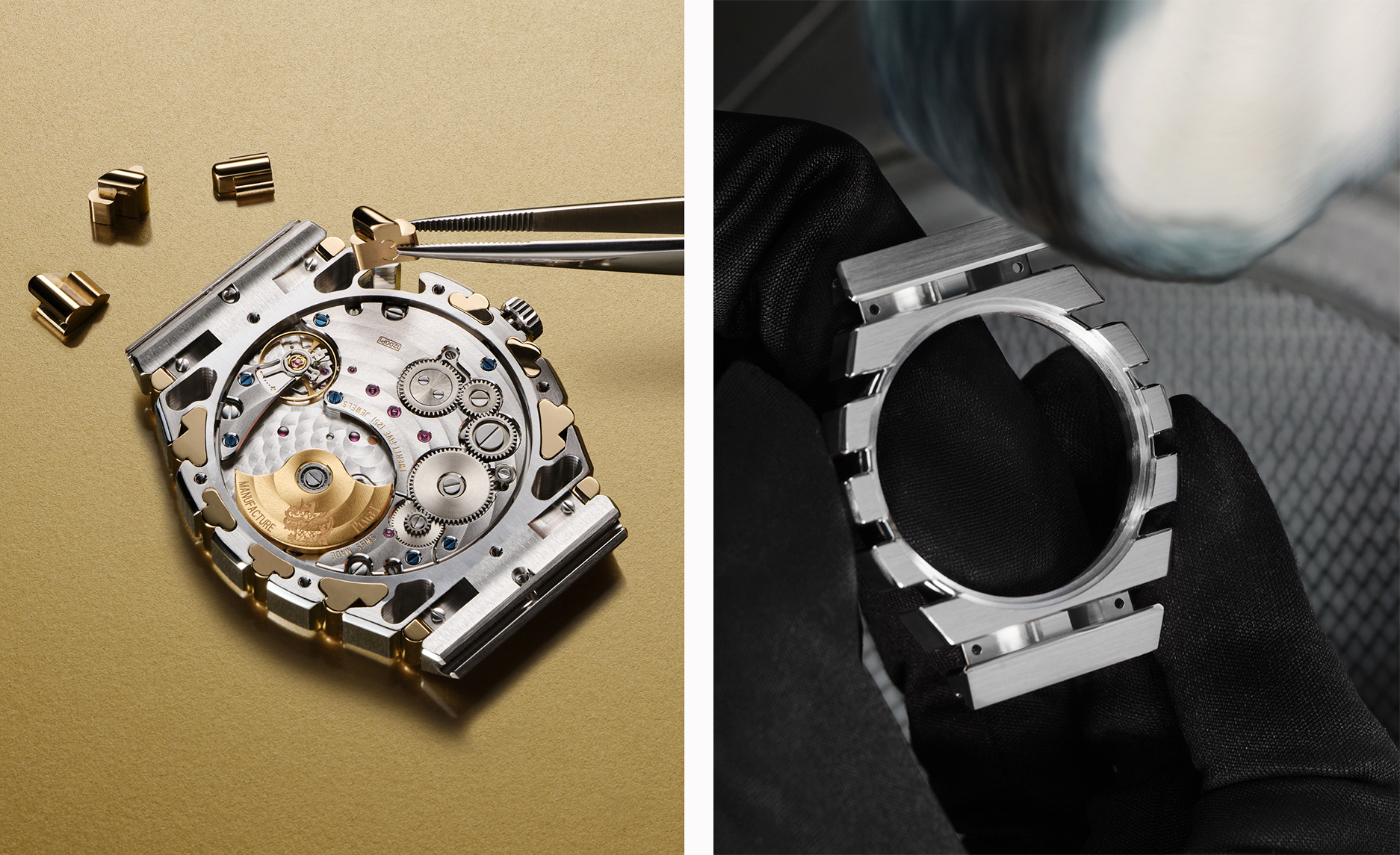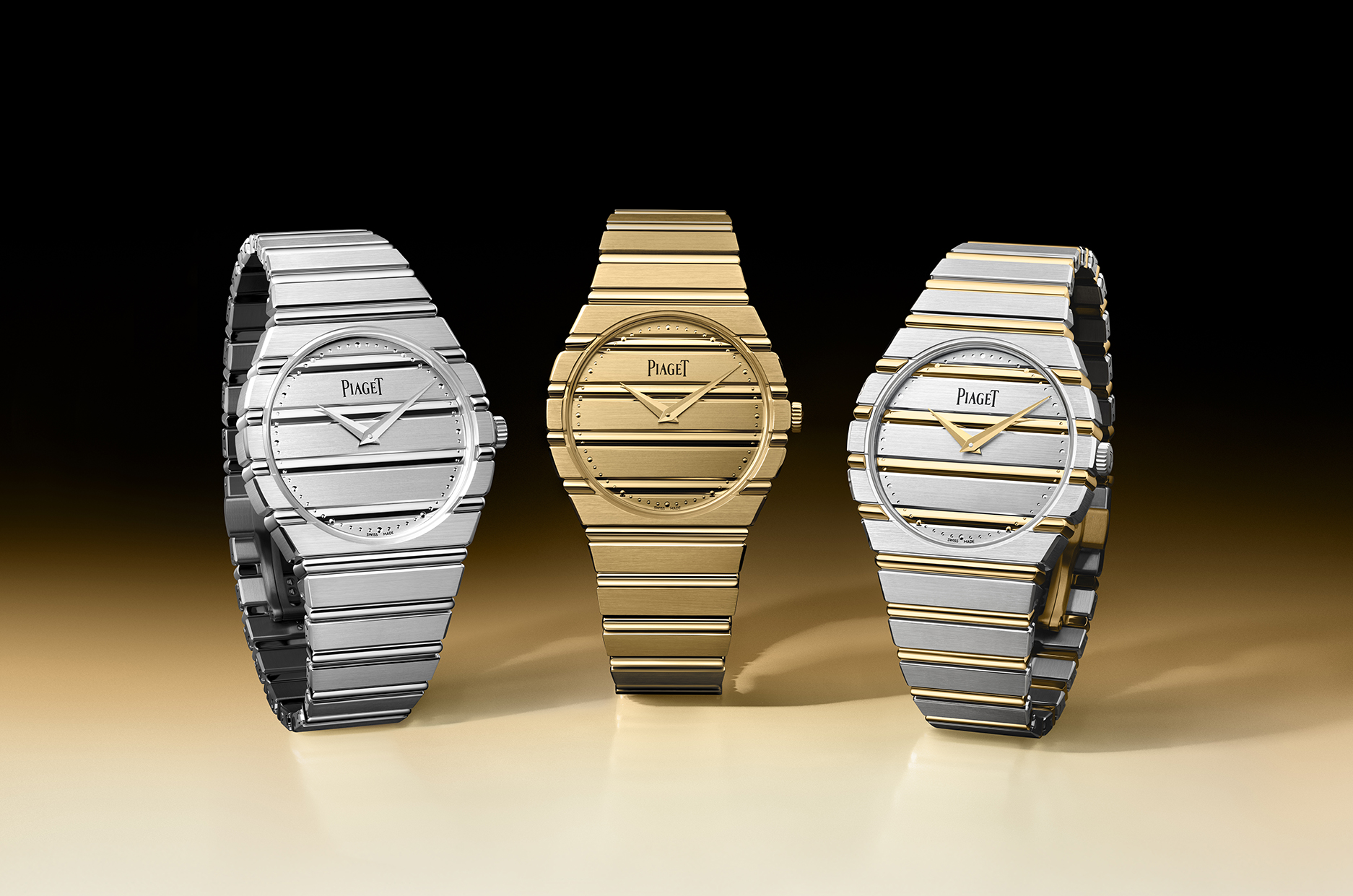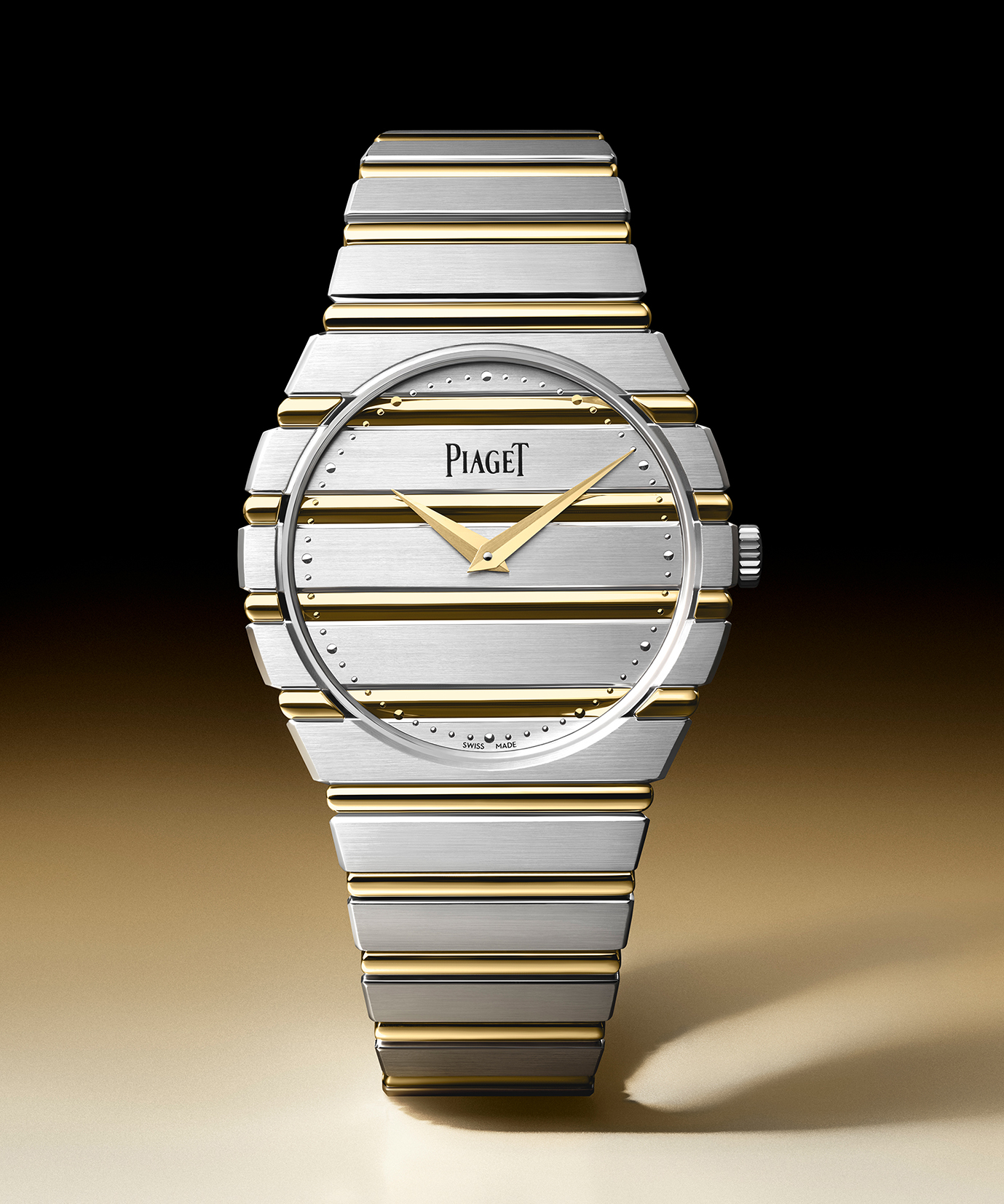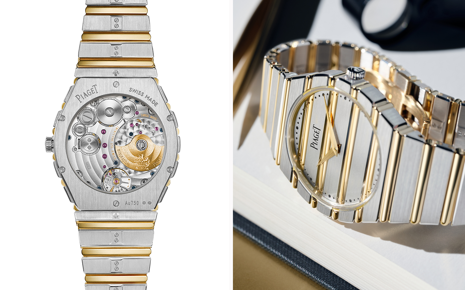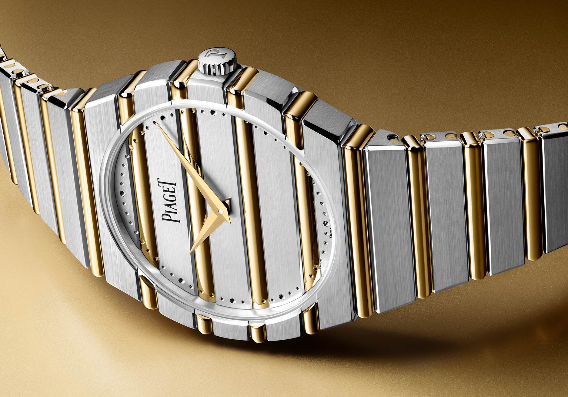 此次新作向 1979 年首度亮相时罕见的配置致敬。尽管双色金属的运用或会让人联想到当下流行的钢金组合,PIAGET 却始终坚守创立理念 ——「 时间只应以黄金衡量 」。 因此,腕錶全以贵金属铸造,配备拉丝 18K 白金一体式錶壳与鍊带,并以抛光 18K 黄金 gadroons 形成鲜明视觉焦点。