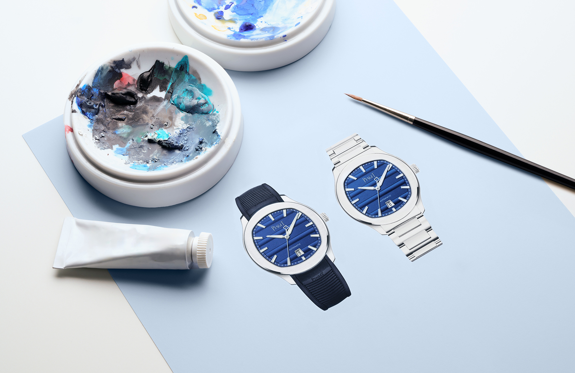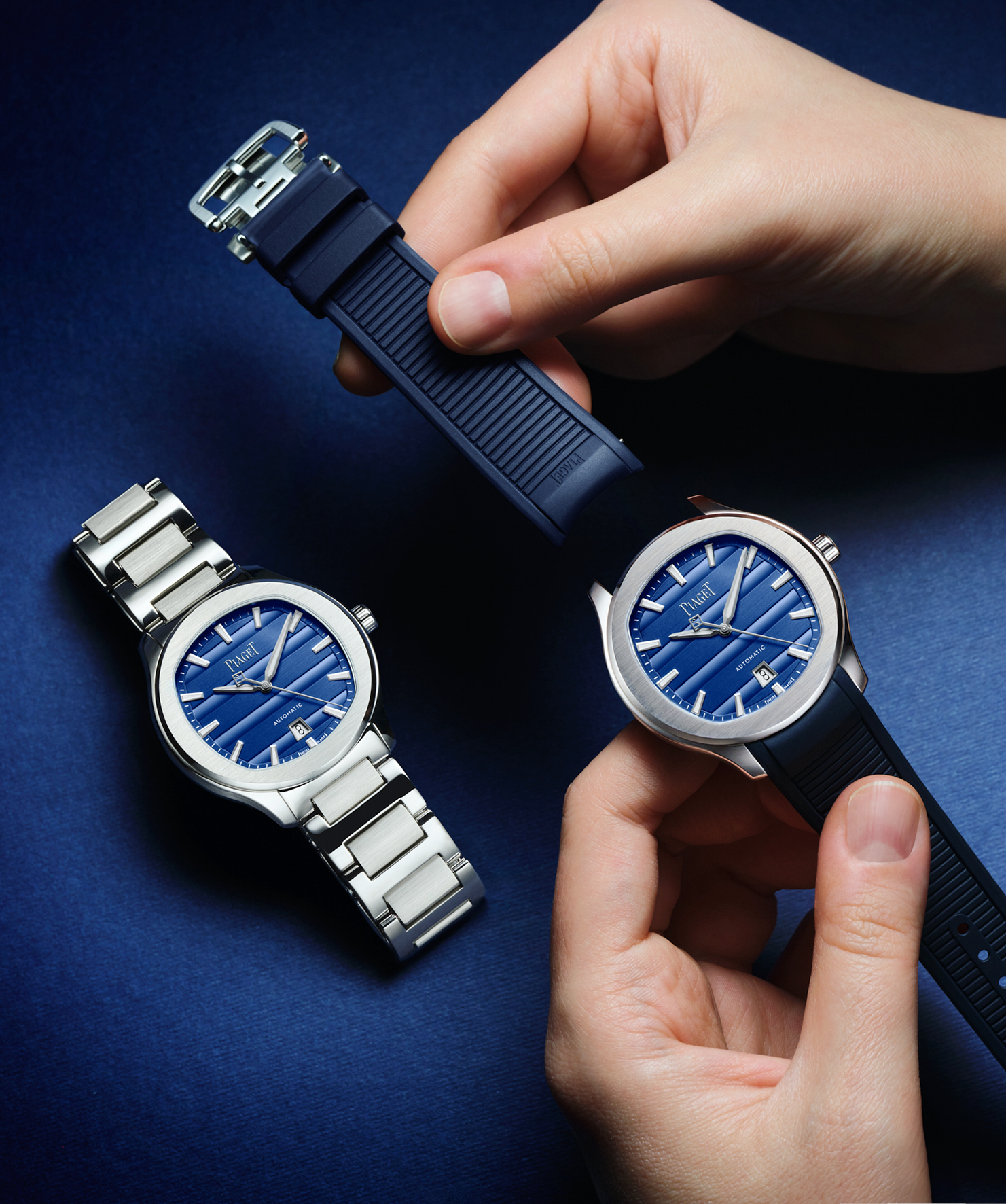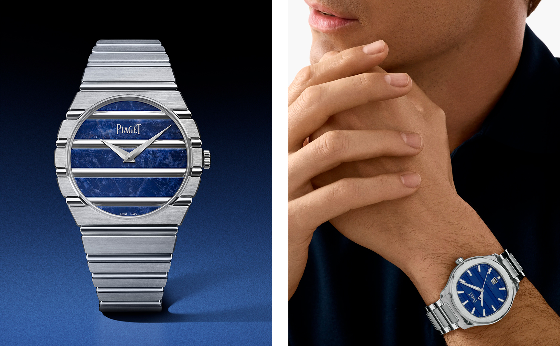 如果说 Signature 是现代进化,那 Polo 79 则是向装饰性宝石工艺的极致致敬。 PIAGET 身为首个将硬石面盘引入制錶领域的先驱,今年惊喜地在 Polo 79 当代系列中,首度换上了「 方钠石 」( Sodalite )面盘。方钠石那如深海般幽邃且不规则的天然纹理,与规律排布的横向圆模条纹形成极具冲击力的美感,让原本就充满建筑结构感的錶盘更显深不可测。