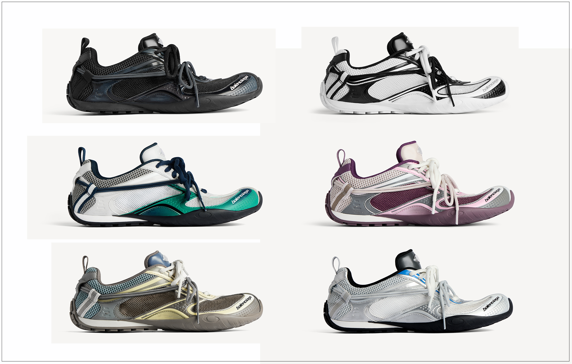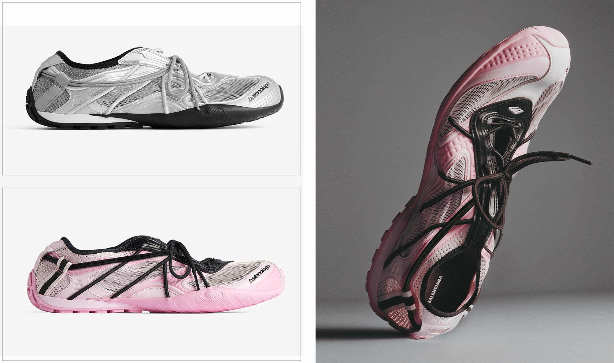 配色方面从黑灰等冷静灰度,到紫色、粉色、白色等更具表现力的选择,再到银蓝渐变混搭 — 皆呈现顺滑、轻盈的光感效果。如果基础款还不足以让你彻底上头,那么 “ Sneakerina ” 版本一定会拿下你。 RADAR 在原本流线感十足的球鞋之上再度瘦身,让整双鞋更趋近芭蕾舞鞋般的纤细轮廓,却保留了运动鞋的律动张力。 Balenciaga Radar Sneaker. 现已登陆 Balenciaga  官网 及指定门店发售。