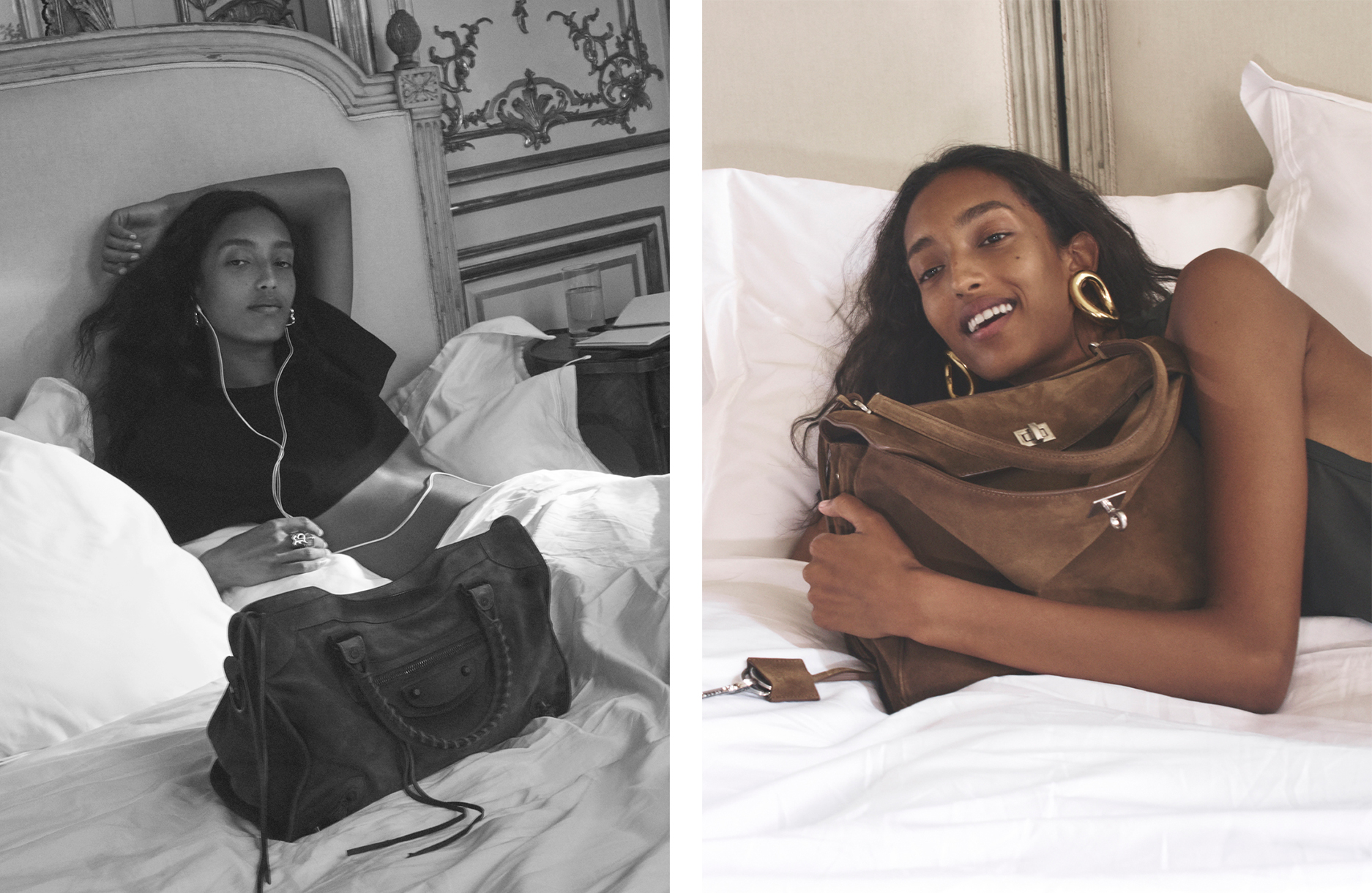 两位模特儿 Mona Tougaard 与 Sandra Murray 的肢体语言更进一步展现了 Pierpaolo Piccioli 执掌品牌创意大权后的全新去向:她们身穿轻便、躺卧在柔软白色床单上,有时眼神望向远方、有时提取著手上包款 凝神注视:一种游走在青春外放与克制、精致与随性间的静谧,同时包款并强化了 BALENCIAGA 两大招牌设计: Le City 机车包与以加州罗迪欧大道为名的 Rodeo。