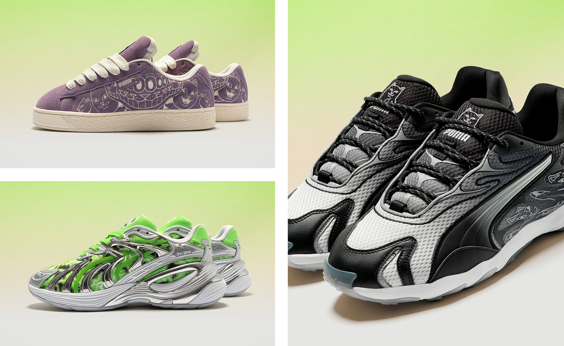 鞋款方面,焦点落在经典 1968 年 PUMA Suede 的升级版 Suede XL。 今次 RIPNDIP 特别版本在鞋面印上迷幻的 Nermal 图案,更暗藏鞋舌内置的秘密口袋,鞋身以低调 tape 色调呈现。另一焦点鞋款包括以黑色渐变设计的Inhale, 以及绿色与熔银拼凑出的 Inverse,两双鞋都隐藏著 Lord Nermal 的惊喜身影,等待大家发掘。 PUMA x RIPNDIP 最新联名系列售价马币从 RM229 至 RM669 不等,可在 PUMA.com 和 PUMA 商店购买。