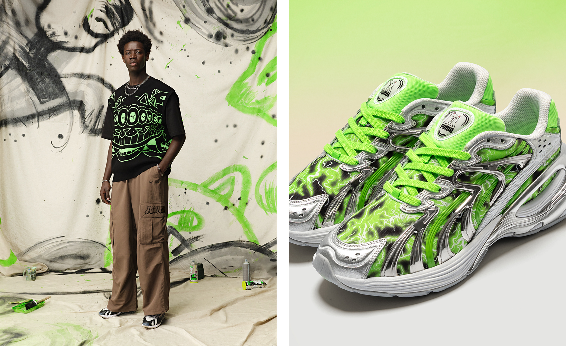 PUMA X RIPNDIP 联名系列环绕萤光绿、经典黑、叛逆紫三大主色,延伸推出三款经典鞋款,复古 INHALE、翻转设计的 INVERSE,以及板鞋经典 SUEDE XL,鞋舌处压印上中指猫经典的中指恶趣味图样,每一步都踩出骨子里的不羁 DNA。 新系列以夸张图案与戏谑元素为核心,涵盖宽松版型的必备服饰、 cut and sew 单品,以及多款鞋款。系列中最瞩目的设计,正是 PUMA 招牌跳豹与 Lord Nermal 的跨界恶搞图像,贯穿整个系列。从T恤、连帽卫衣、 Oversize 长裤,以至棒球帽,都能见到二者的恶趣味结合。 另有充满迷幻效果的绿黑万花筒图案,点缀在针织背心及可反转头帽上,恶趣味让穿搭更经典,化身自由不羁的叛逆态度。。