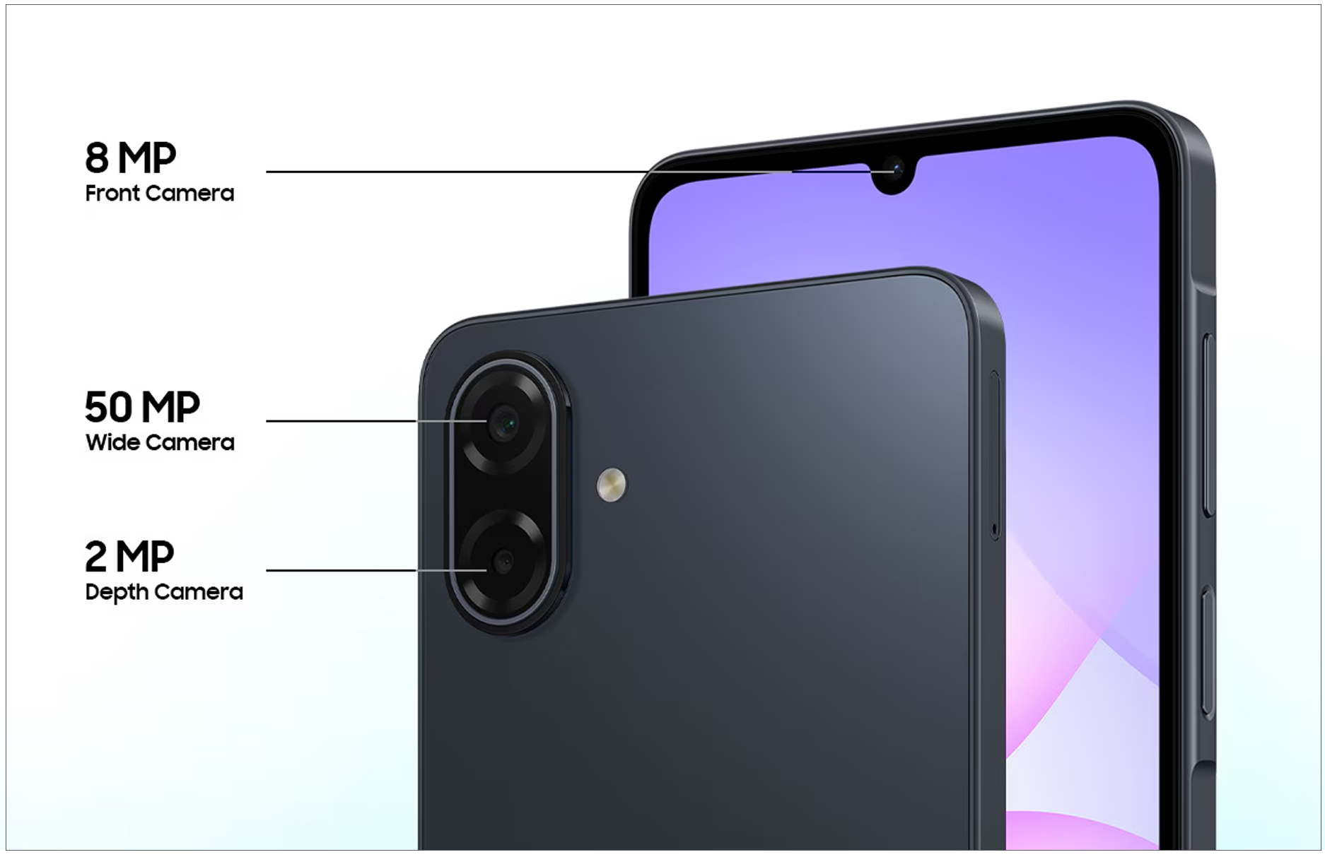 镜头部分, Galaxy A07 5G 配备 5000 万画素主镜头、 200 万画素景深镜头,外出拍风景或捕捉与朋友的互动,都能拍出清晰自然的照片;前置镜头为 800 万画素自拍镜头,内建多种滤镜与美肌模式,让自拍都能完美上镜。