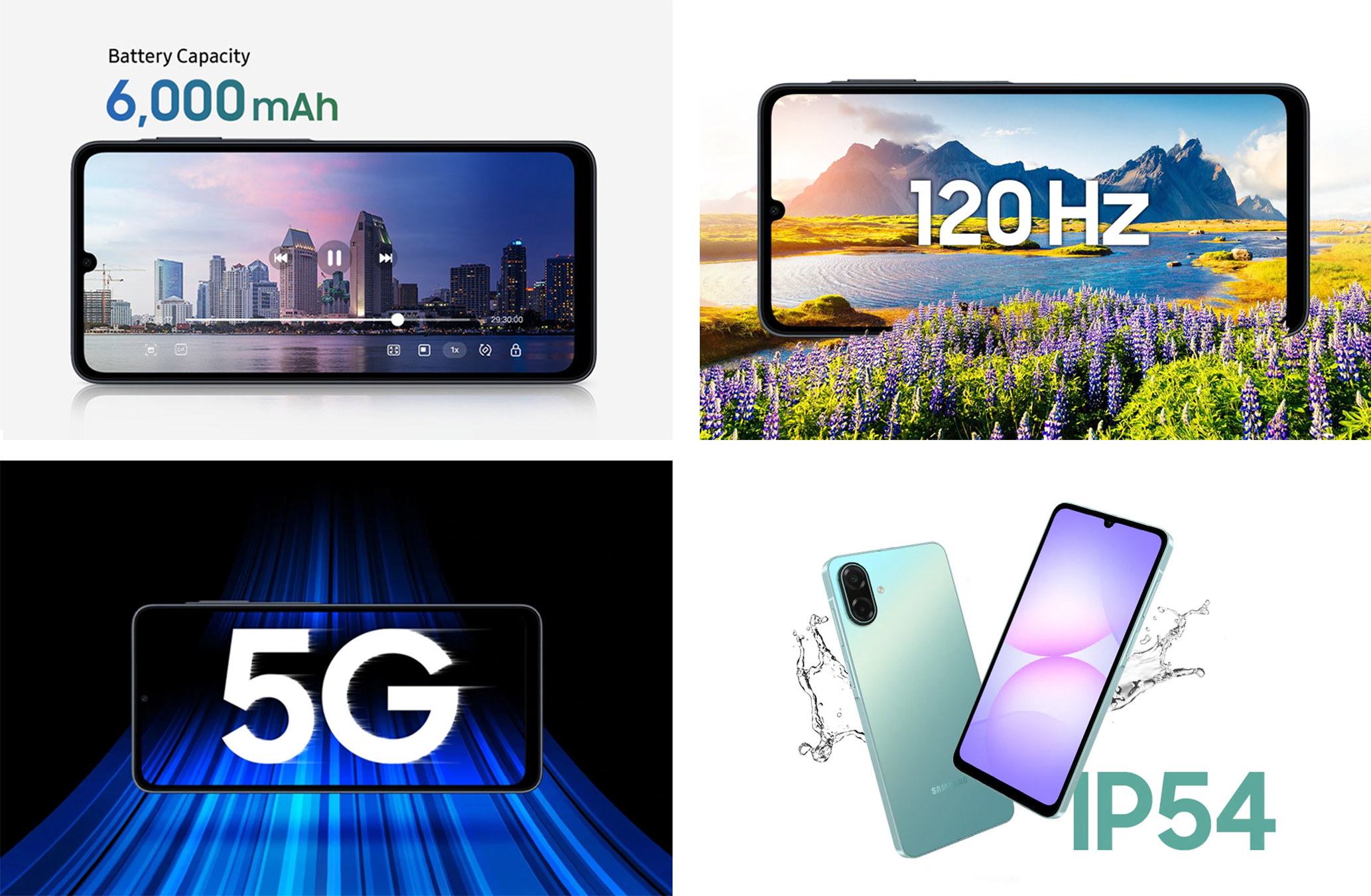 Galaxy A07 5G 搭载 6.7 吋大萤幕、 120Hz 萤幕更新率,在浏览社群平台贴文、观看影音,不仅流畅、也能享有宽阔舒适的视觉感受; Galaxy A07 5G 萤幕为 Corning Gorilla Glass 5、支援 IP54 防尘防水,提升耐用性。